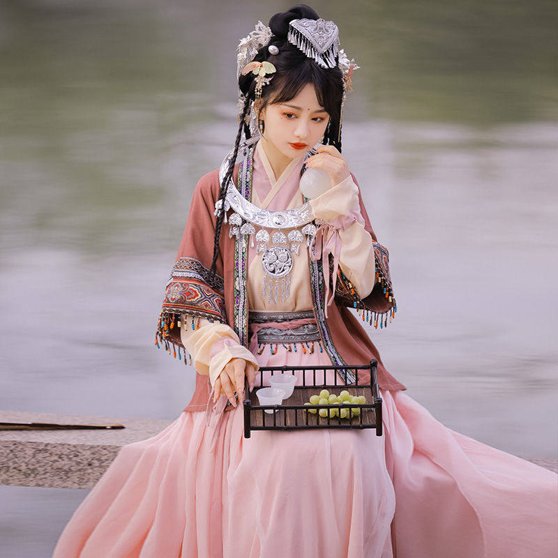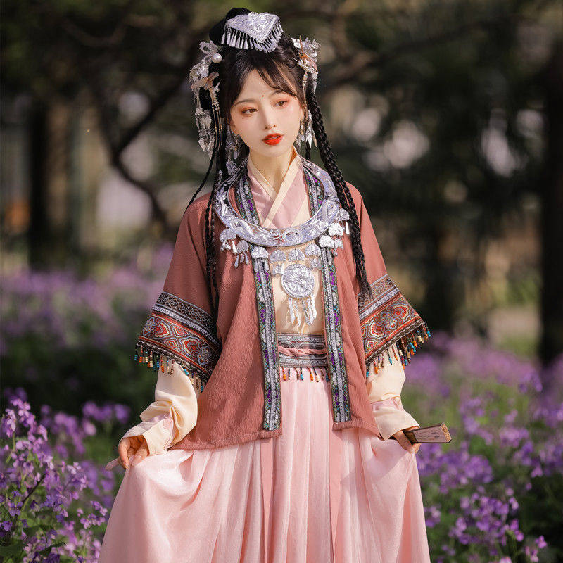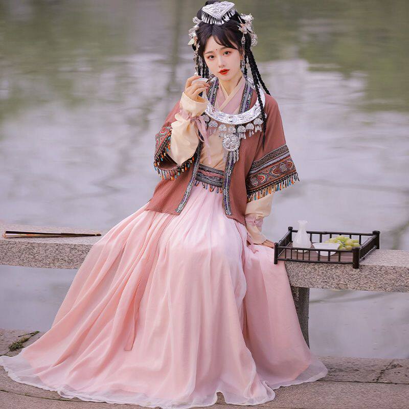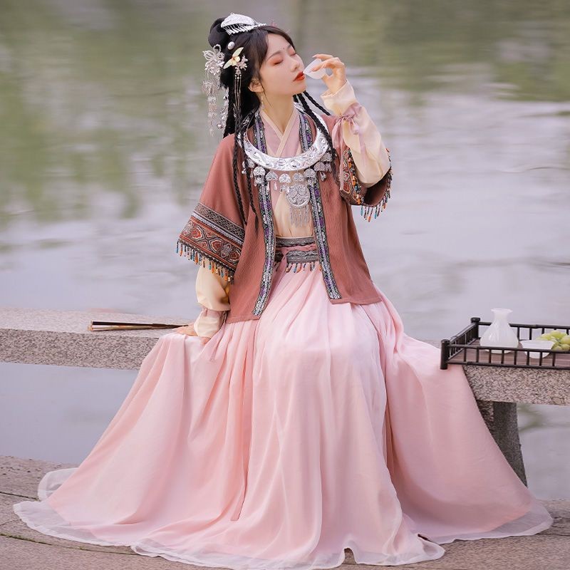 Han Yannujiao 성인 여성 Hanfu 여성 노래 제작 하프 슬리브 플리츠 스커트 여성 에스닉 스타일 봄과 여름