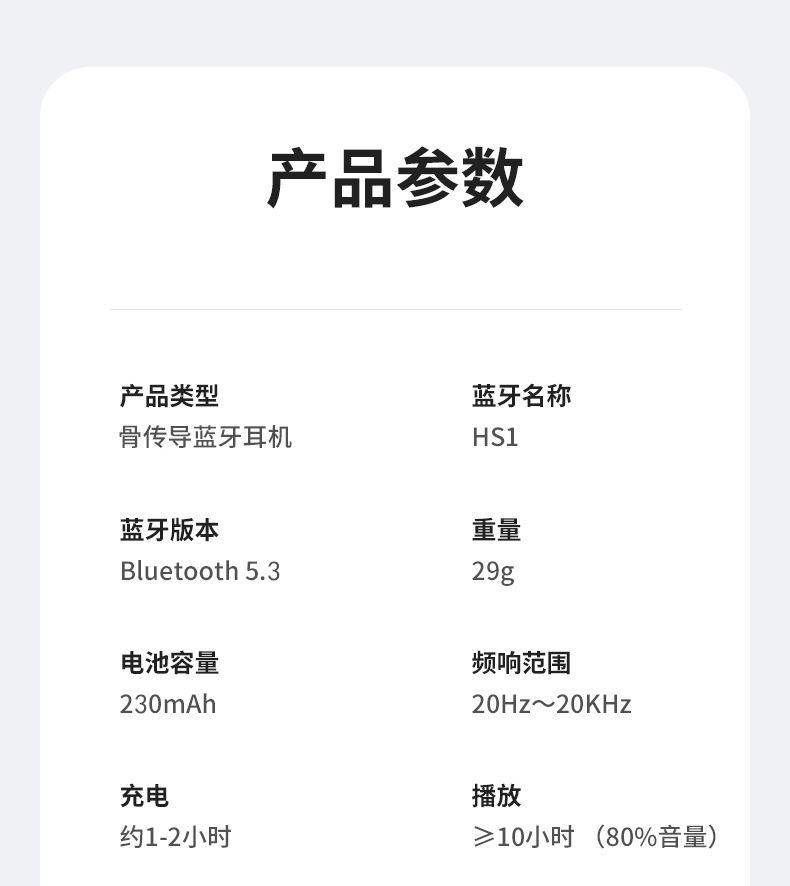 7.连续播放时间:HS1&2使用50%音量约10小时,HS3使用50%音量约20小时;