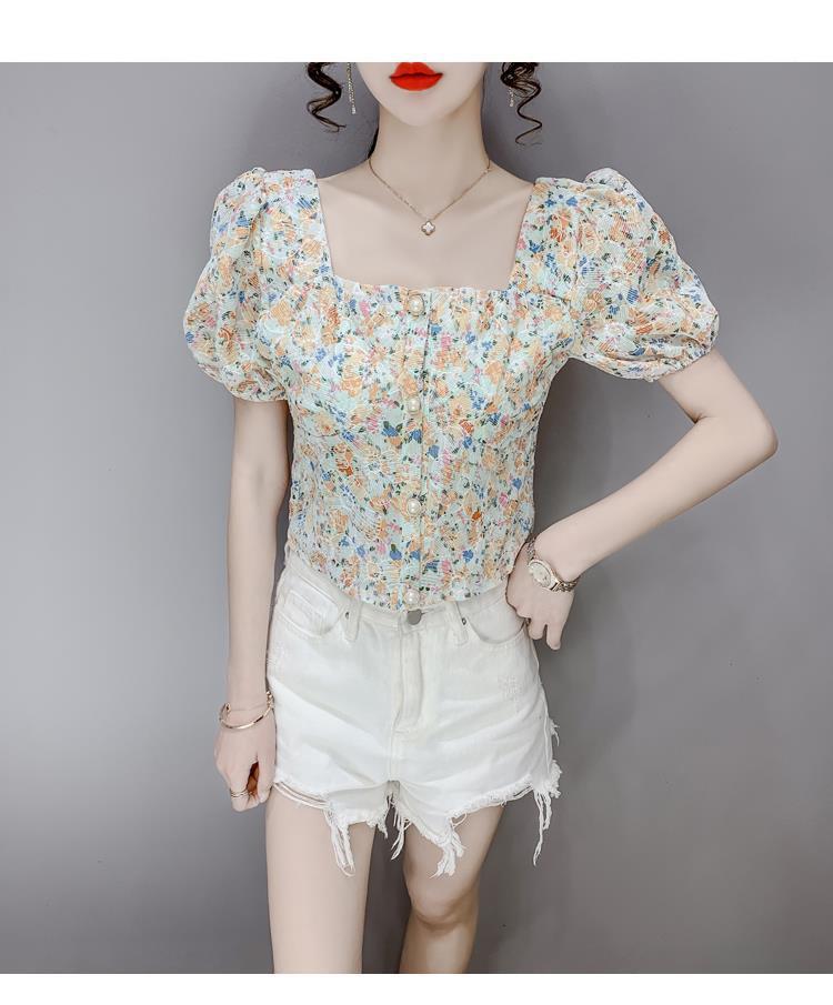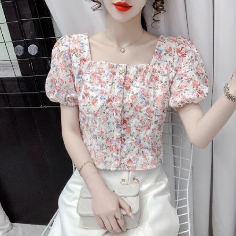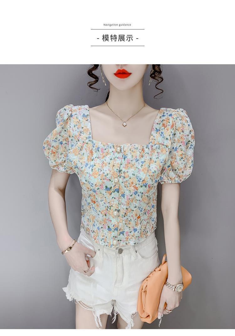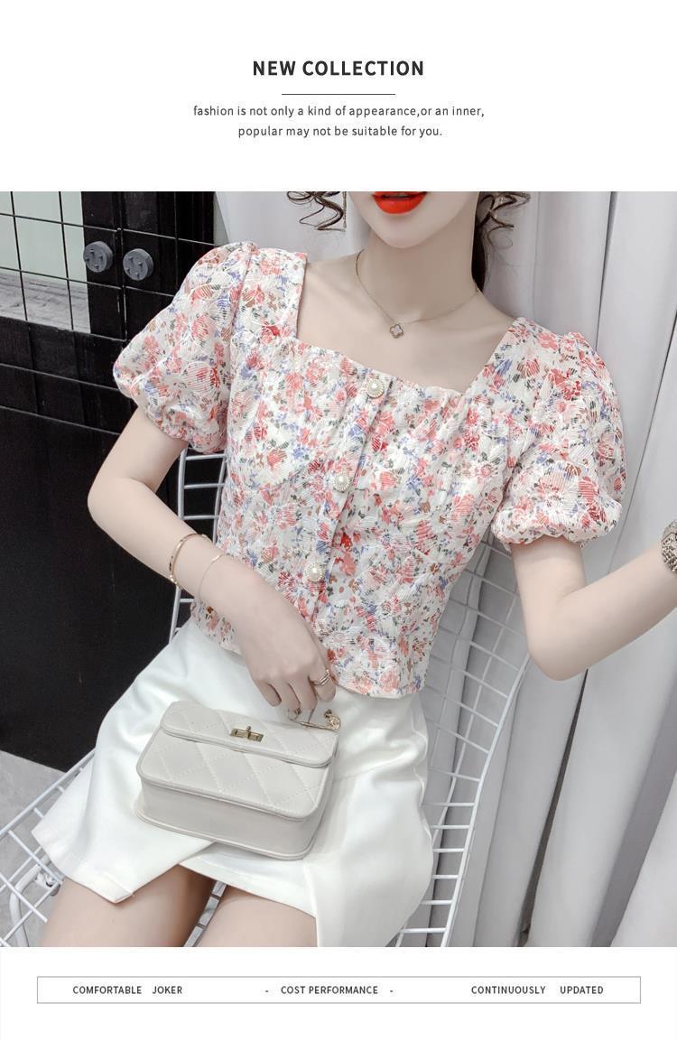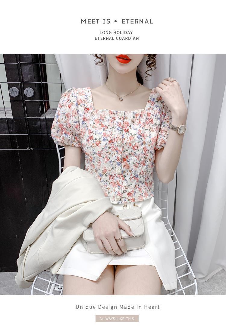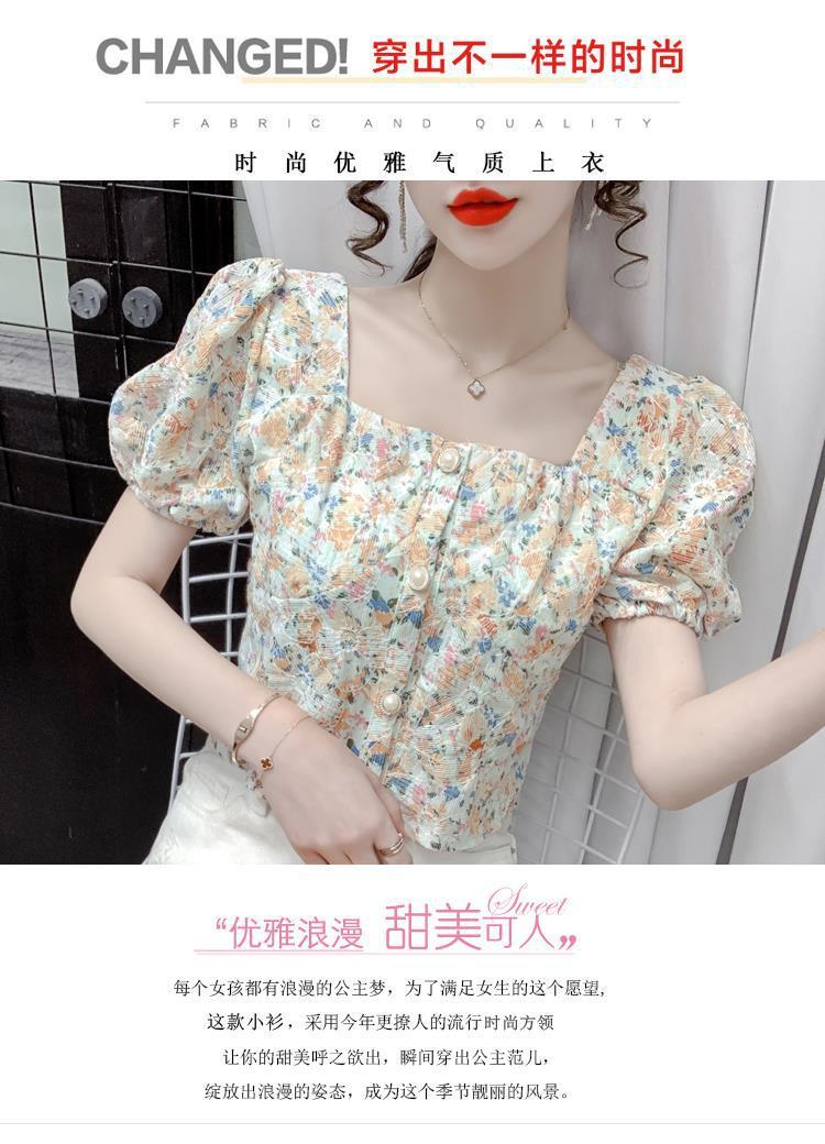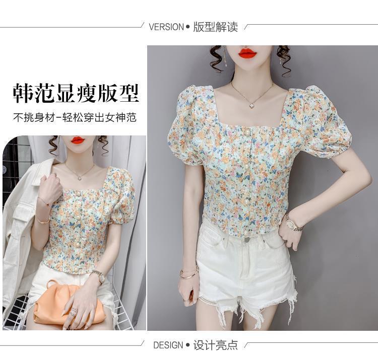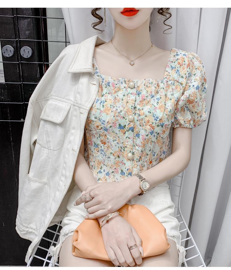 프렌치 스퀘어 칼라 반팔 꽃무늬 쉬폰 셔츠 여성용 디자인 틈새 여름 2023 새로운 퍼프 슬리브 짧은 탑