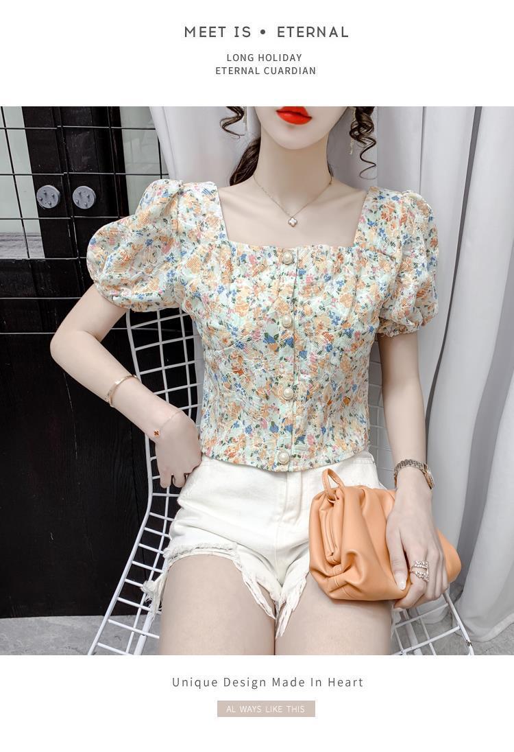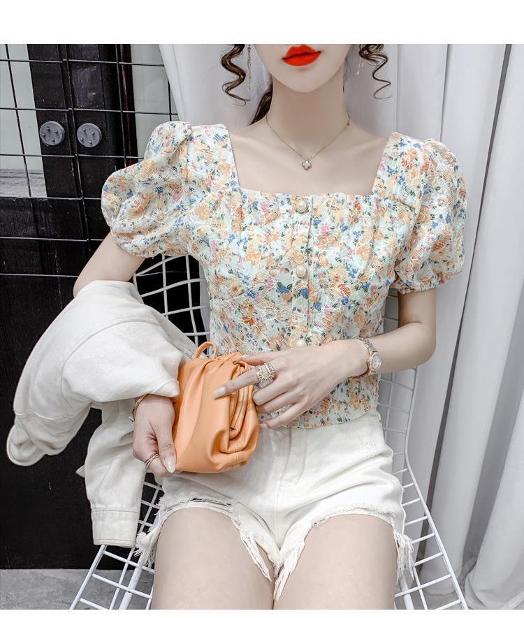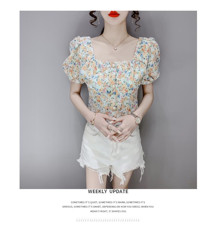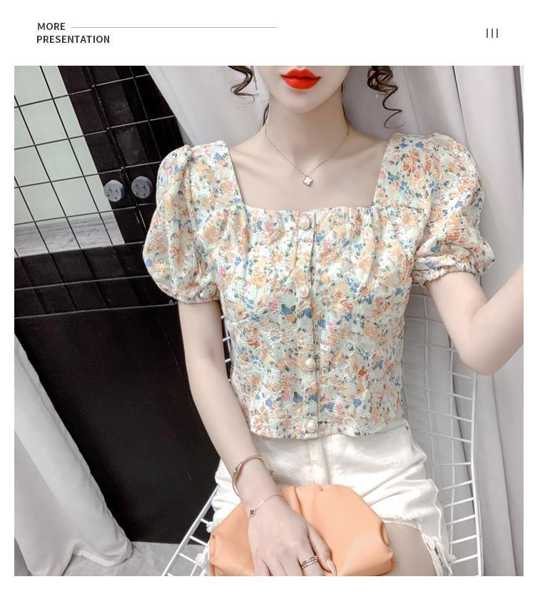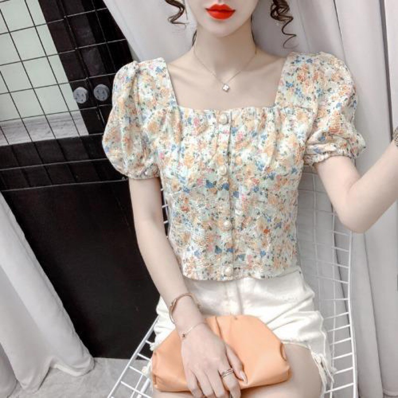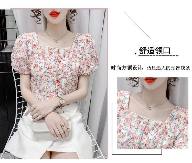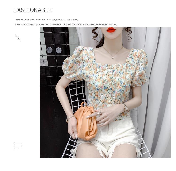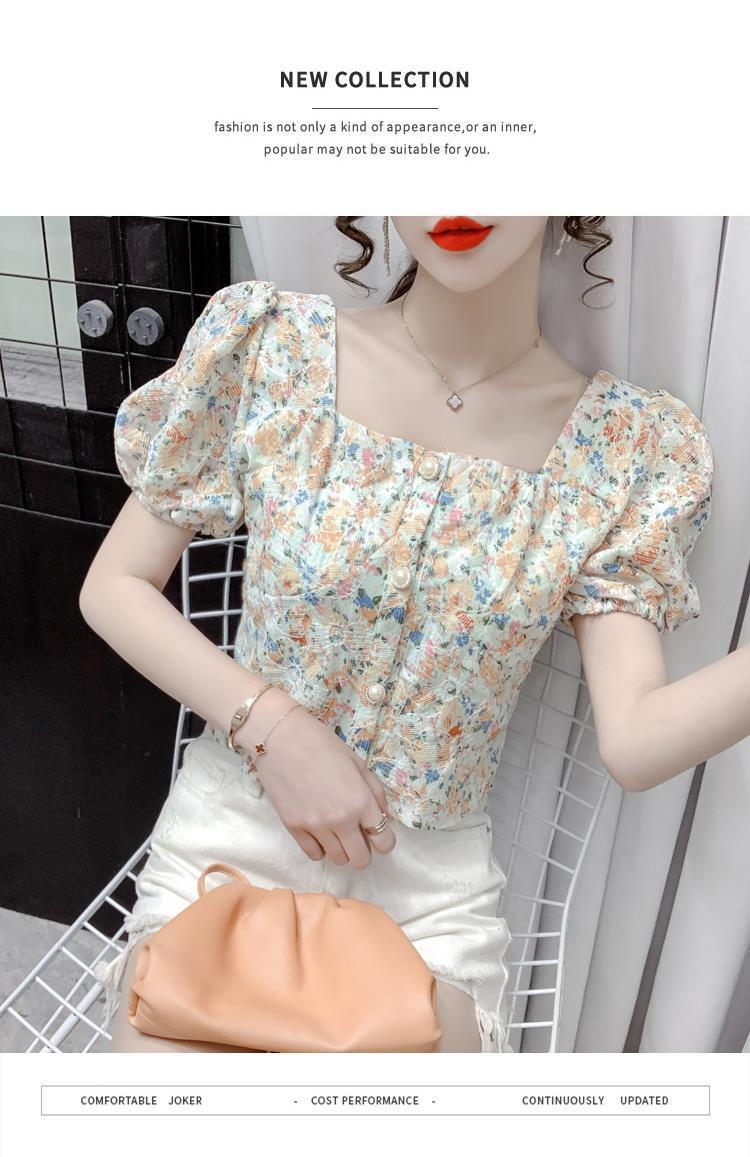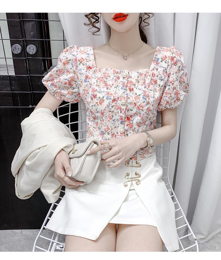 프렌치 스퀘어 칼라 반팔 꽃무늬 쉬폰 셔츠 여성용 디자인 틈새 여름 2023 새로운 퍼프 슬리브 짧은 탑
