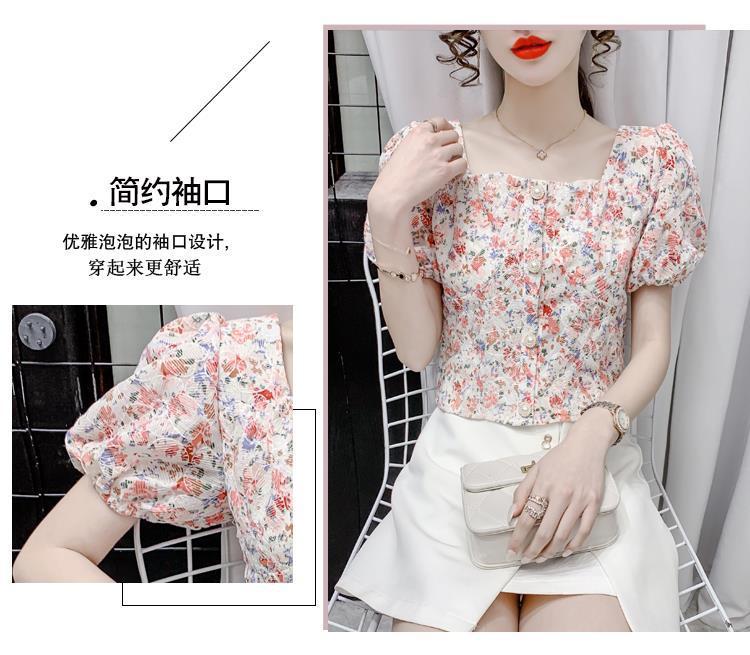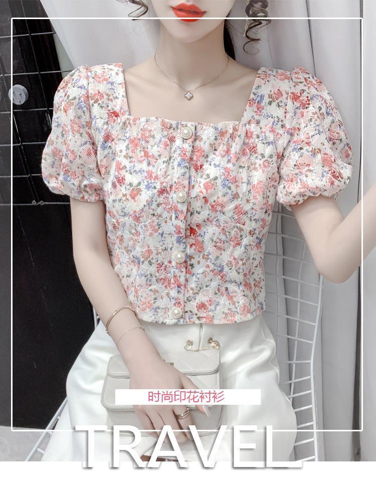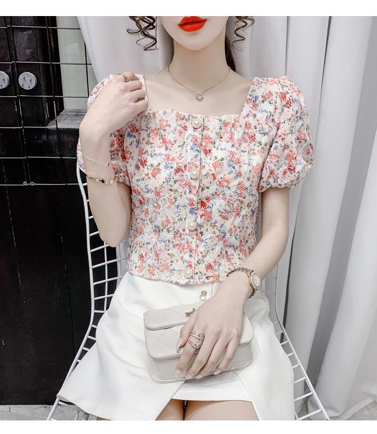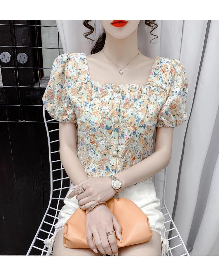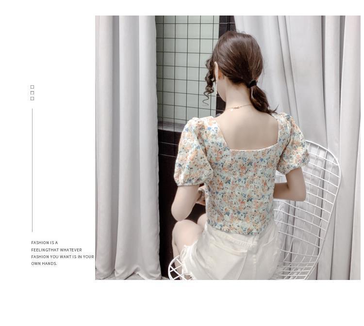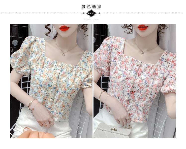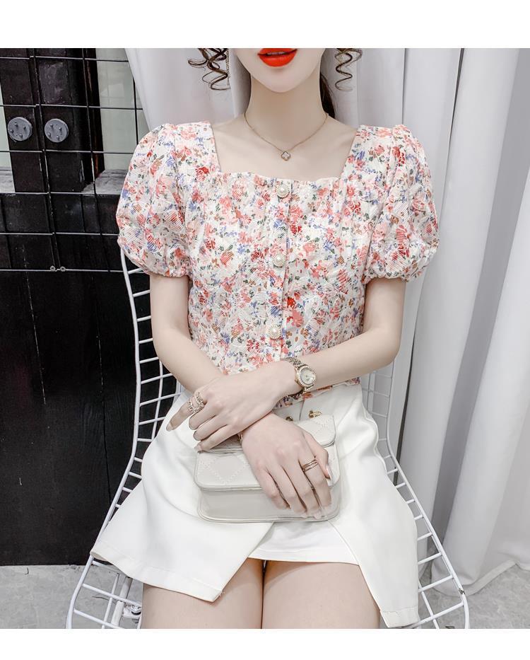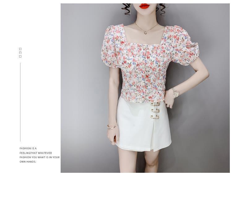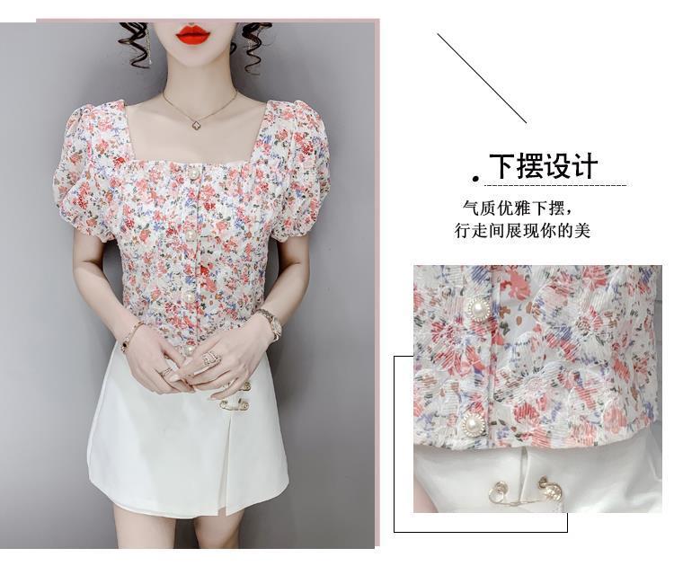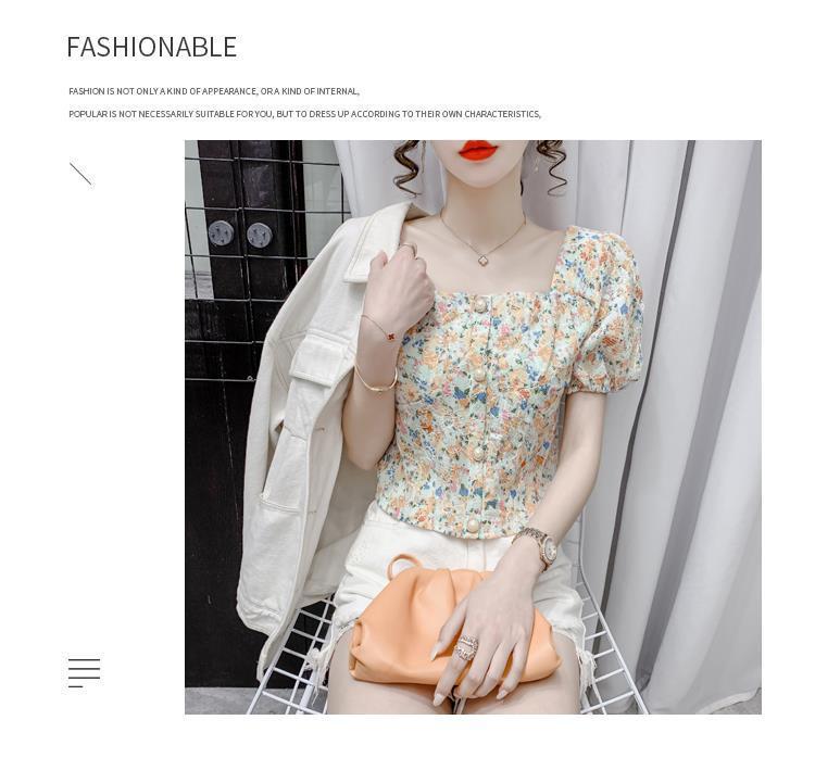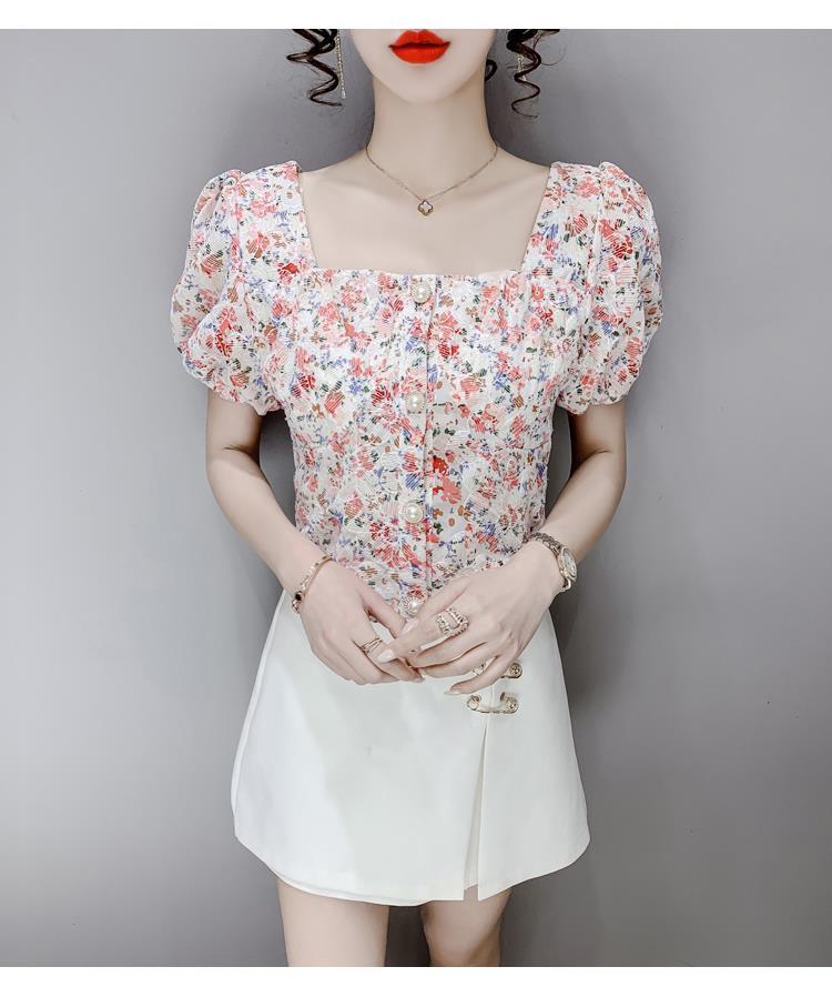 프렌치 스퀘어 칼라 반팔 꽃무늬 쉬폰 셔츠 여성용 디자인 틈새 여름 2023 새로운 퍼프 슬리브 짧은 탑