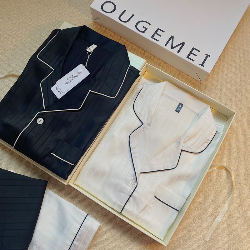 개인 자수 커플 잠옷 여자의 여름 얼음 실크 긴 소매 줄무늬 세트 봄과 가을 플러스 사이즈 남자의 가정 의류스토어 가기