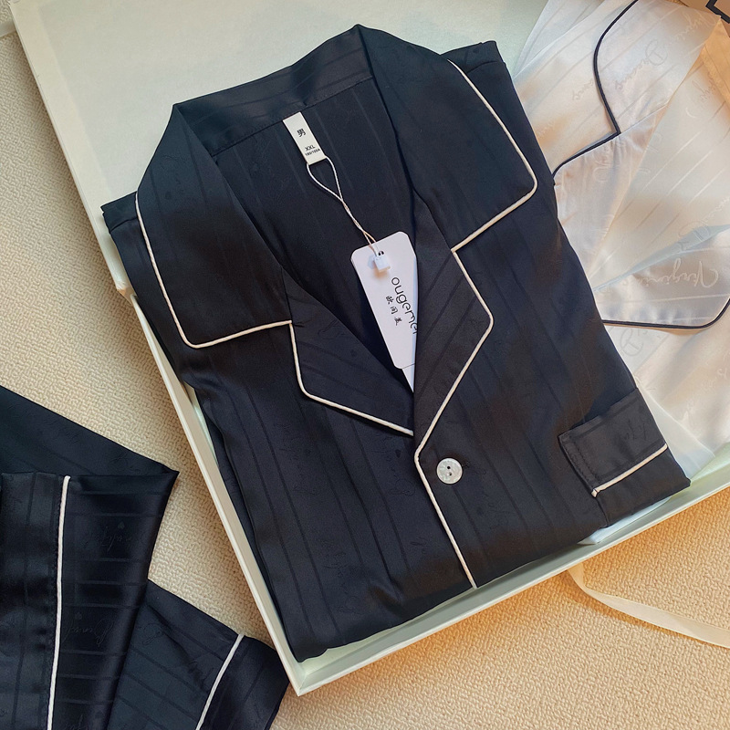 개인 자수 커플 잠옷 여자의 여름 얼음 실크 긴 소매 줄무늬 세트 봄과 가을 플러스 사이즈 남자의 가정 의류