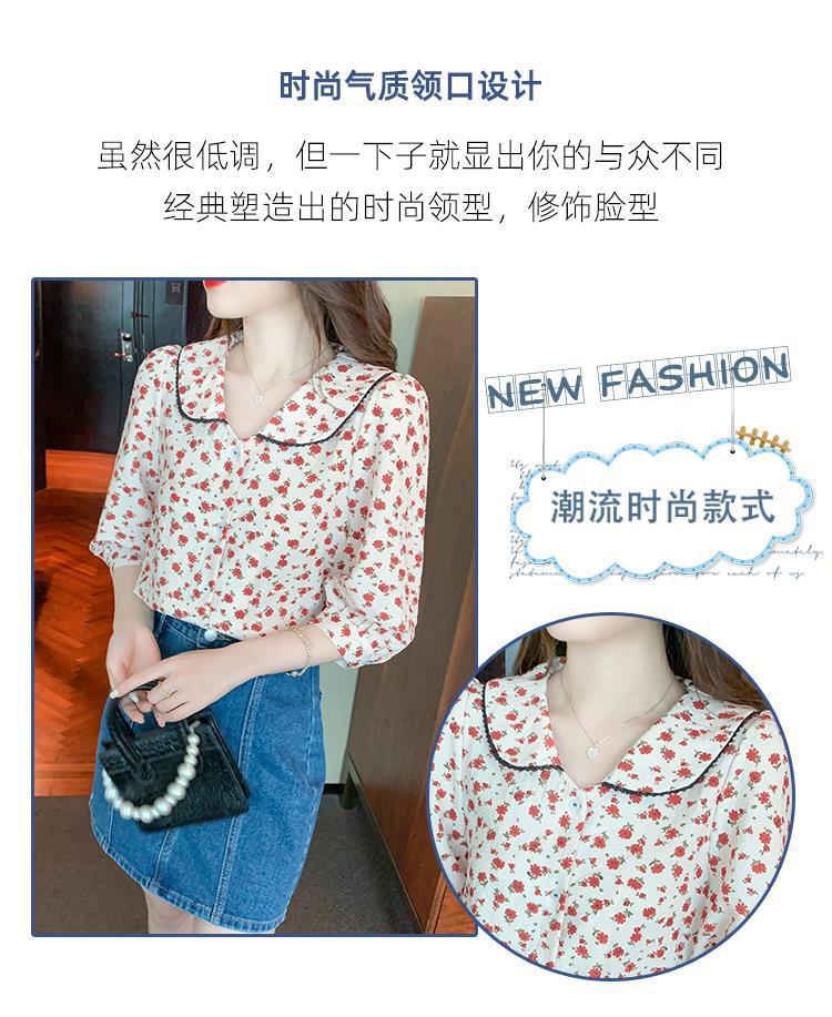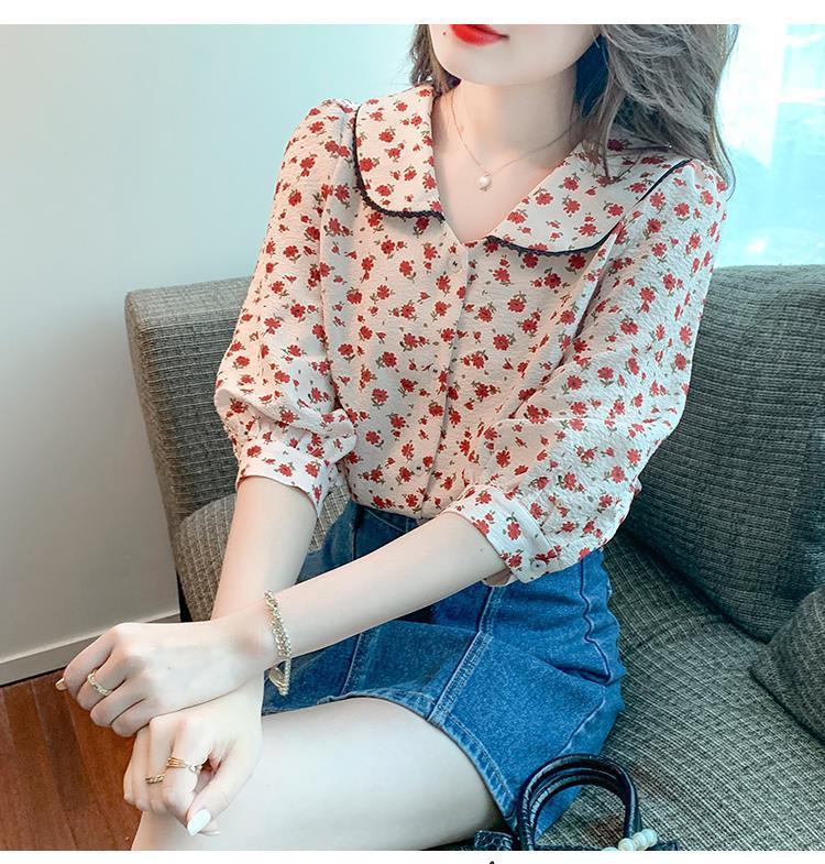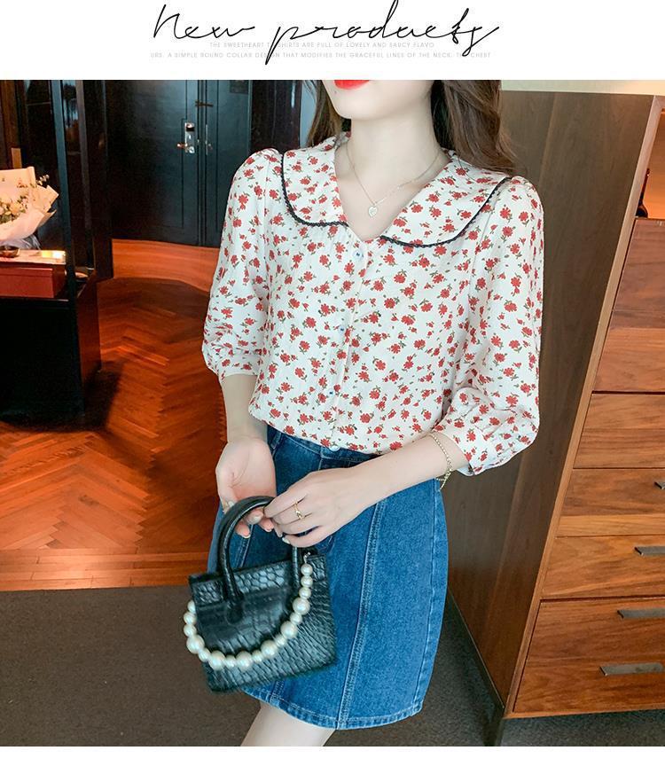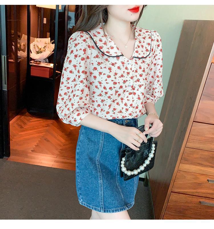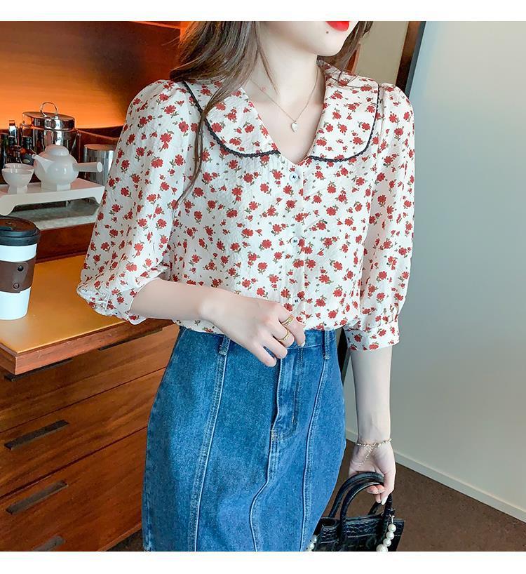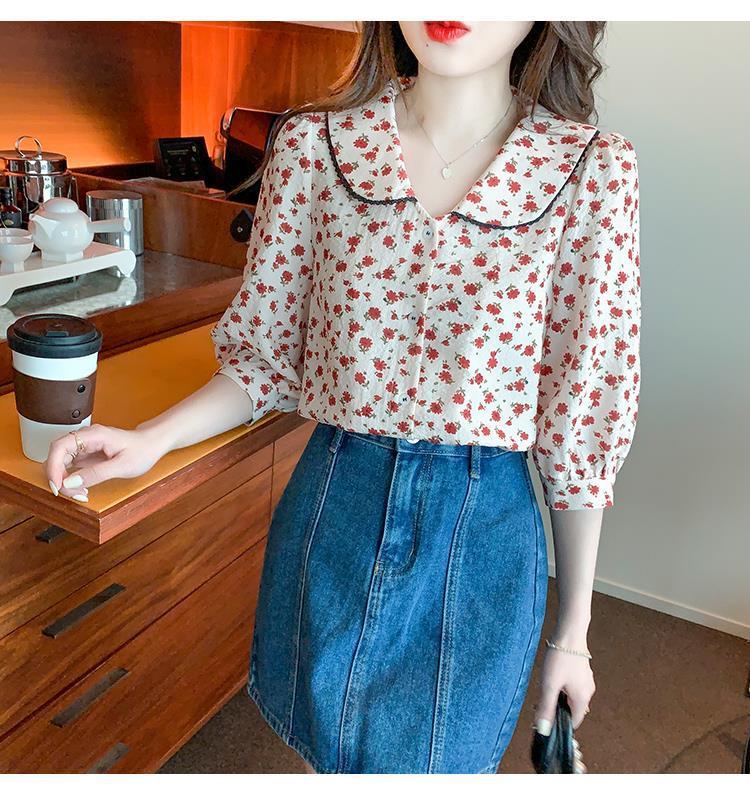 7 점 소매 프랑스 복고풍 쉬폰 셔츠 여성 2023 여름 새로운 인형 칼라 느슨한 얇은 기질 셔츠스토어 가기