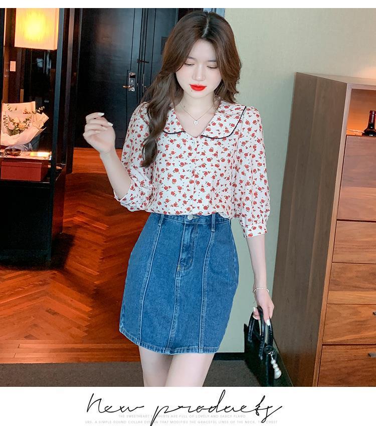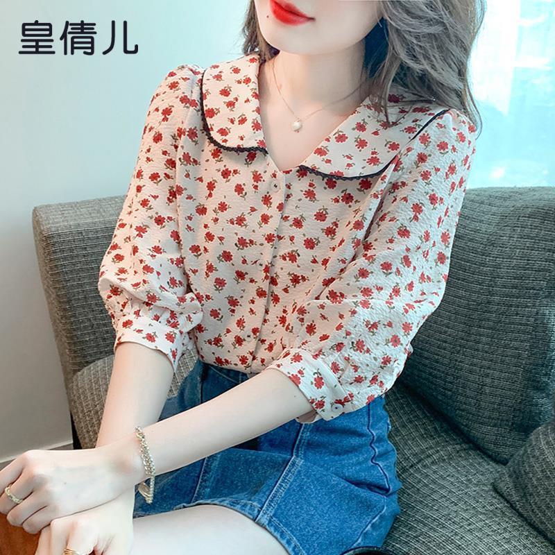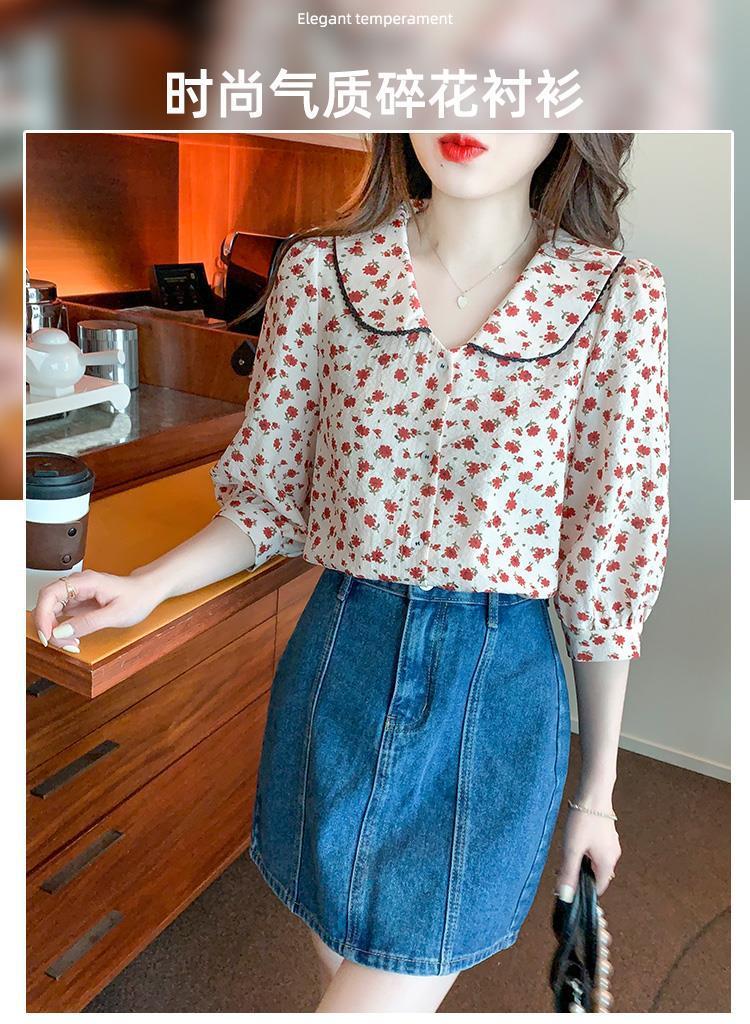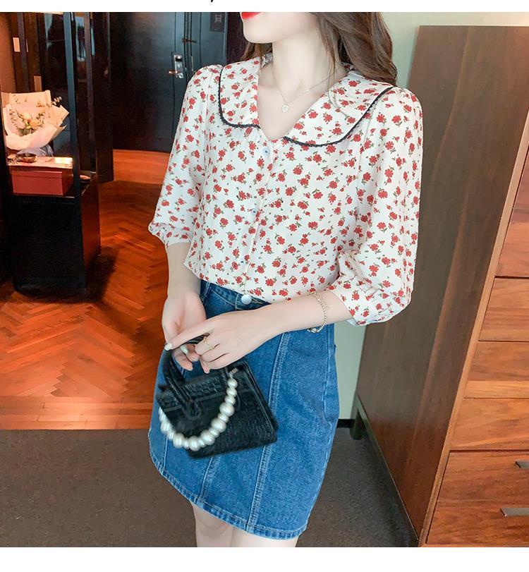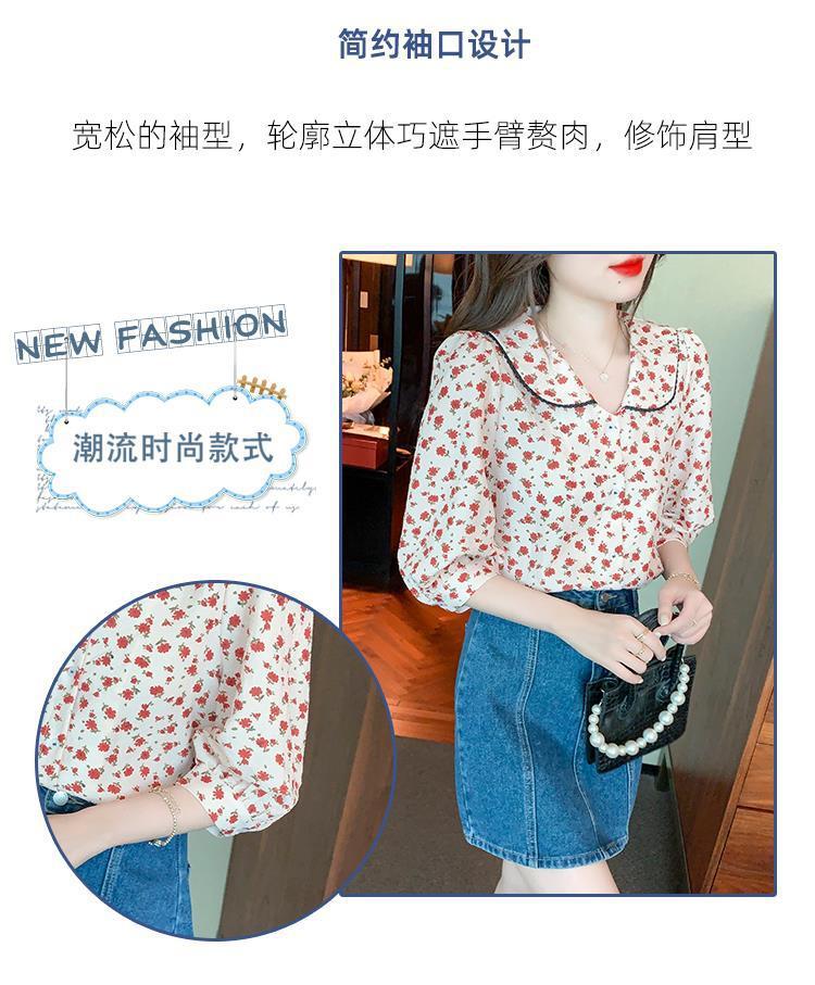 7 점 소매 프랑스 복고풍 쉬폰 셔츠 여성 2023 여름 새로운 인형 칼라 느슨한 얇은 기질 셔츠스토어 가기