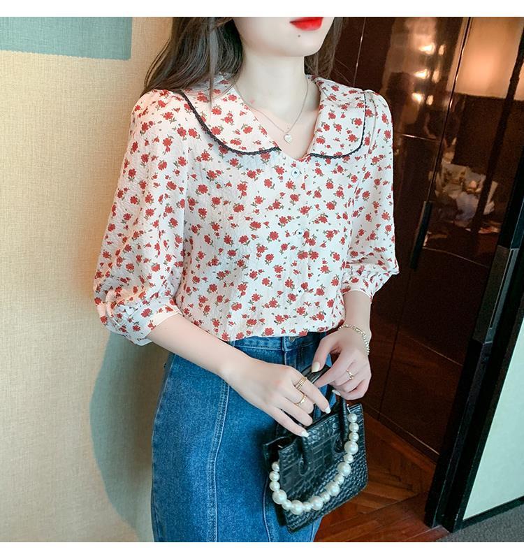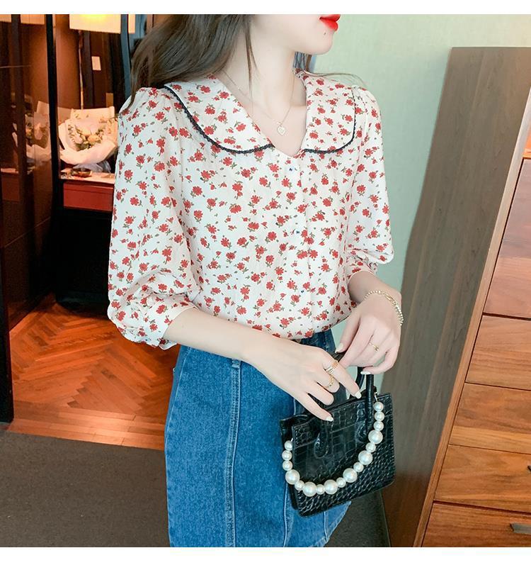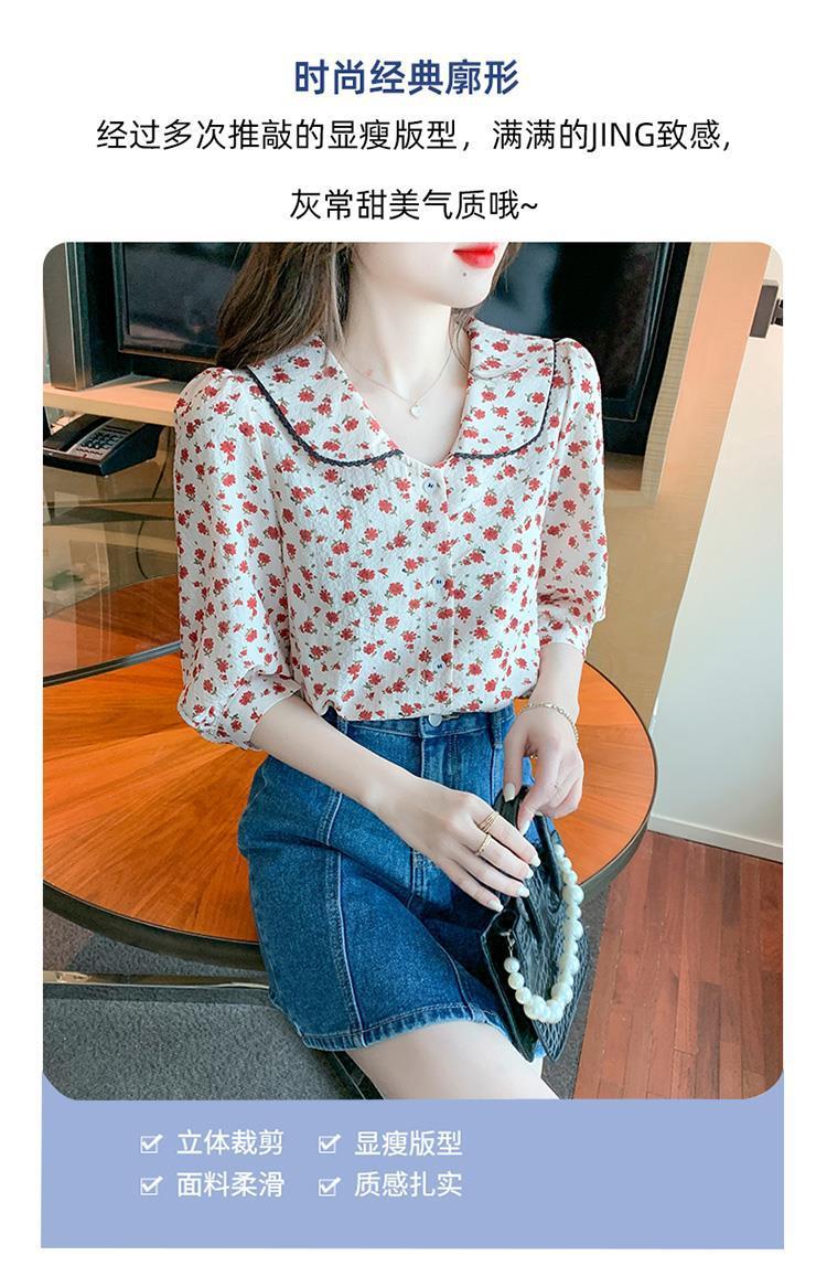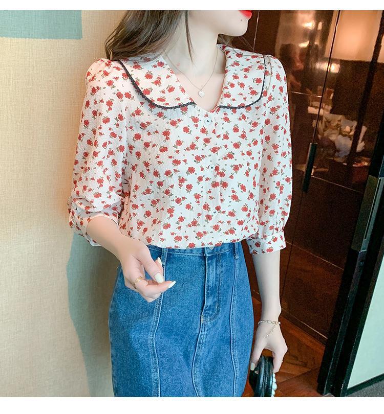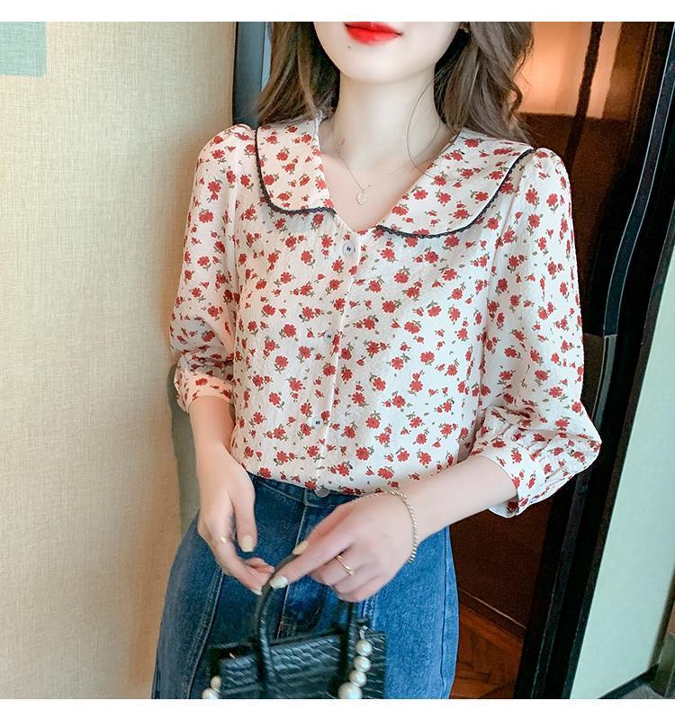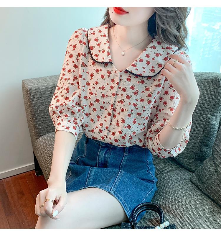 7 점 소매 프랑스 복고풍 쉬폰 셔츠 여성 2023 여름 새로운 인형 칼라 느슨한 얇은 기질 셔츠