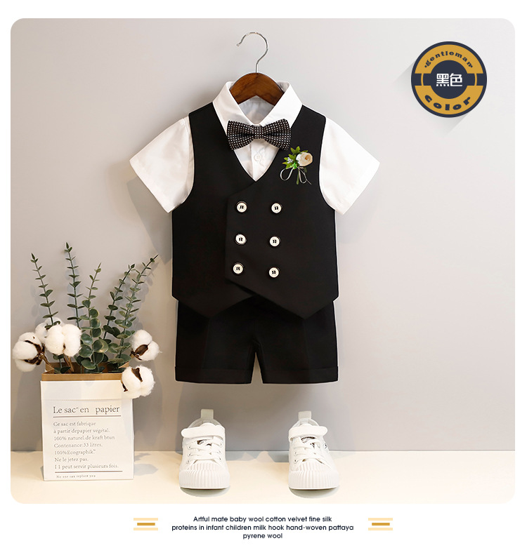 • 블랙 5 피스 세트 (조끼 + 반바지 + 반팔 셔츠 + 코사지 + 나비 넥타이)