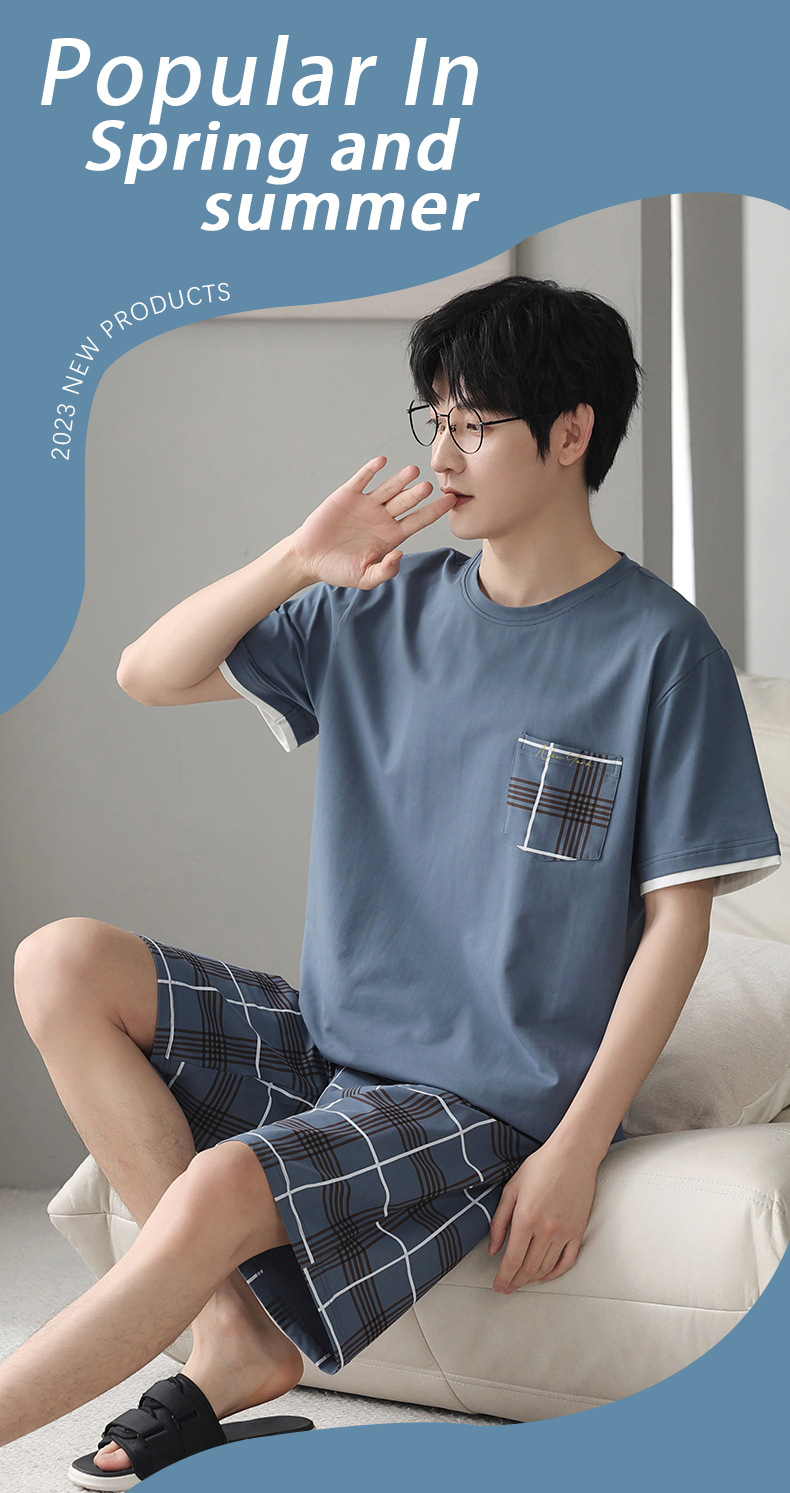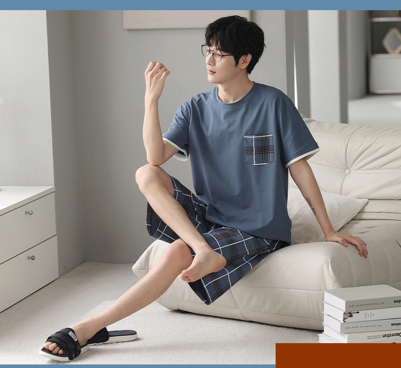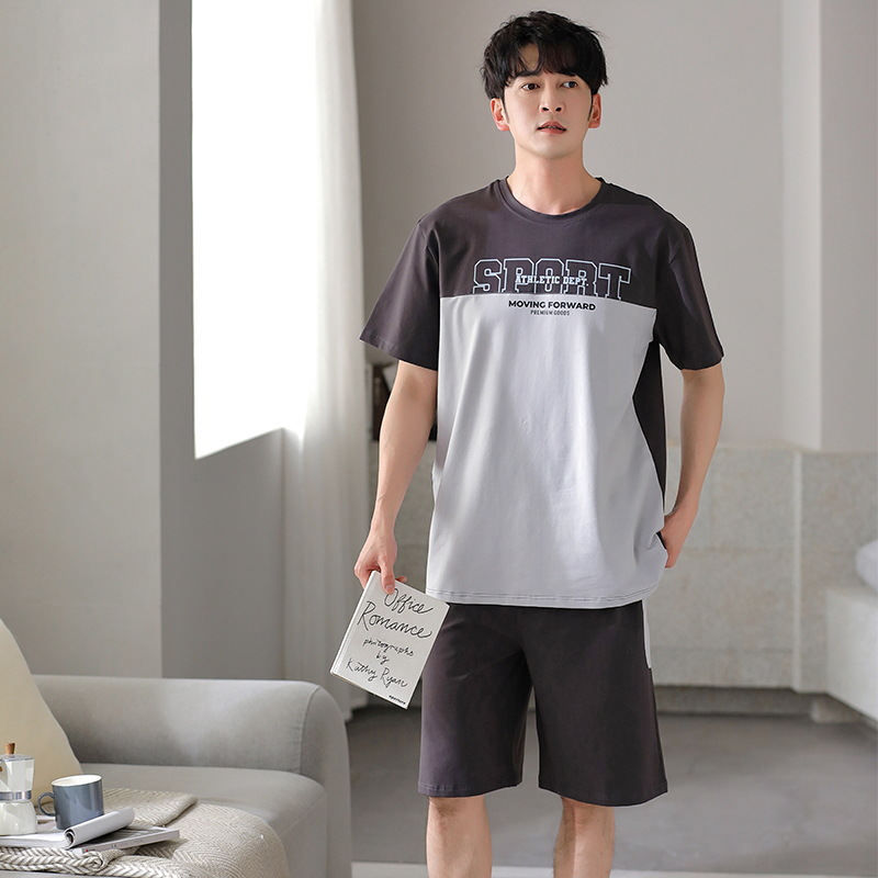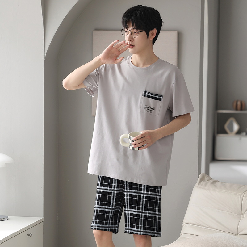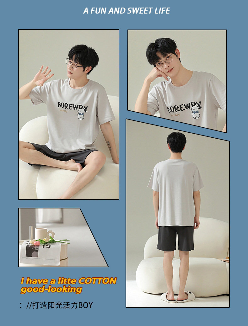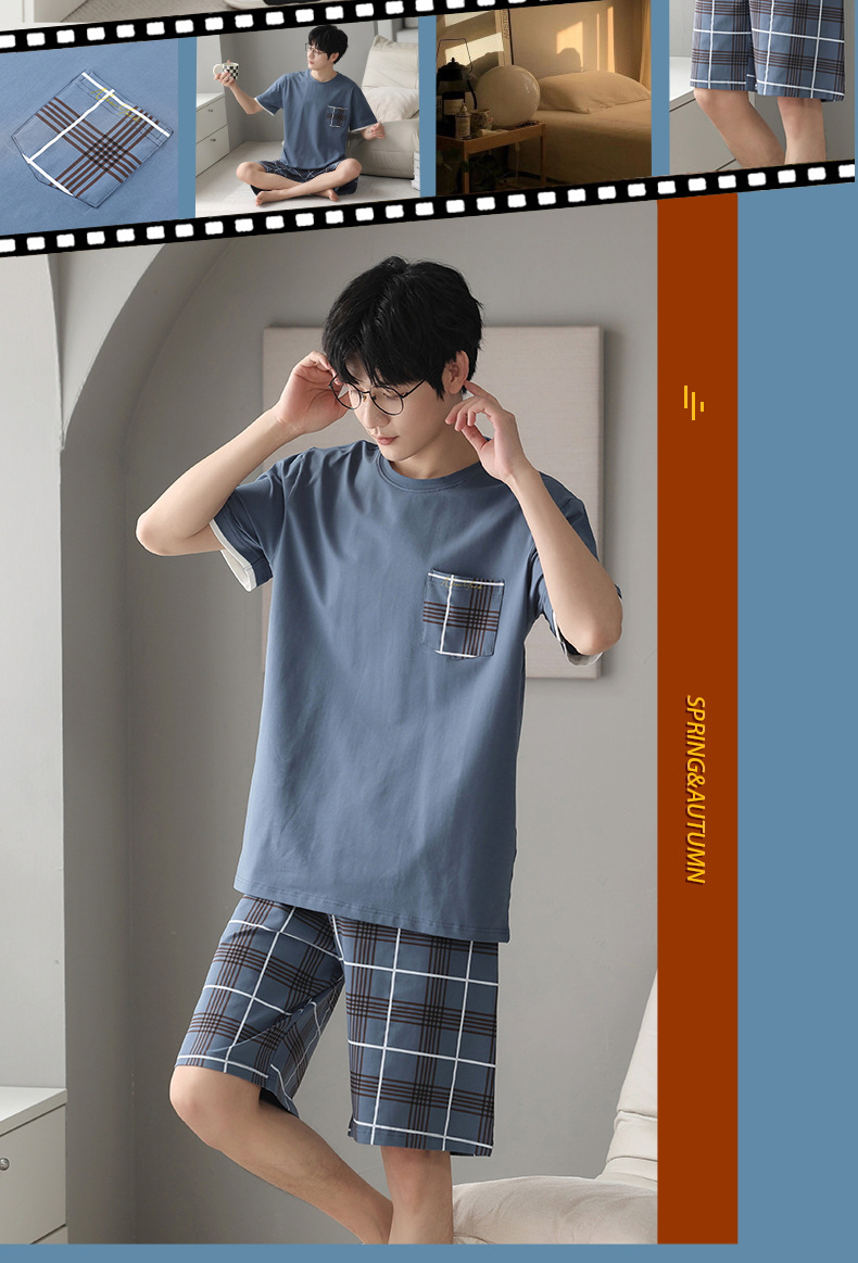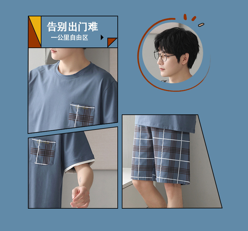 Yingzitong 여름 순면 잠옷 남성 캐주얼 홈 반팔 반바지 투피스 세트 라이브 그룹 구매 가정 의류스토어 가기