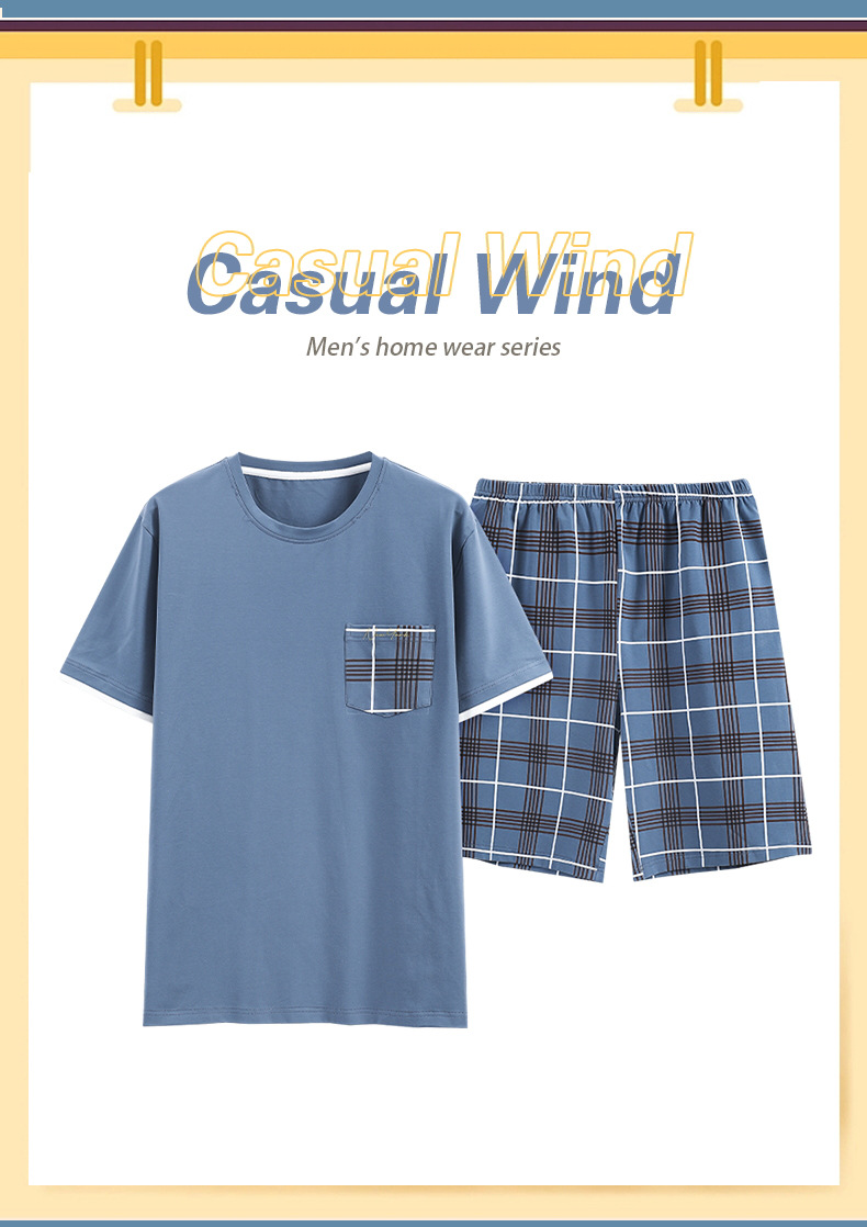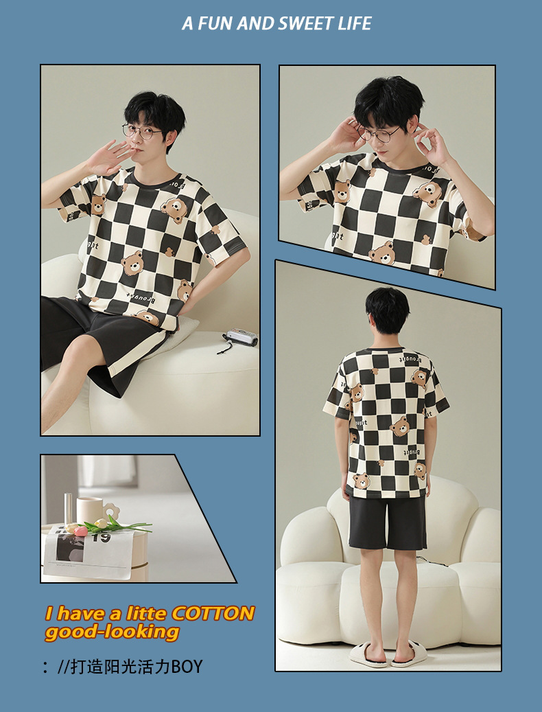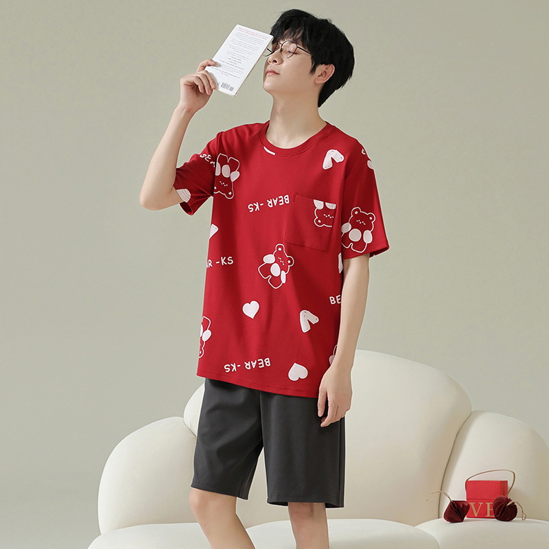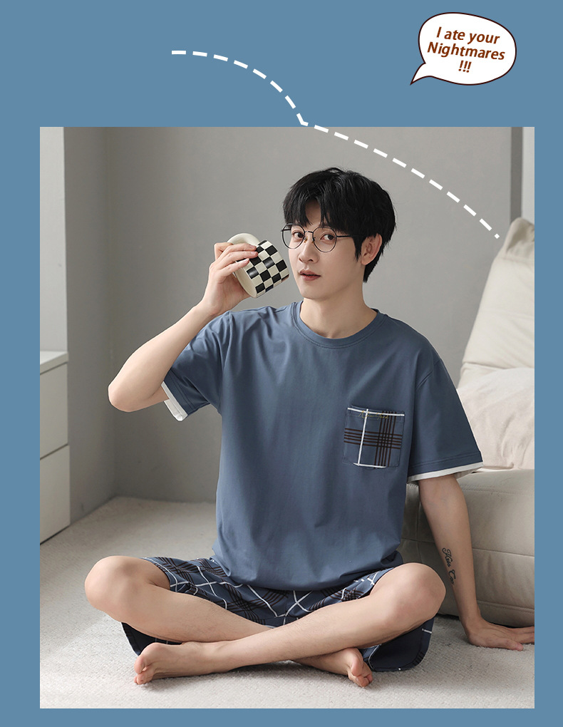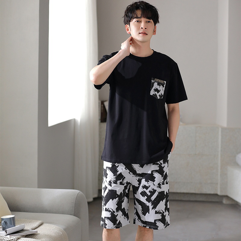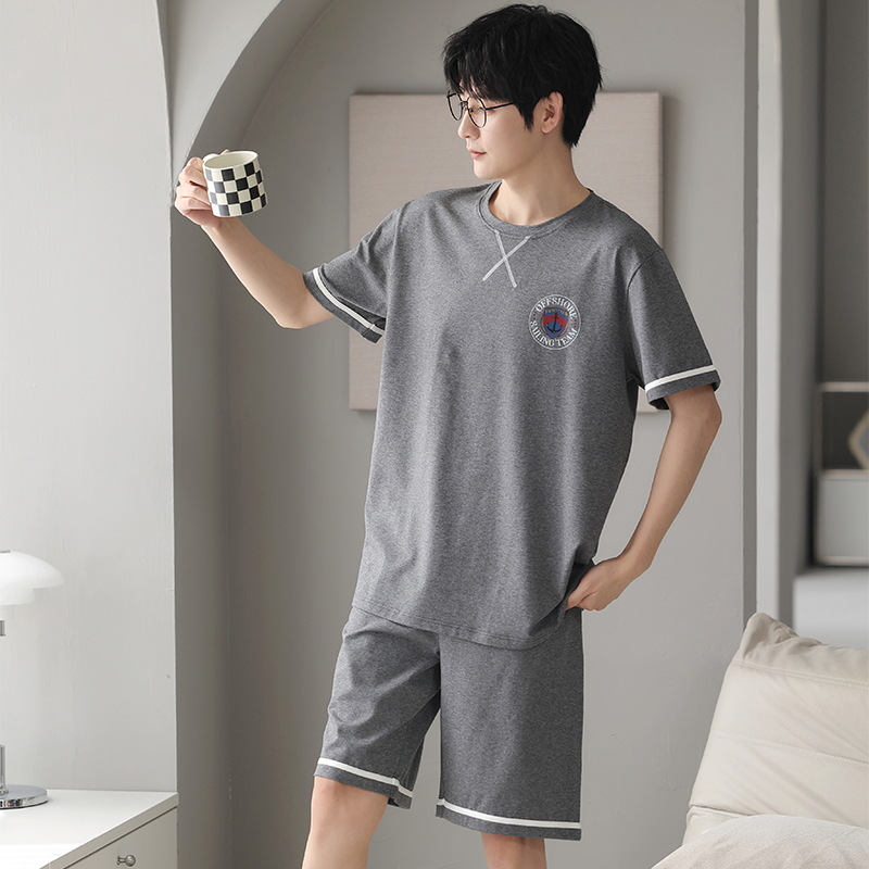 Yingzitong 여름 순면 잠옷 남성 캐주얼 홈 반팔 반바지 투피스 세트 라이브 그룹 구매 가정 의류스토어 가기