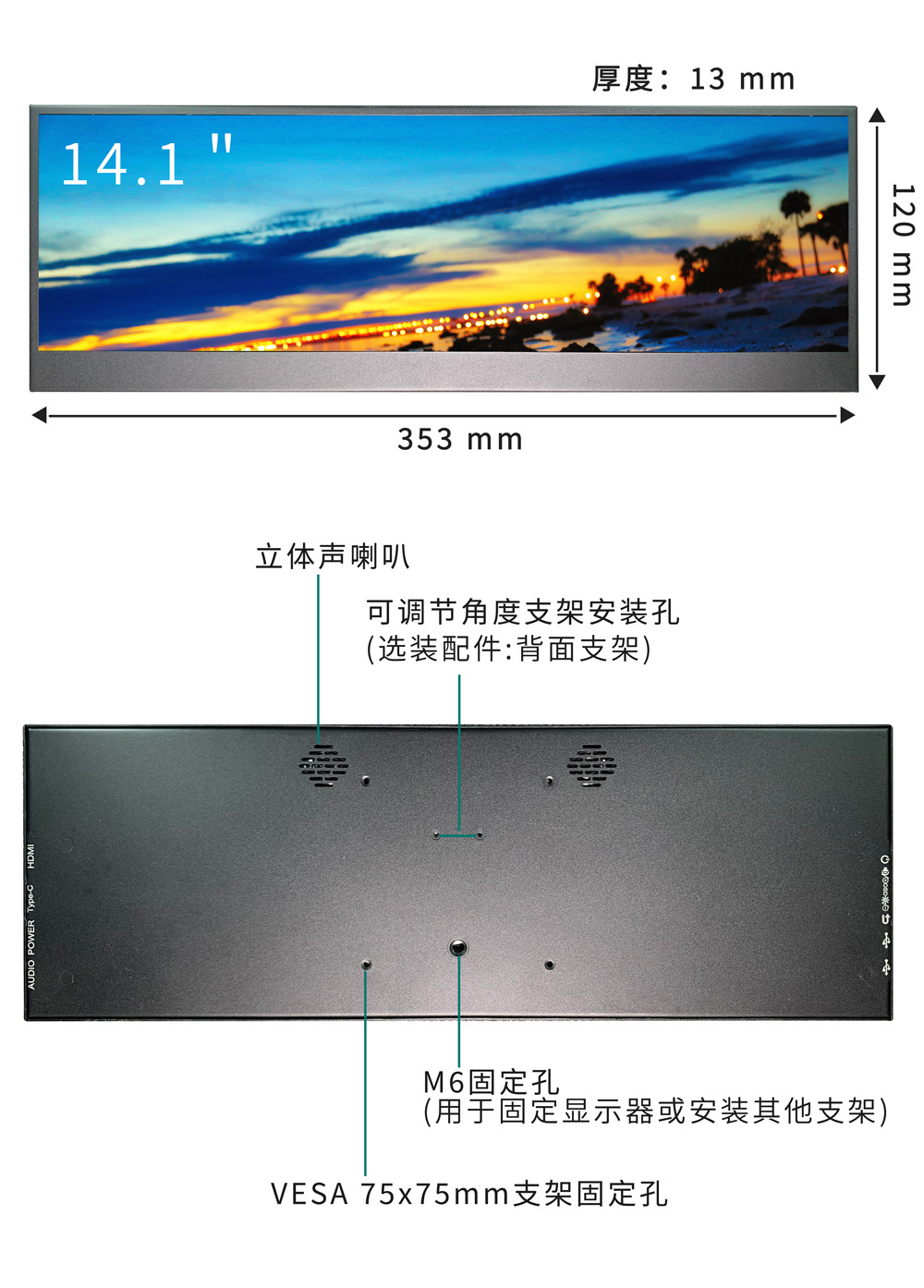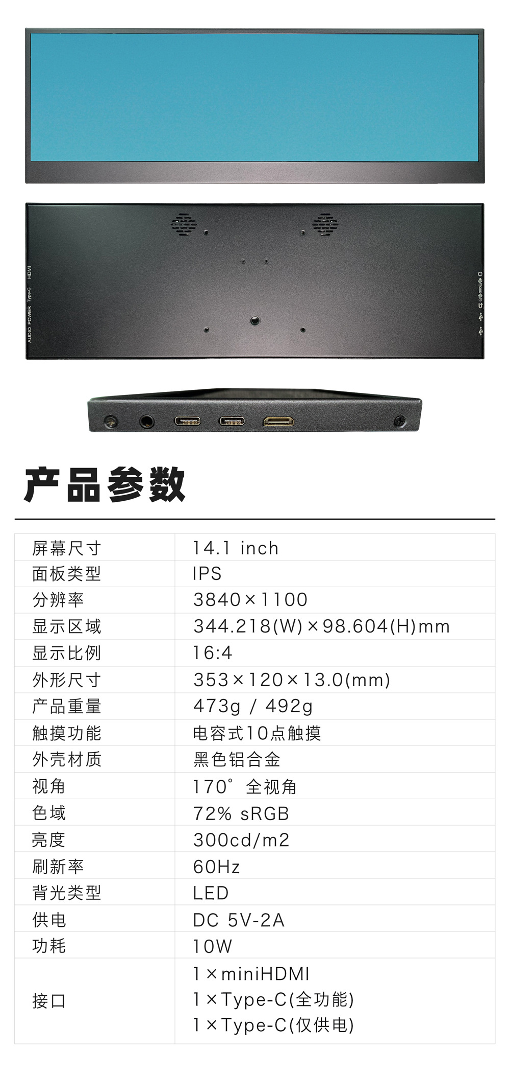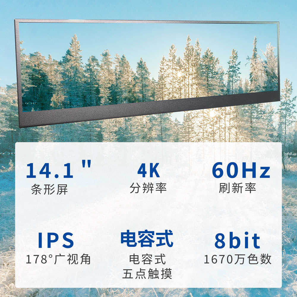 14.1inch 긴 스트립형 LCD 디스플레이 TpyeC 일체형 섀시 온도 감지 컴퓨터 보조 화면 4K