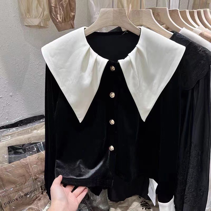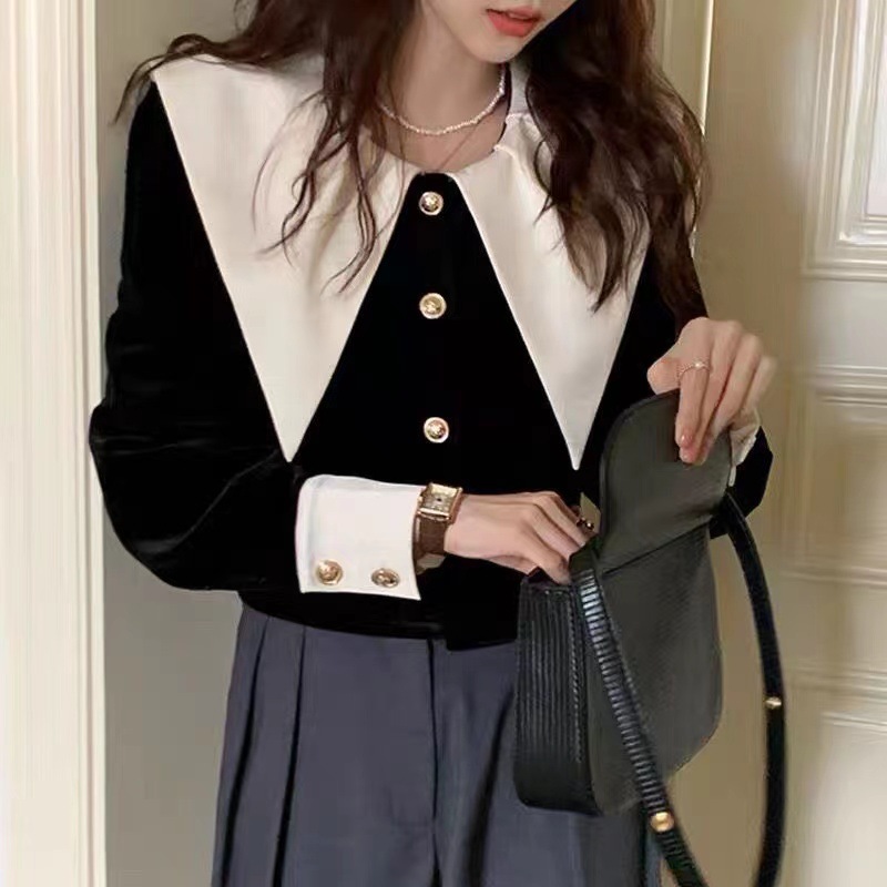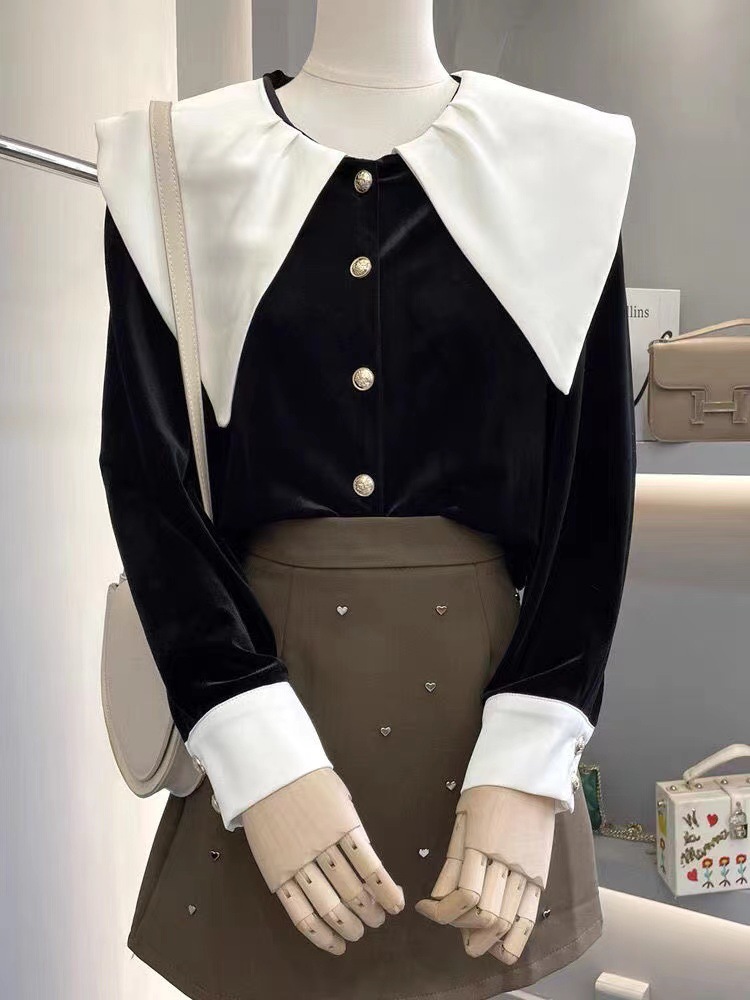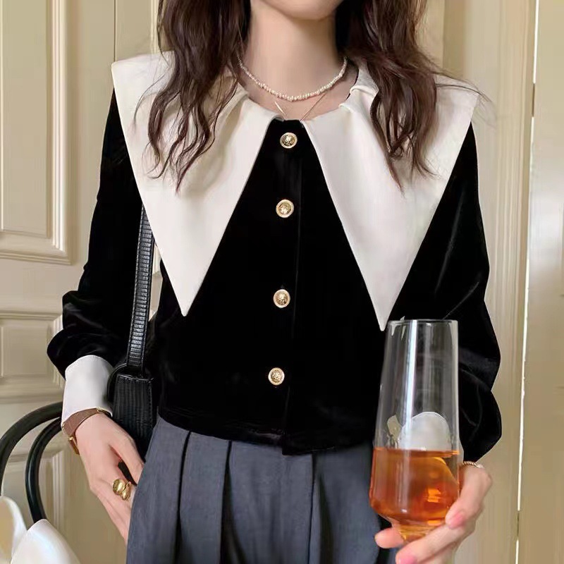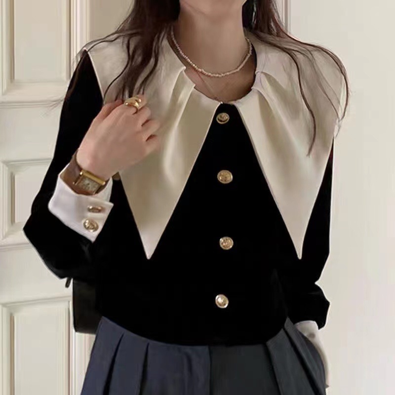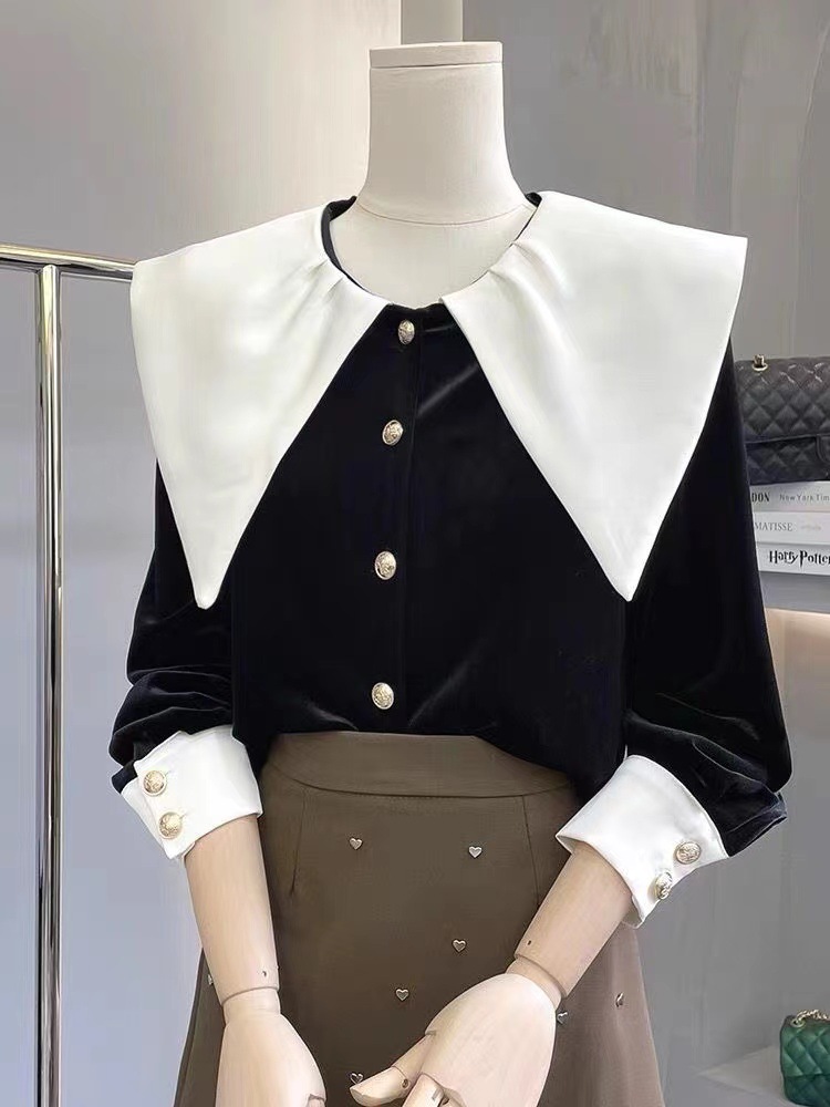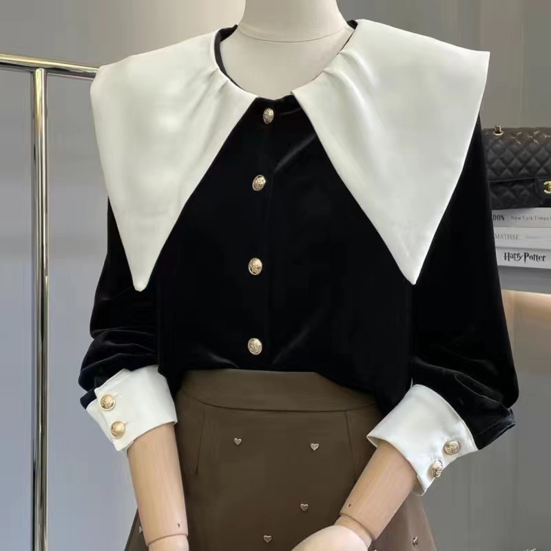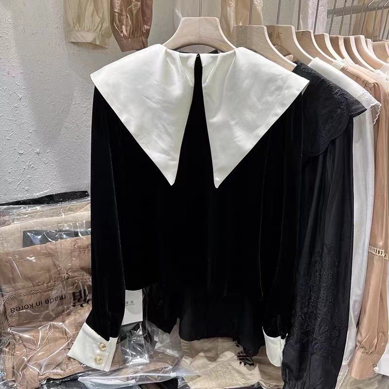 하이 엔드 세트 칼라 랜턴 슬리브 셔츠 여성의 봄 디자인 인형 칼라 흑백 대비 골드 벨벳 셔츠스토어 가기