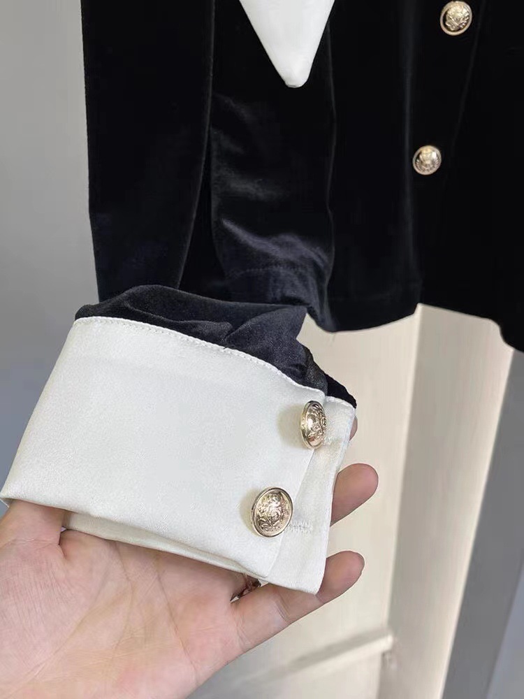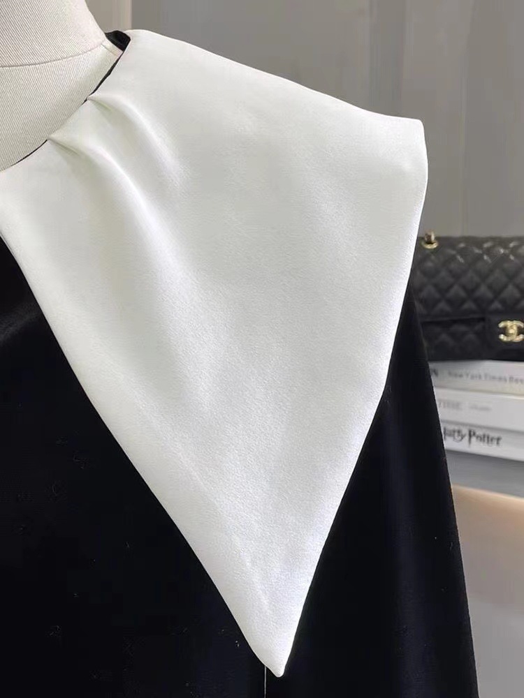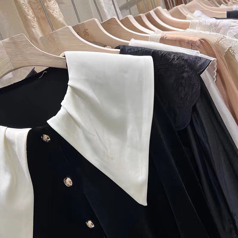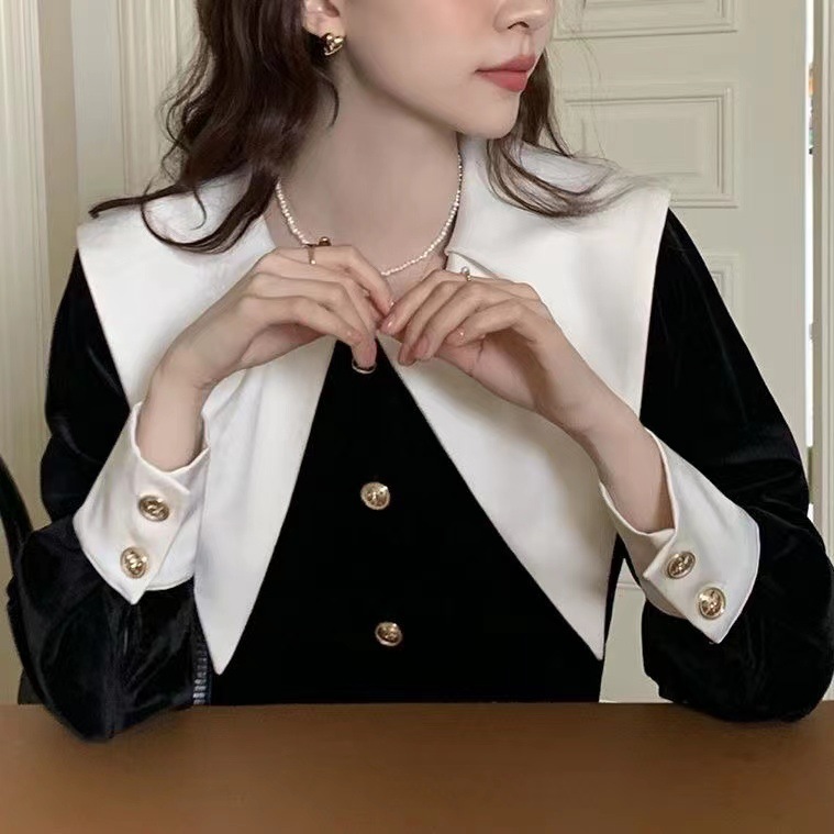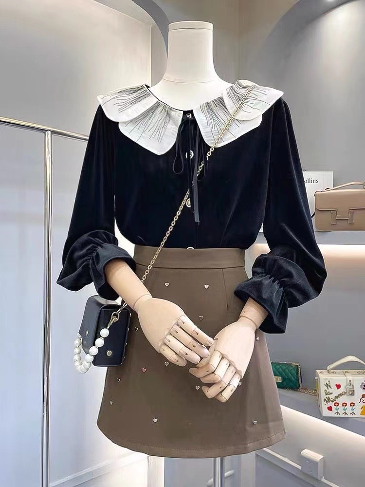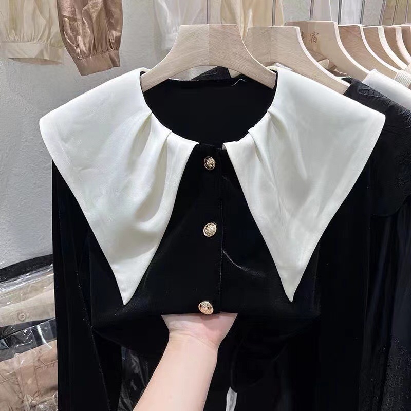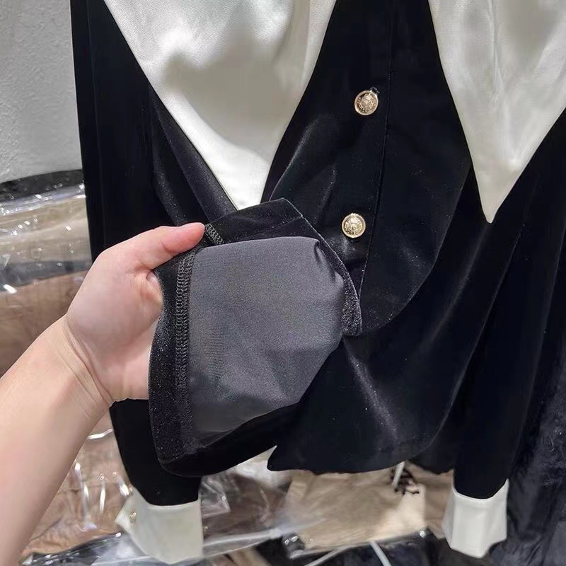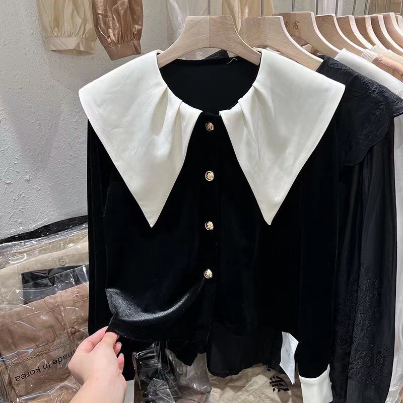 하이 엔드 세트 칼라 랜턴 슬리브 셔츠 여성의 봄 디자인 인형 칼라 흑백 대비 골드 벨벳 셔츠스토어 가기