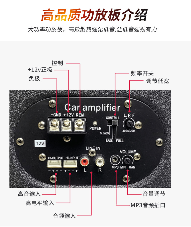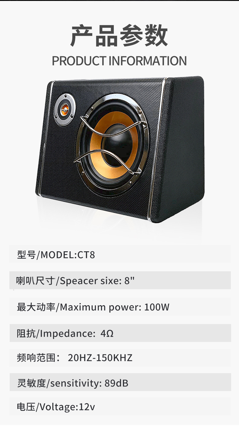8 인치 사다리꼴 고출력 12V 액티브 카 오디오 트럭 카드 서브 우퍼 카 대형 오디오 수정