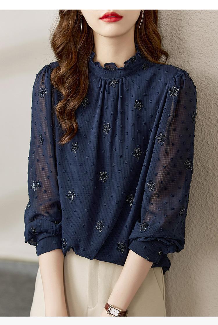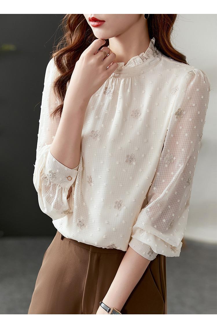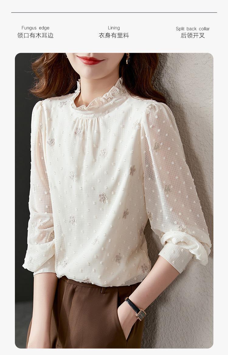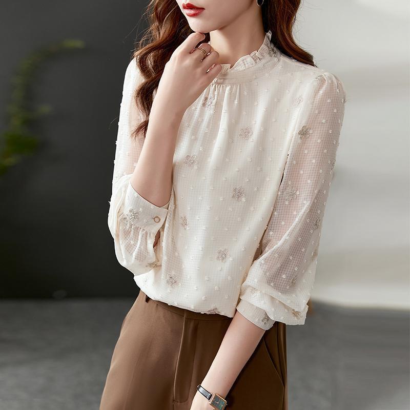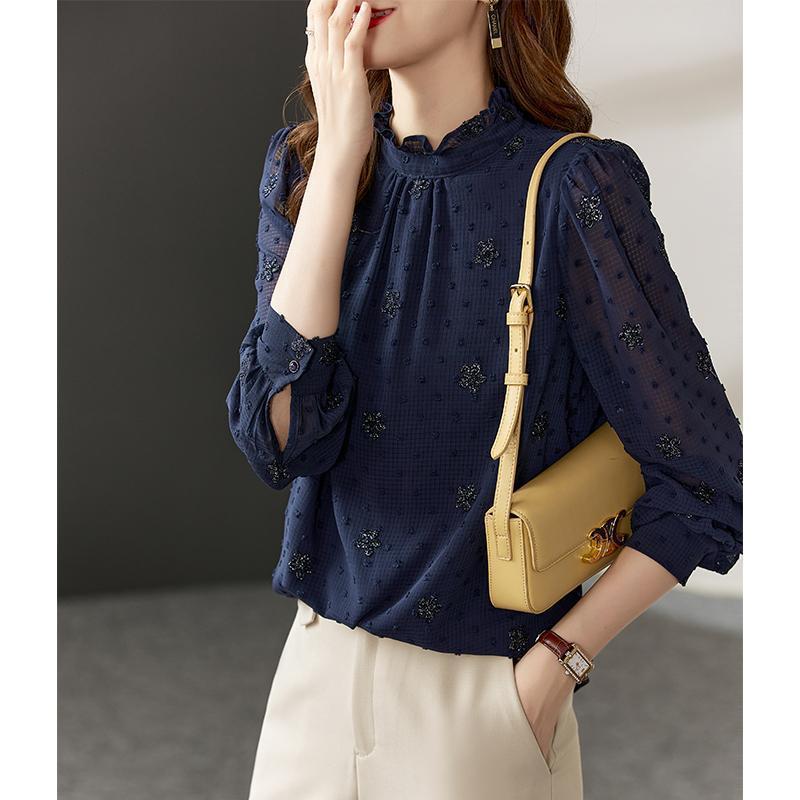 2023 년 봄과 가을 서양식 귀 가장자리 칼라 셔츠 여성 배꼽이 덮인 시폰 셔츠스토어 가기