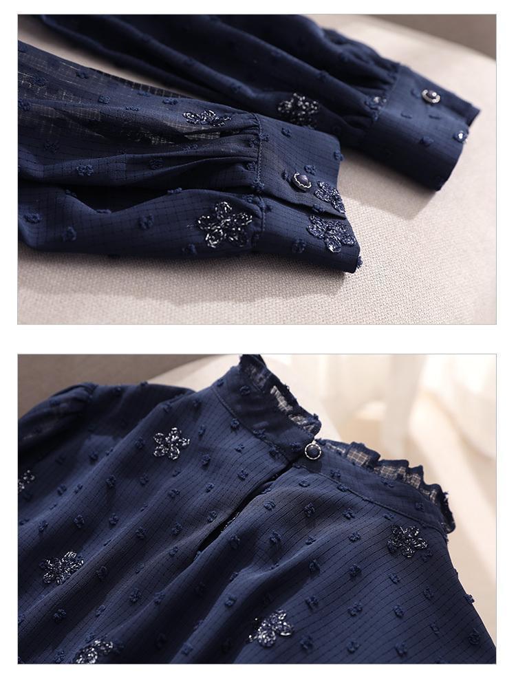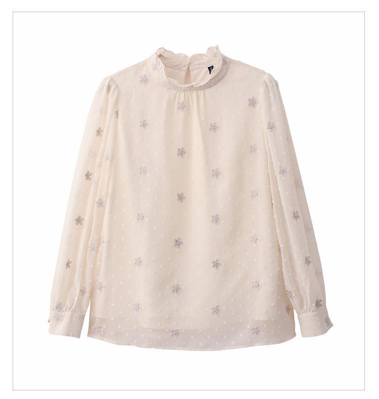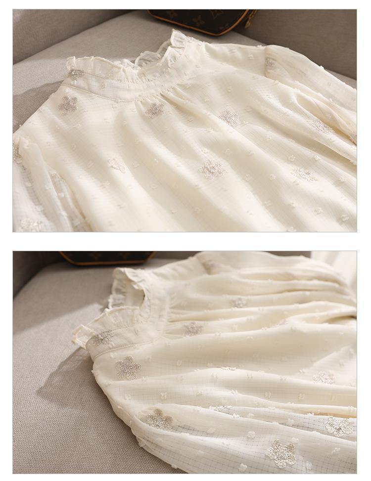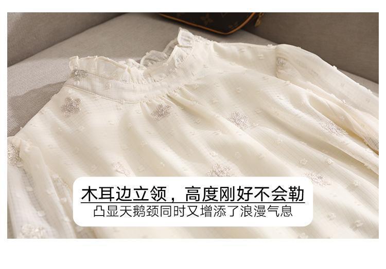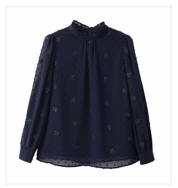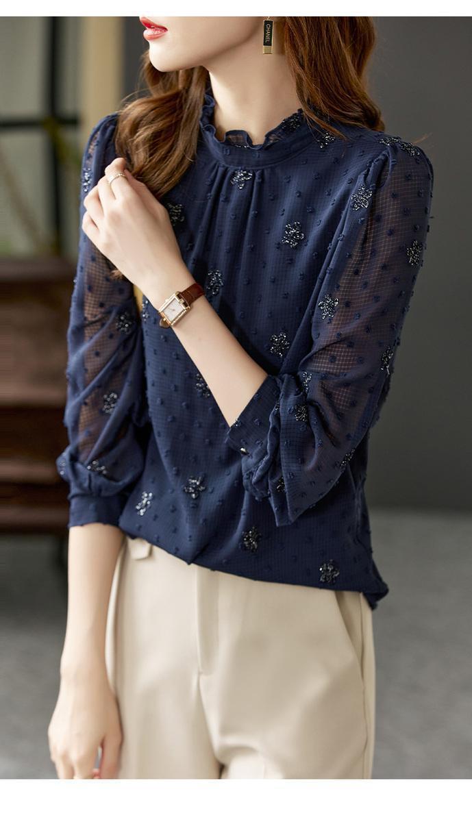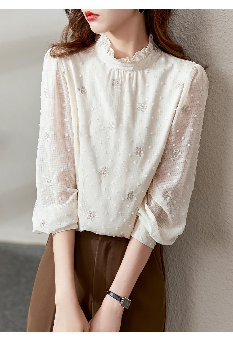 2023 년 봄과 가을 서양식 귀 가장자리 칼라 셔츠 여성 배꼽이 덮인 시폰 셔츠스토어 가기