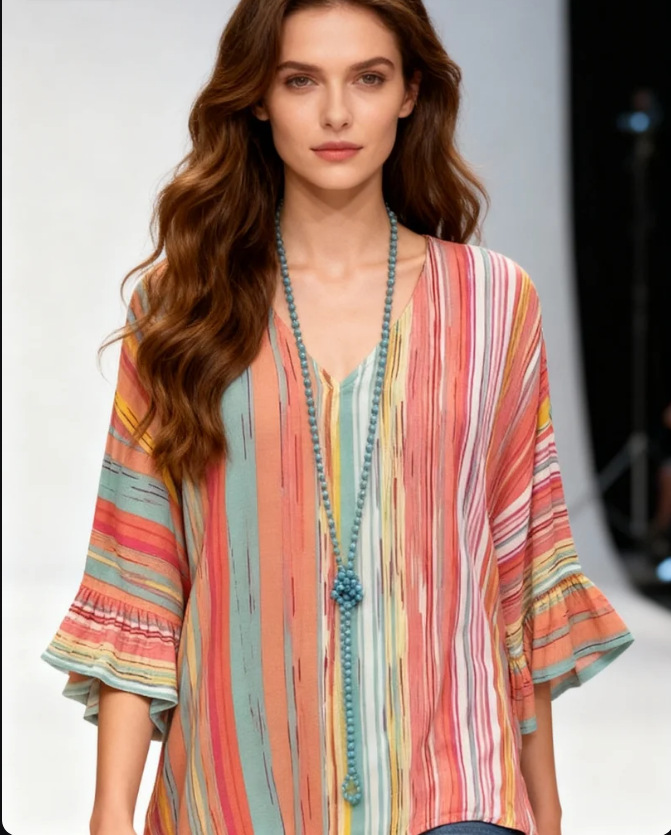 유럽과 미국의 2023 국경 아마존 스트라이프 셔츠 느슨한 v 넥 프린트 슬림 라운드 넥 문학 복고풍 여성 티셔츠