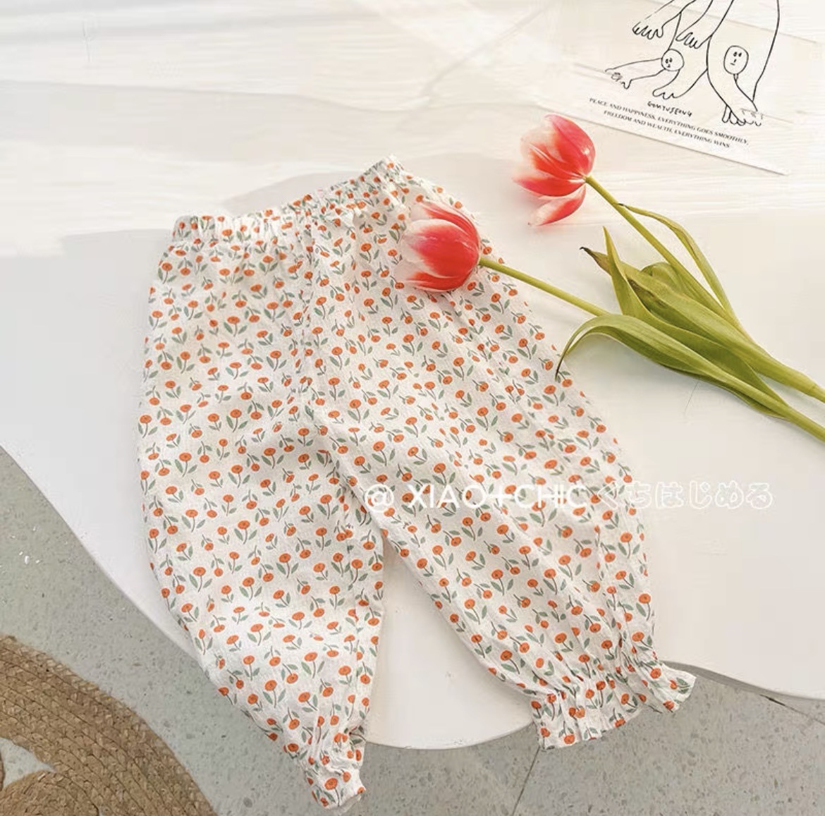 봄 이야기 ~ 소녀의 한국식 플로럴 그린 스타일 순면 통기성 모기 방지 바지 아기 소녀의 느슨한 바지 여름 착용스토어 가기