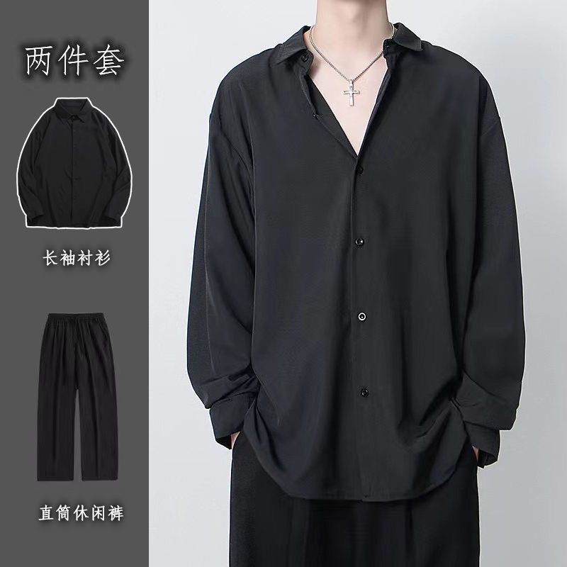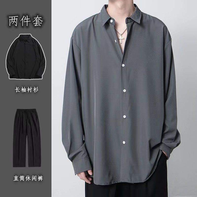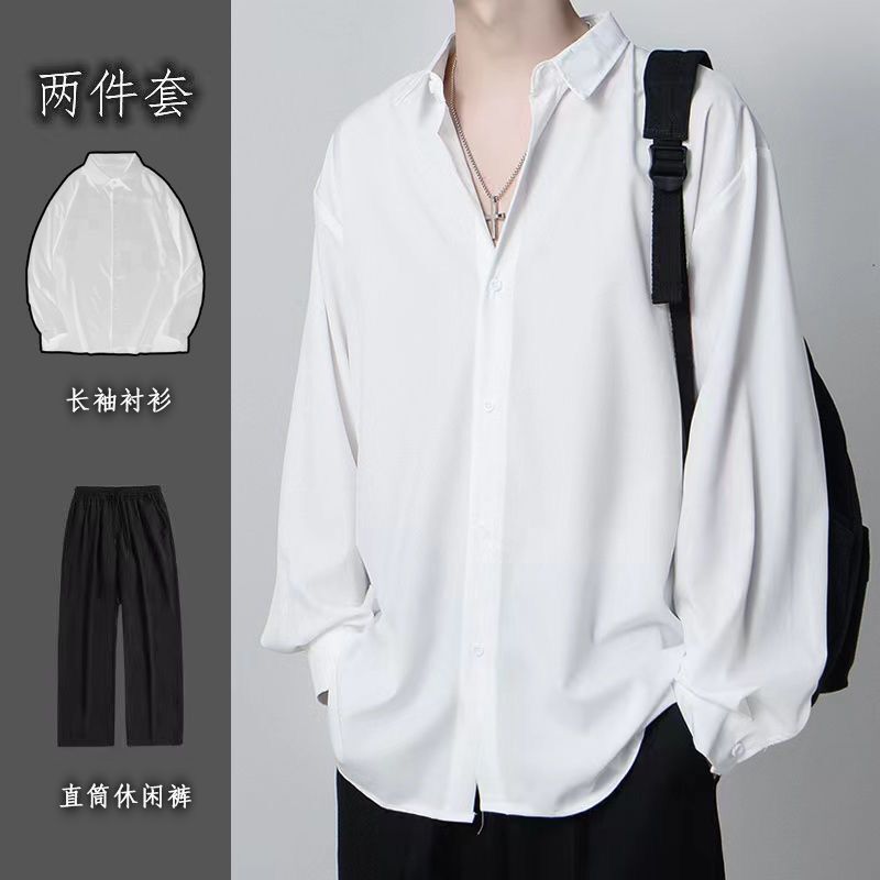 흰색 긴 소매 셔츠 남자의 새로운 한국 스타일 드롭 탑 느슨한 고급 아이스 실크 단색 쿨 dk 셔츠