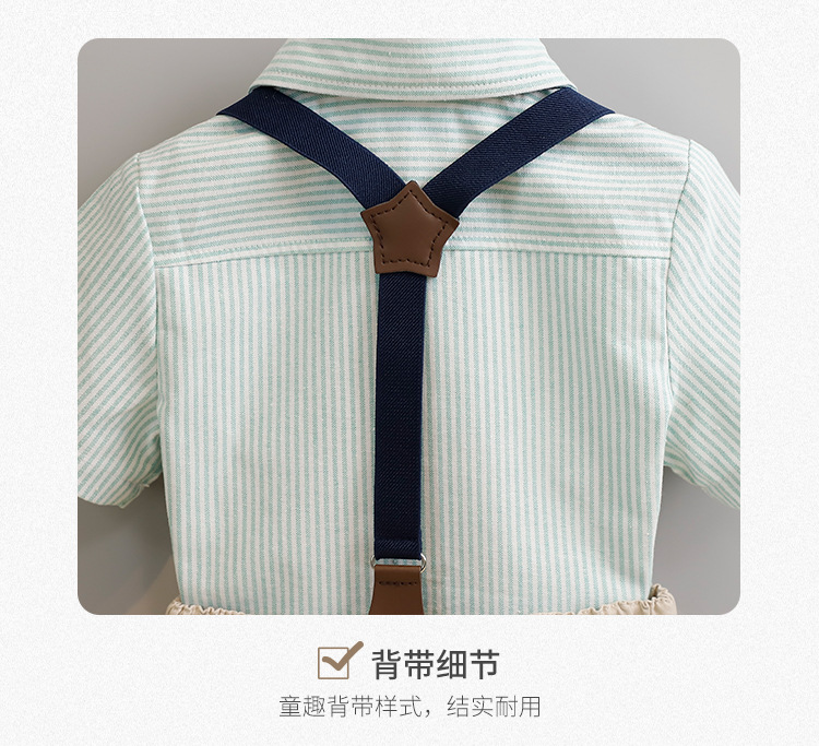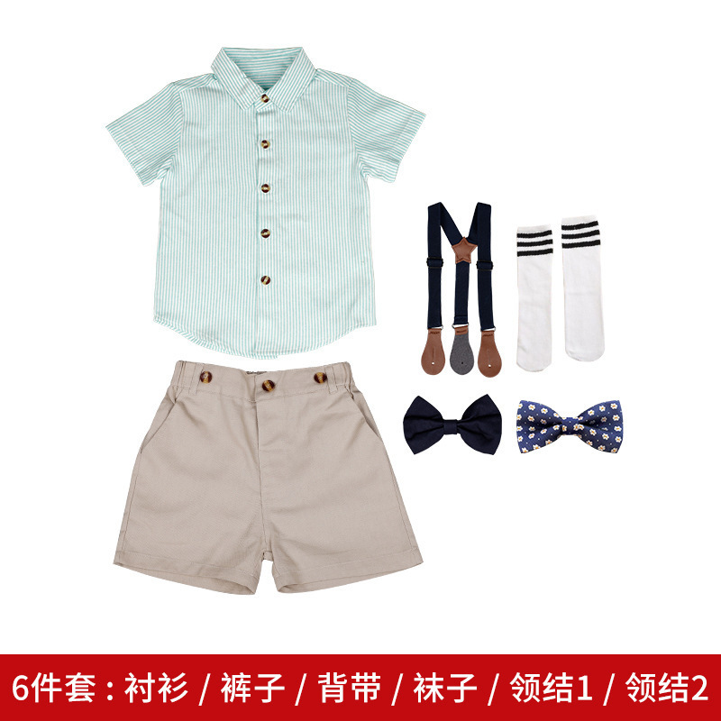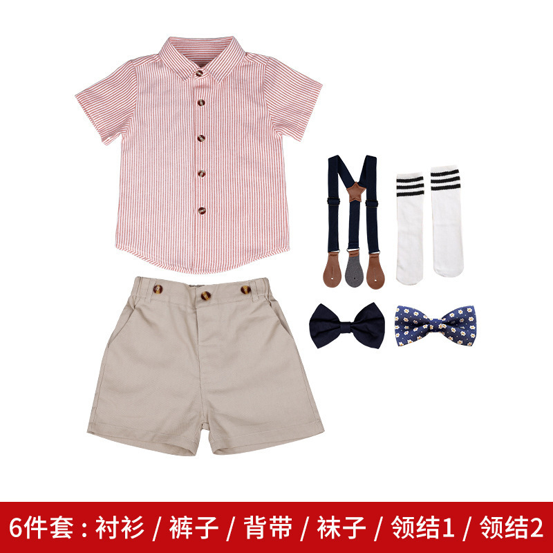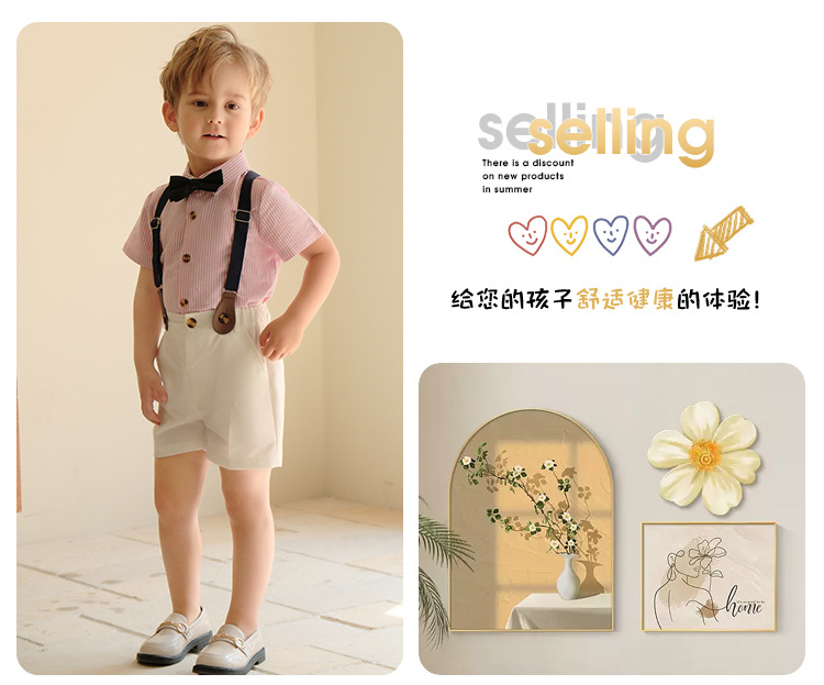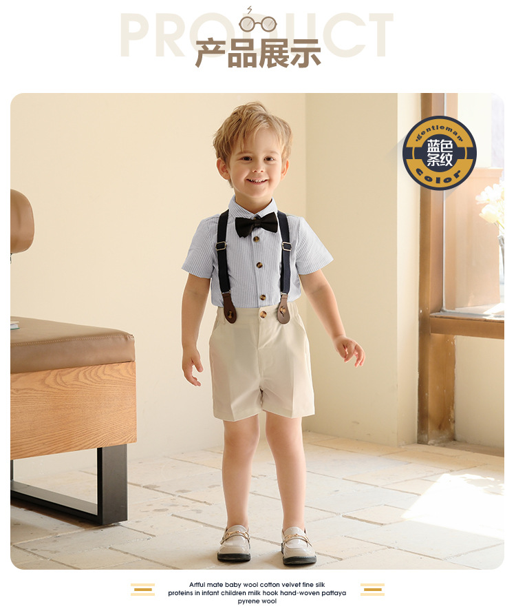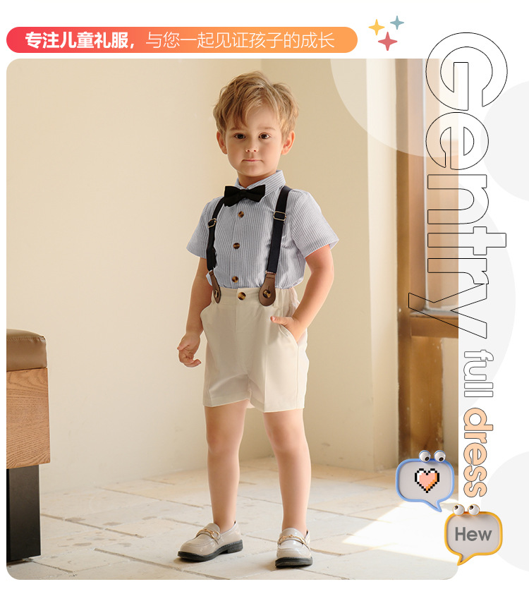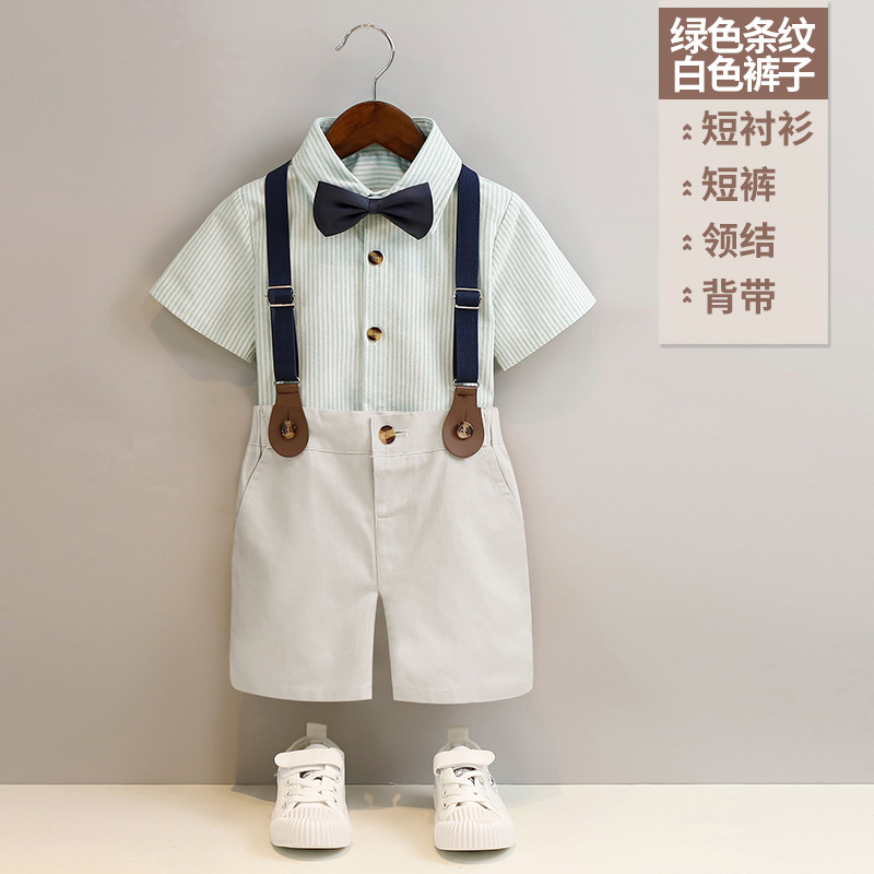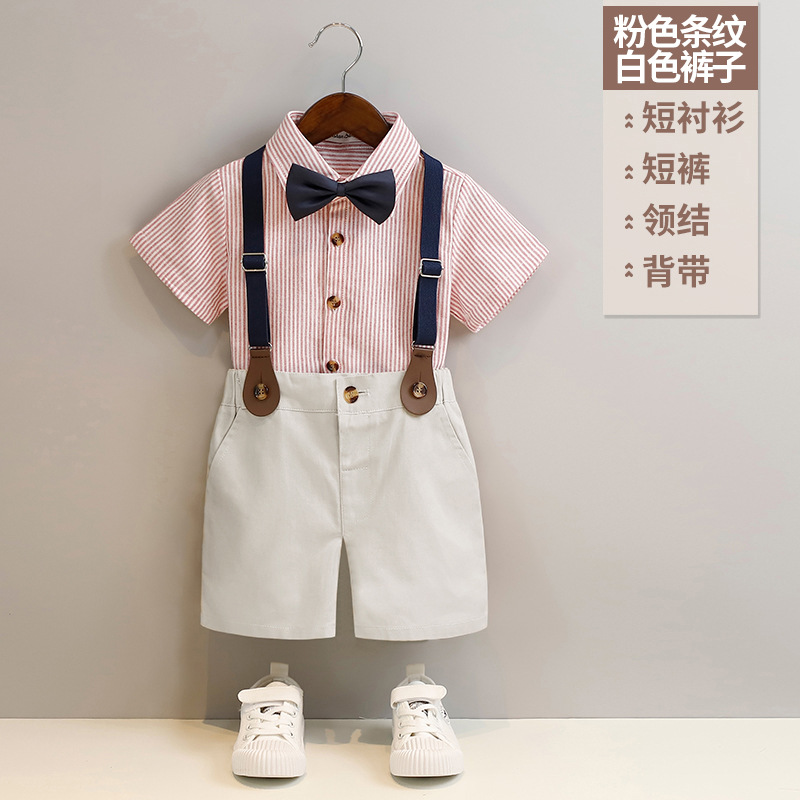어린이 원피스 봄과 여름 새로운 영국 스트라이프 멜빵 바지 소년 1 세 꽃 소녀 웨딩 원피스 반팔 셔츠 세트