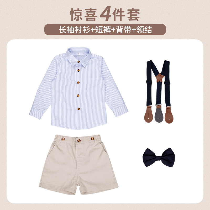 • 파란색 [긴팔 + 반바지] 4종 세트 (긴팔 셔츠 + 반바지 + Y5Y6 보타이 + 멜빵)