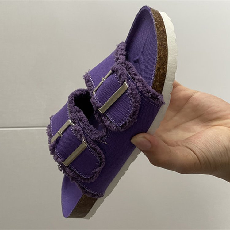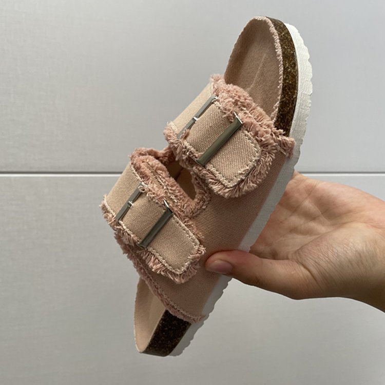 대외 무역 국경 대형 술 슬리퍼 여성 겉옷 2025 새로운 벨트 버클 코르크 바닥 캔버스 한 단어 샌들 여성