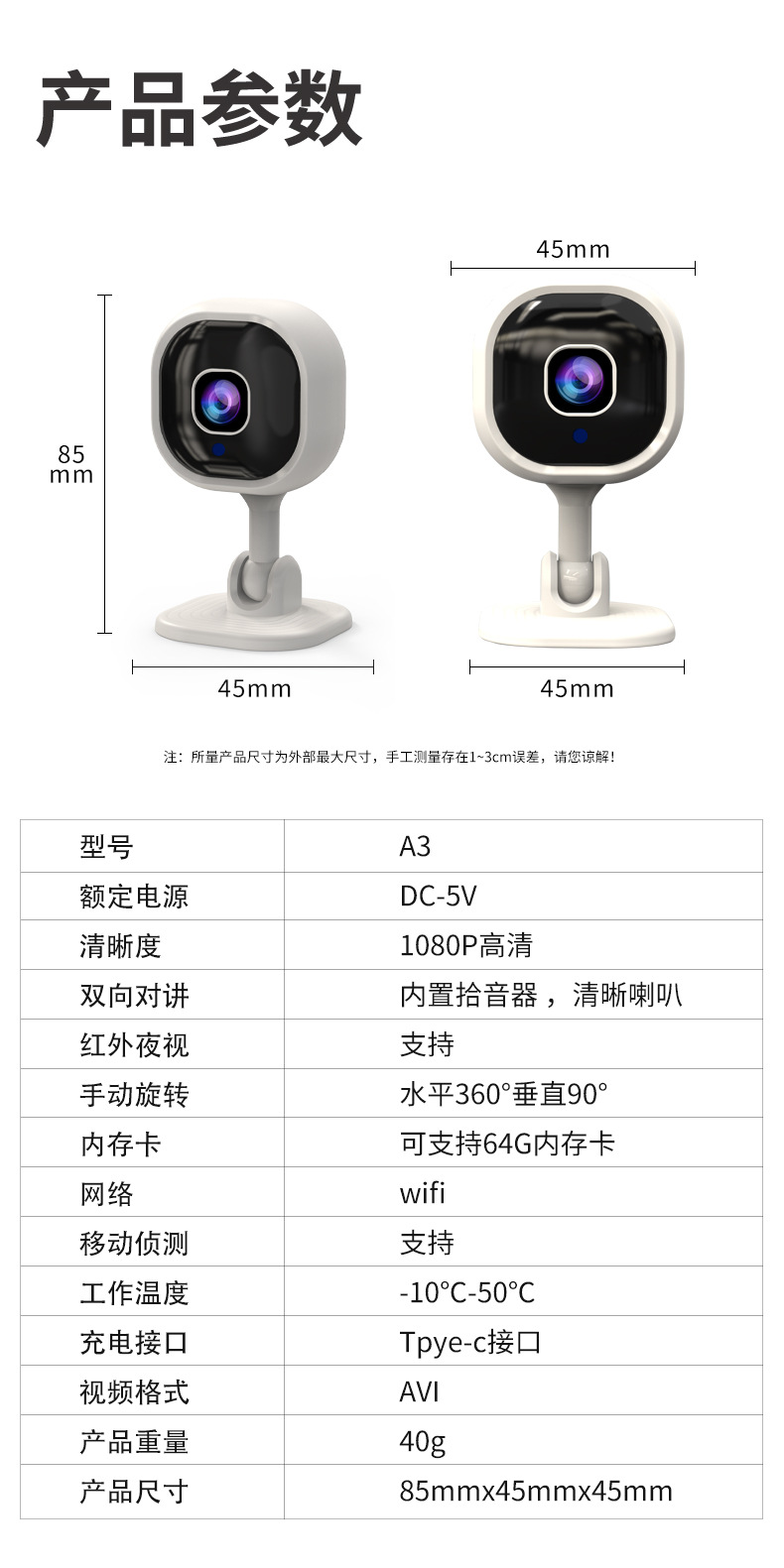 A3 카메라 고화질 야간 투시 양방향 인터콤 카메라 가정용 스마트 보안 모니터링 무선 와이파이 카메라
