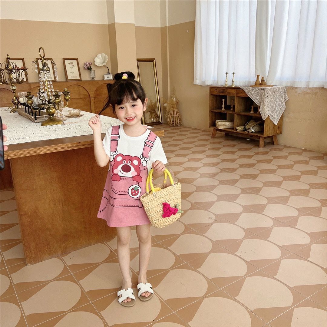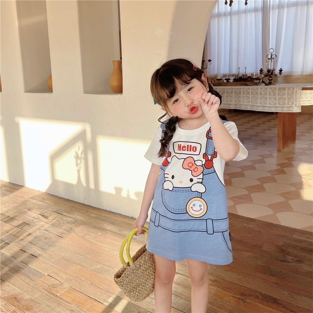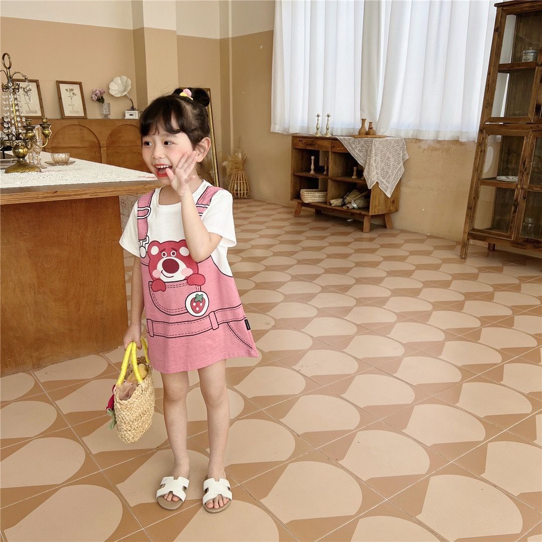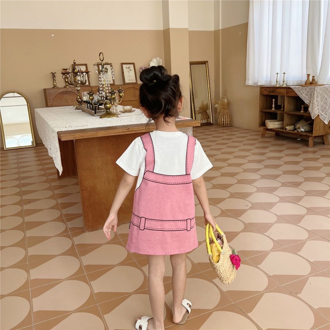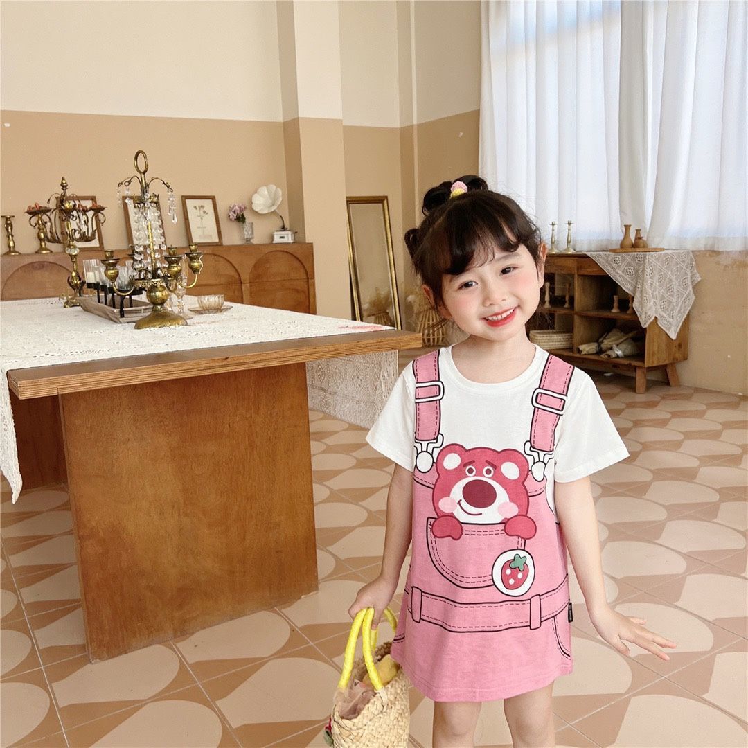여자 드레스 2025 여름 새로운 스타일 귀여운 소녀 유행 만화 인쇄 느슨한 반팔 티셔츠 스커트 유행스토어 가기