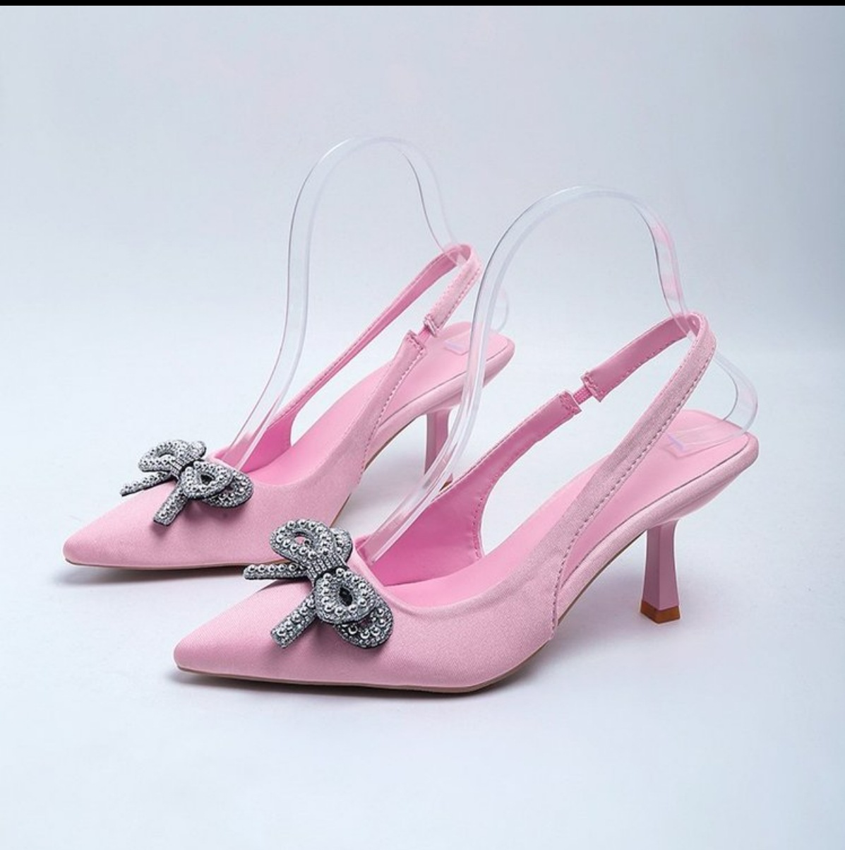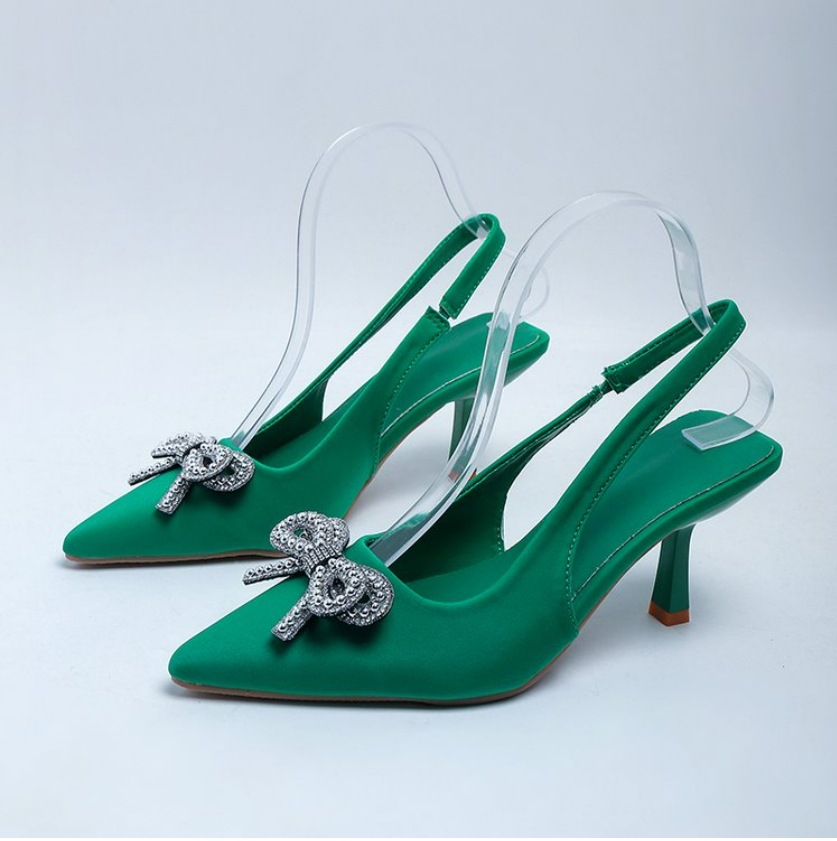 ZA2022 새로운 샌들 여성용 하이힐 신발 뾰족한 후방 여행 밴드 활 모조 다이아몬드 체인 밝게 장식 된 스틸레토 힐 얕은 여성 신발스토어 가기