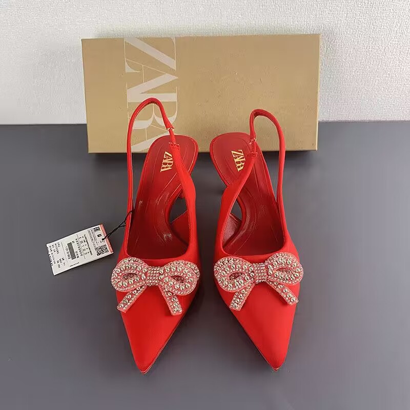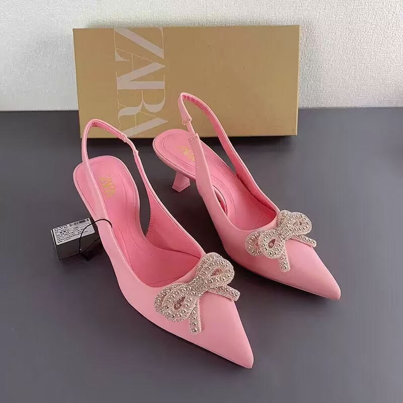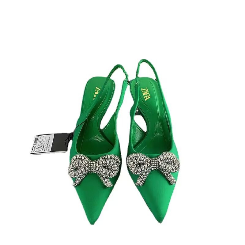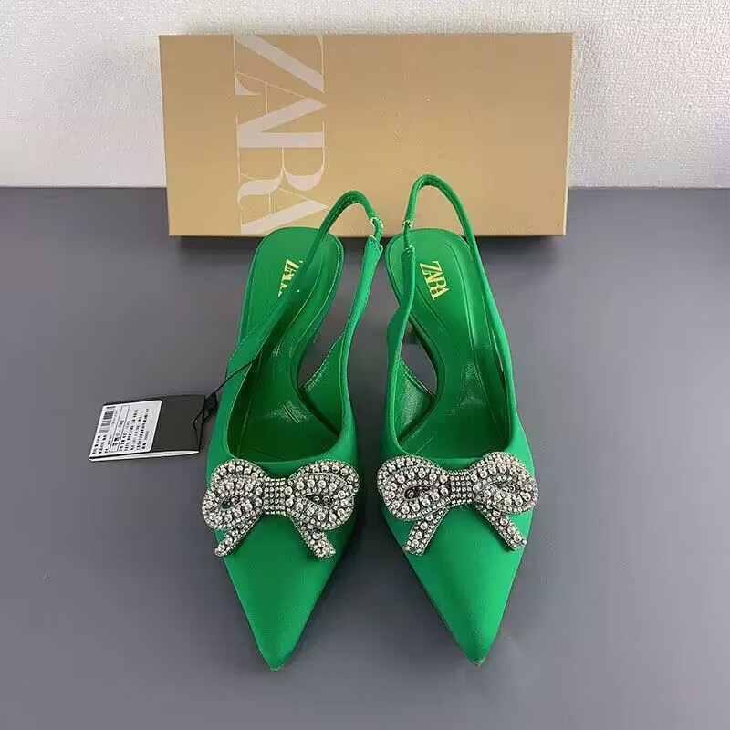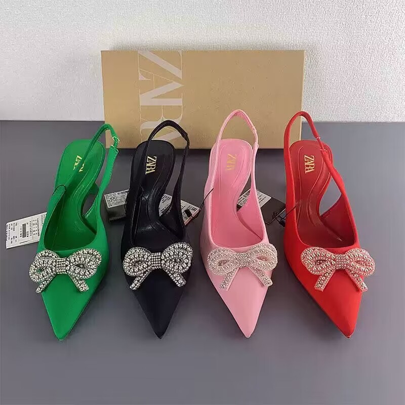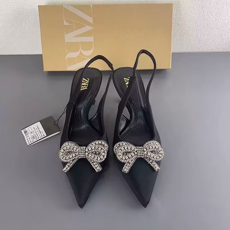 ZA2022 새로운 샌들 여성용 하이힐 신발 뾰족한 후방 여행 밴드 활 모조 다이아몬드 체인 밝게 장식 된 스틸레토 힐 얕은 여성 신발