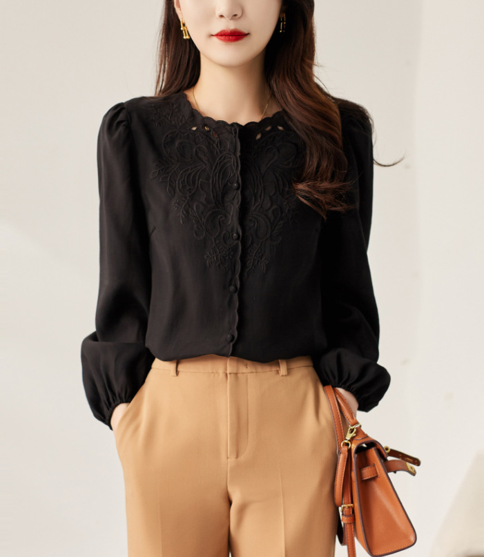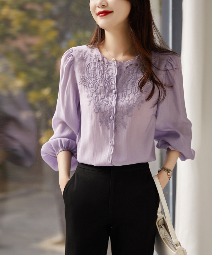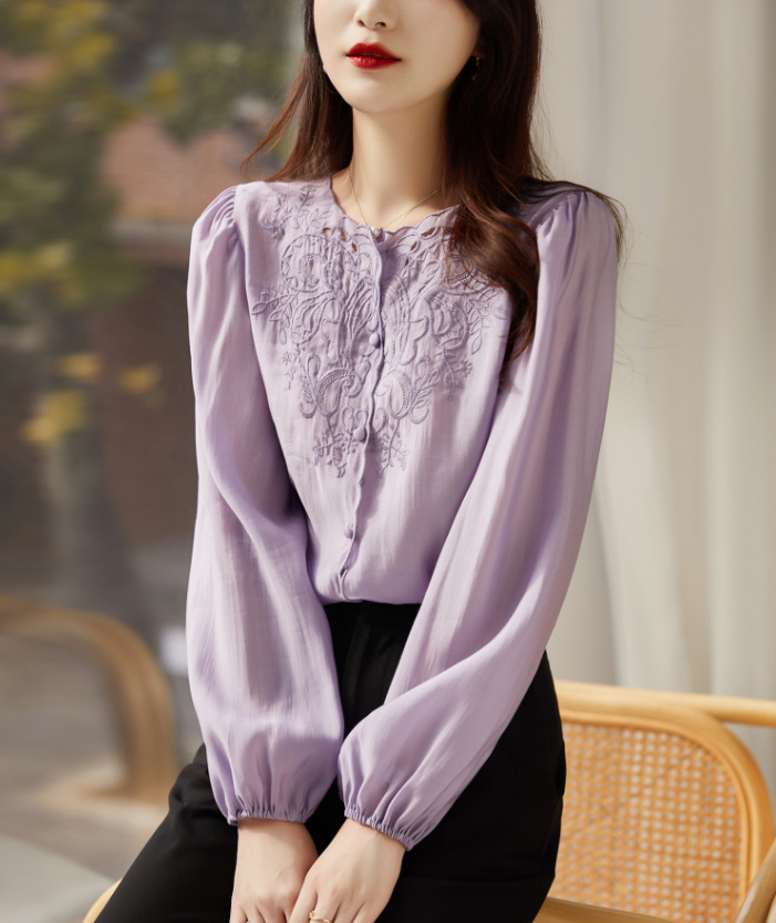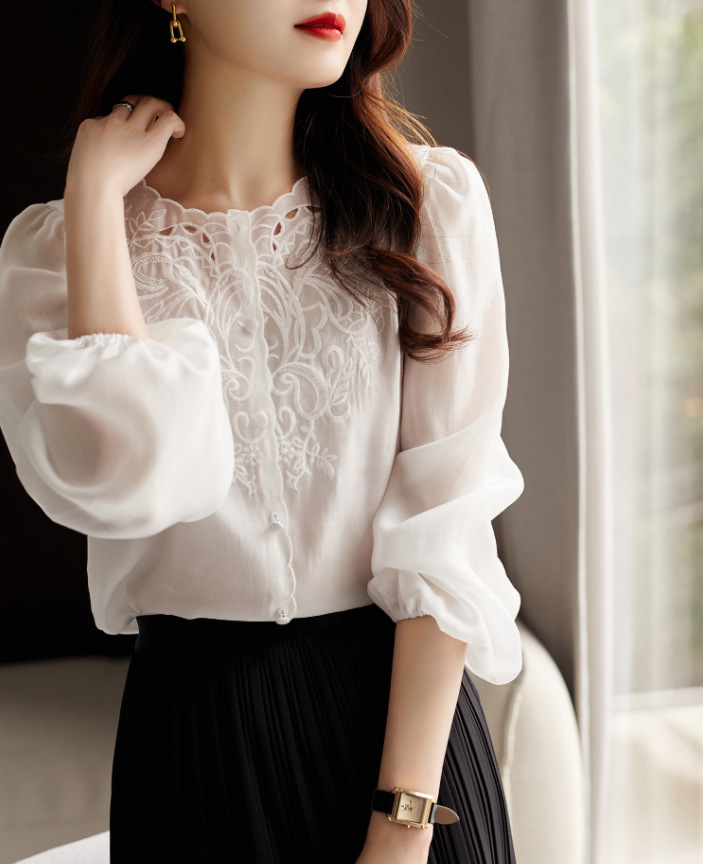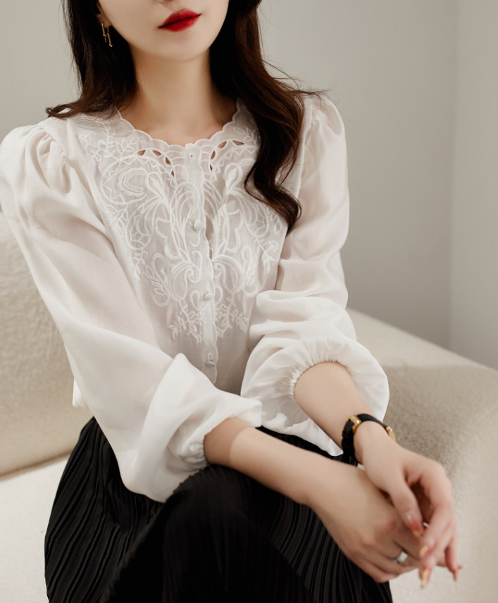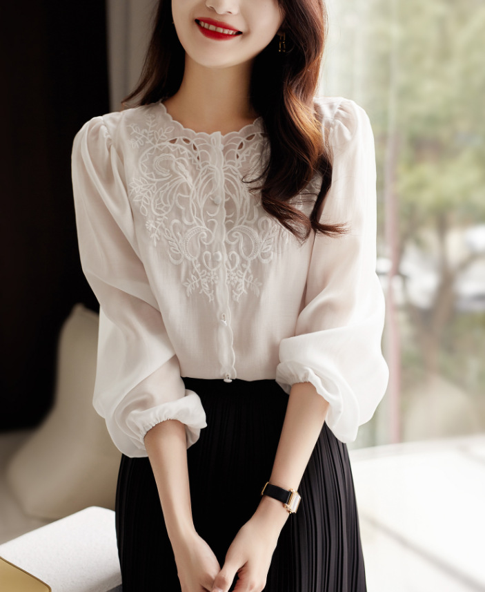 프랑스어 우아한 스타일 위치 자수 기질 라운드 넥 긴 소매 셔츠 랜턴 슬리브 작은 탑 태양 보호 셔츠 여성 봄, 여름