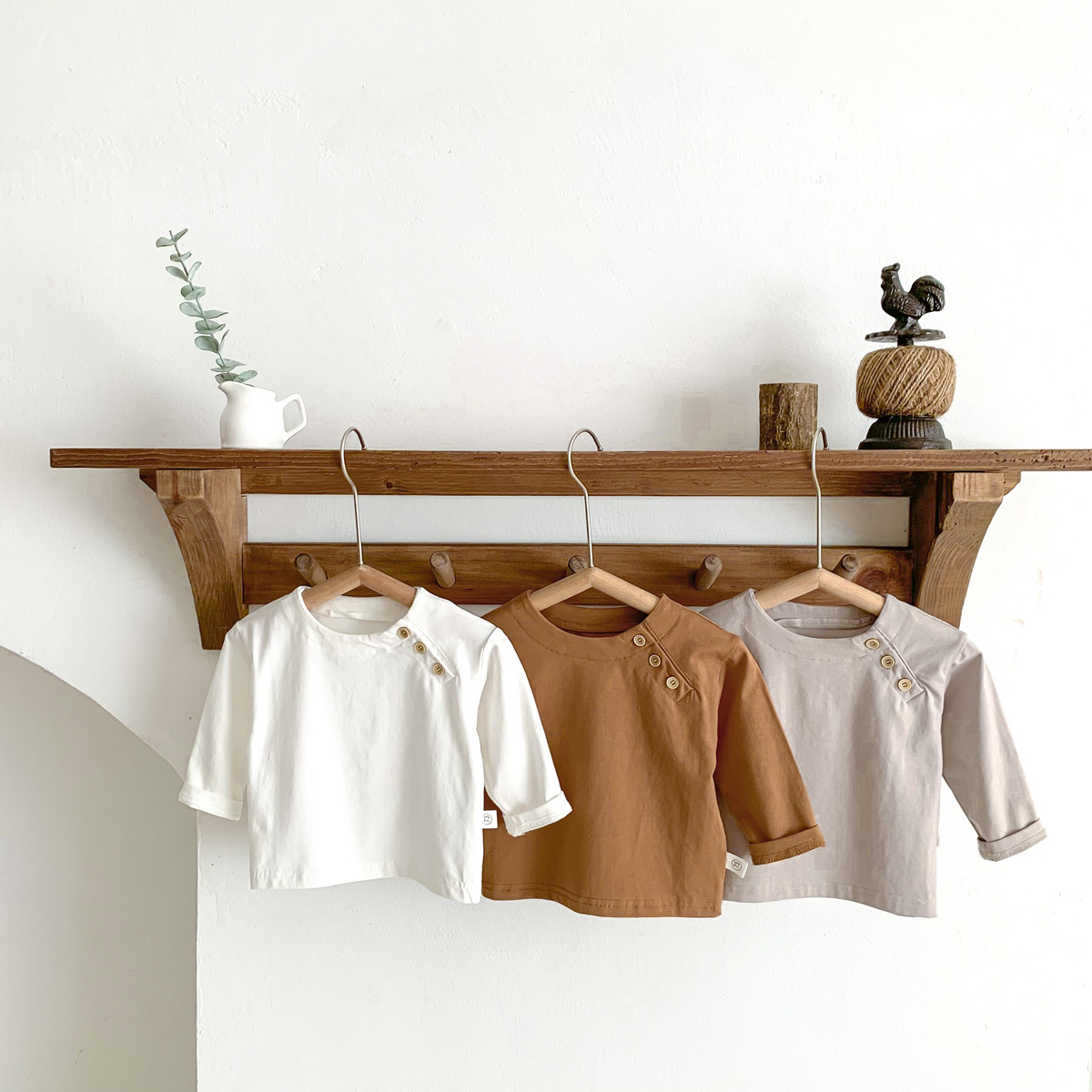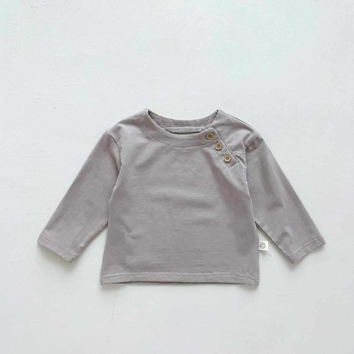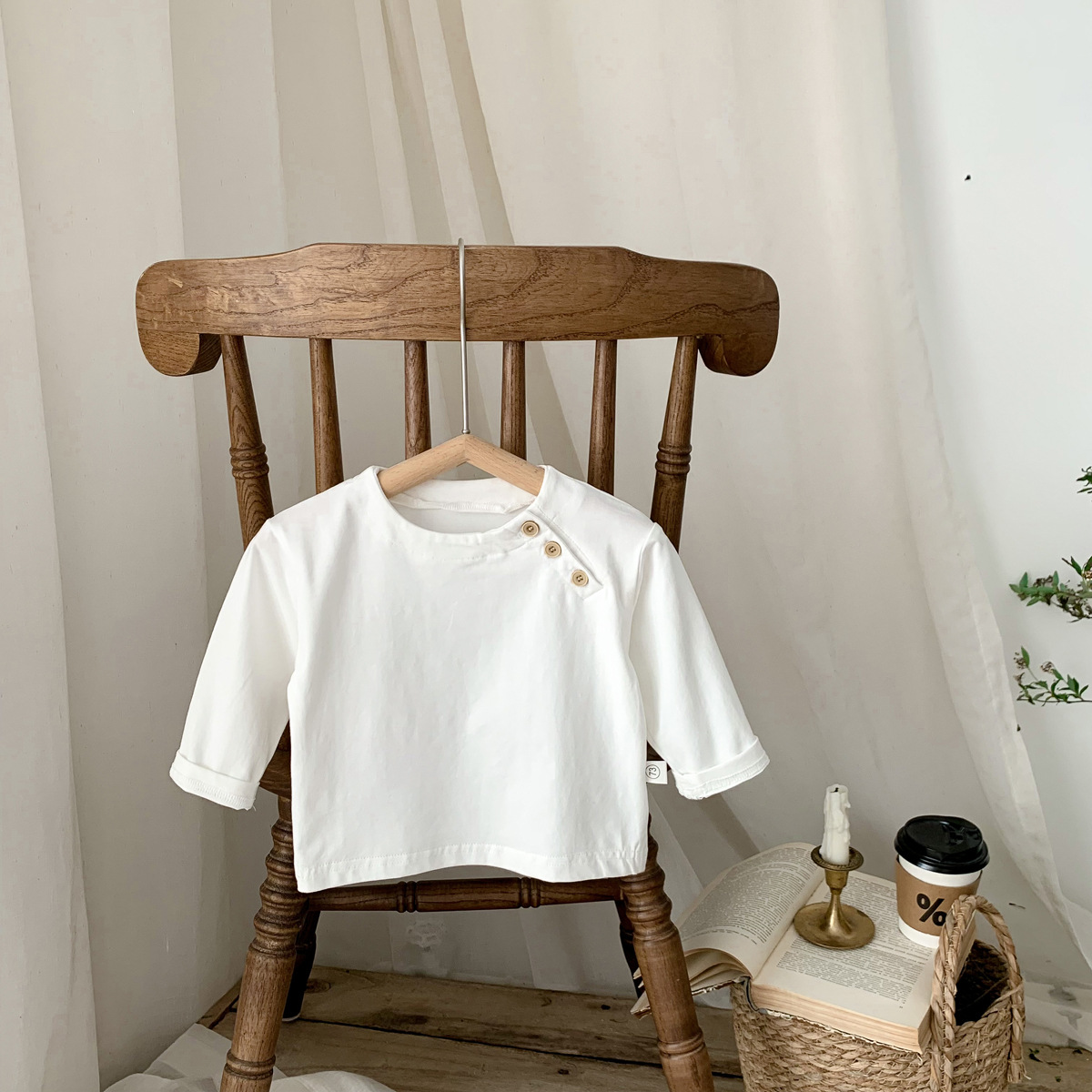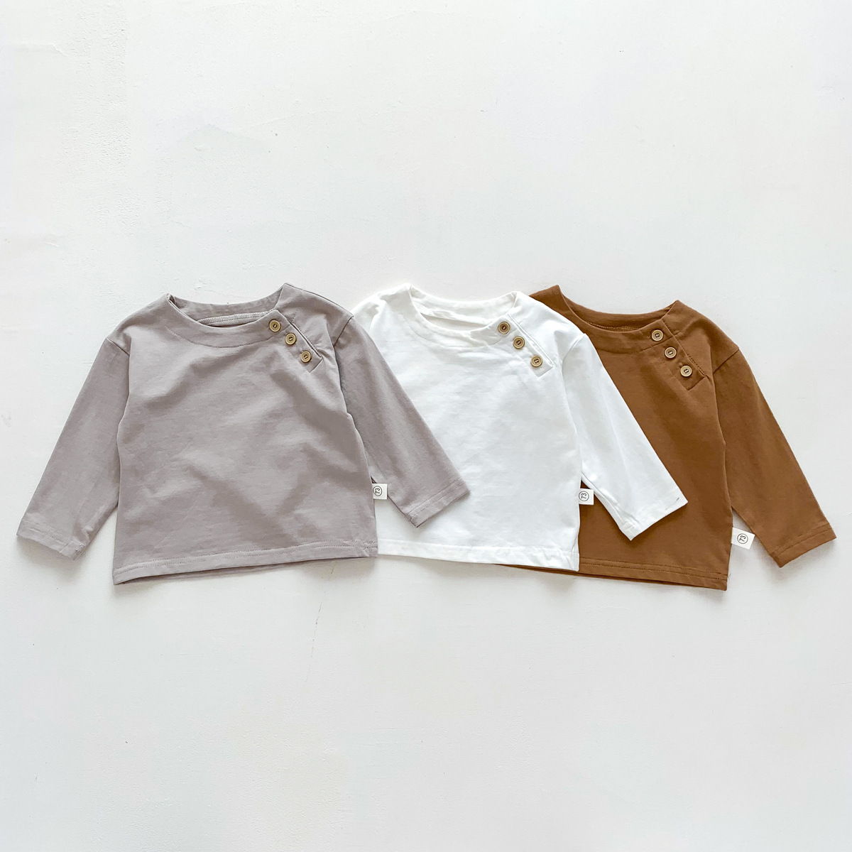 어린이용 신상품 단색 한국 스타일 아기 봄용 남녀공용 라운드넥 오픈숄더 버튼 티셔츠 베이직 아우터웨어