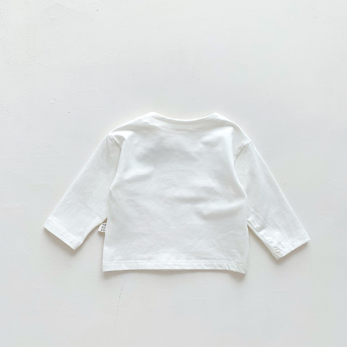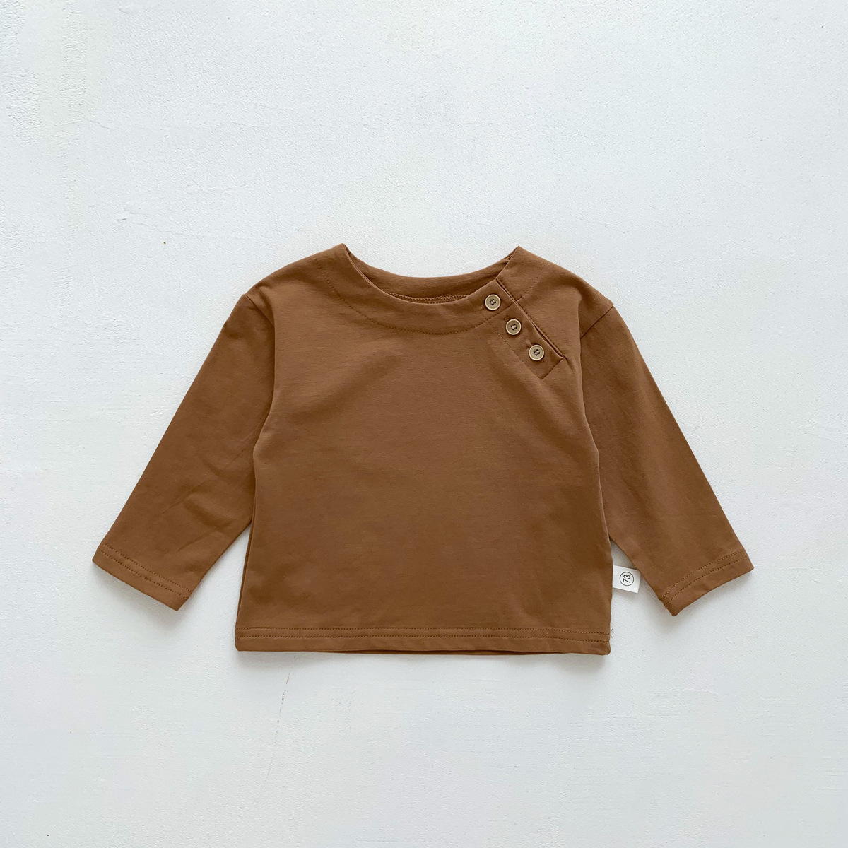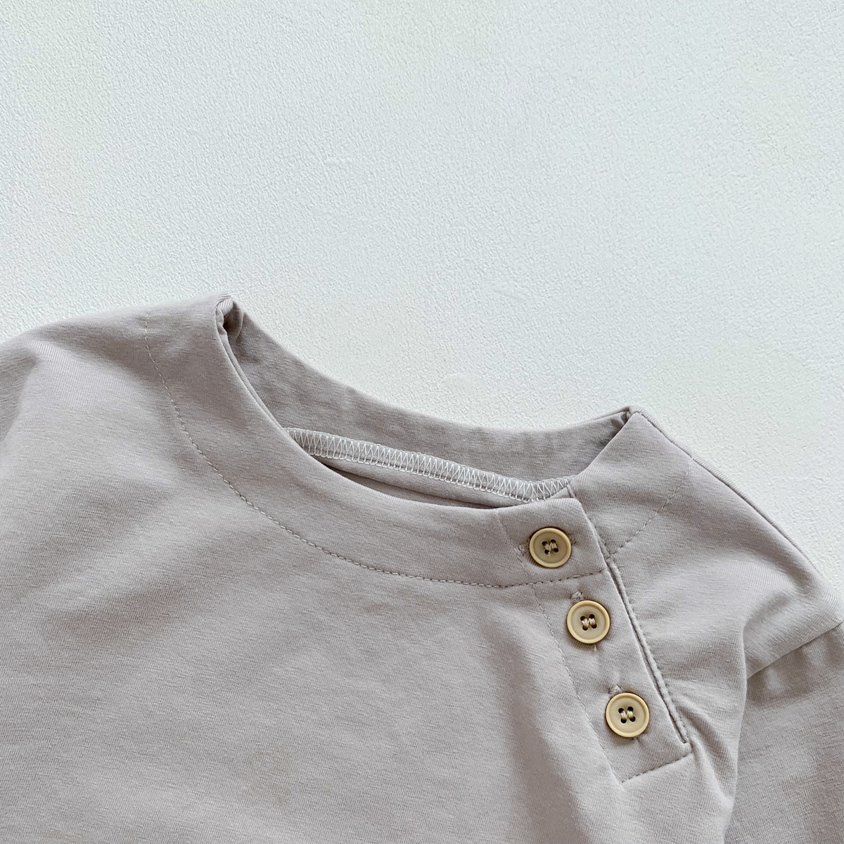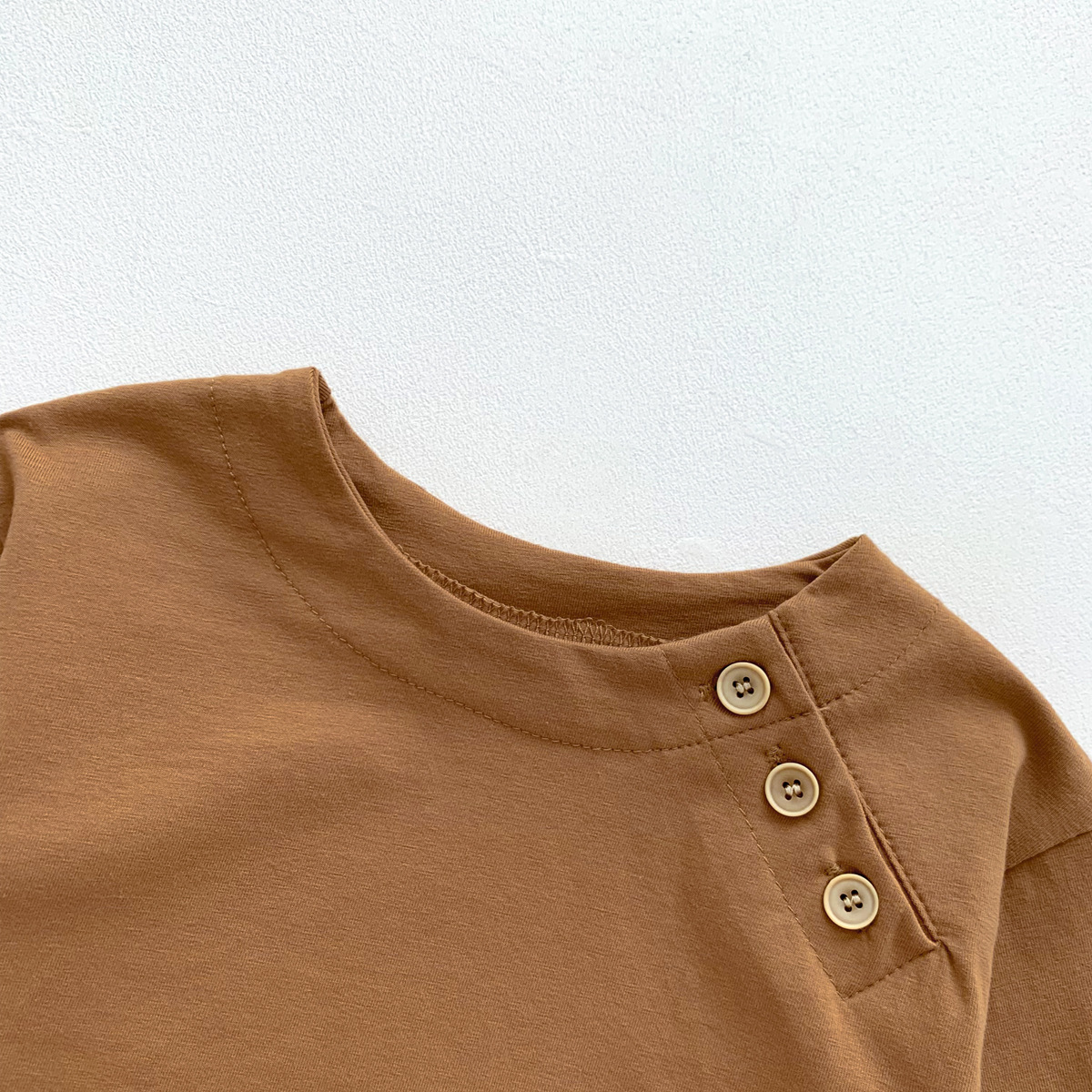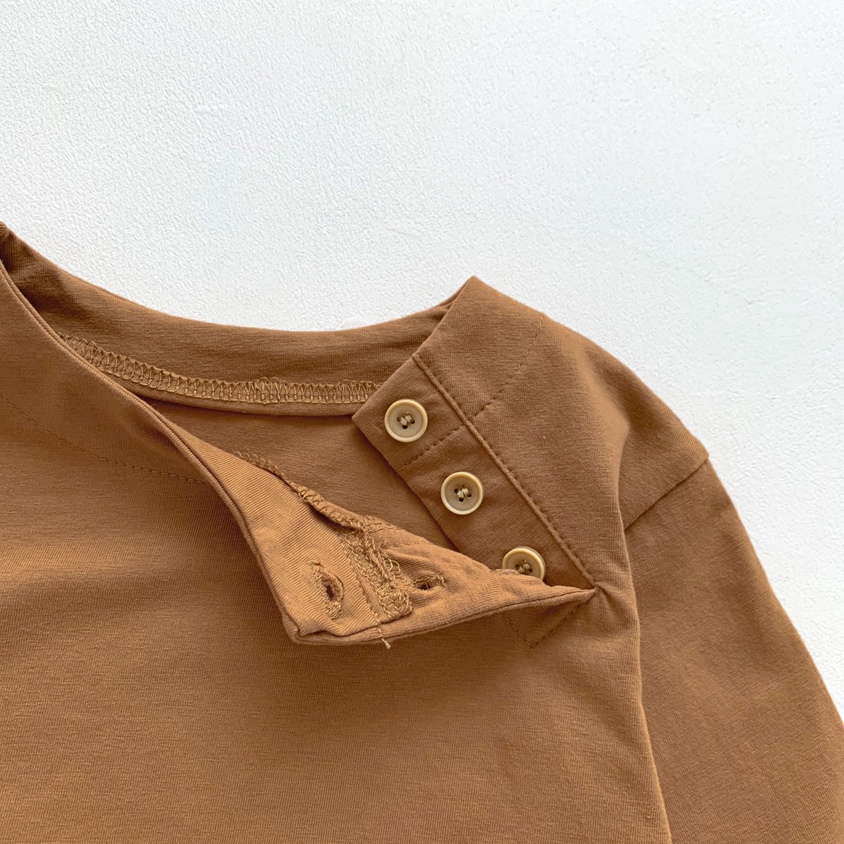 어린이용 신상품 단색 한국 스타일 아기 봄용 남녀공용 라운드넥 오픈숄더 버튼 티셔츠 베이직 아우터웨어