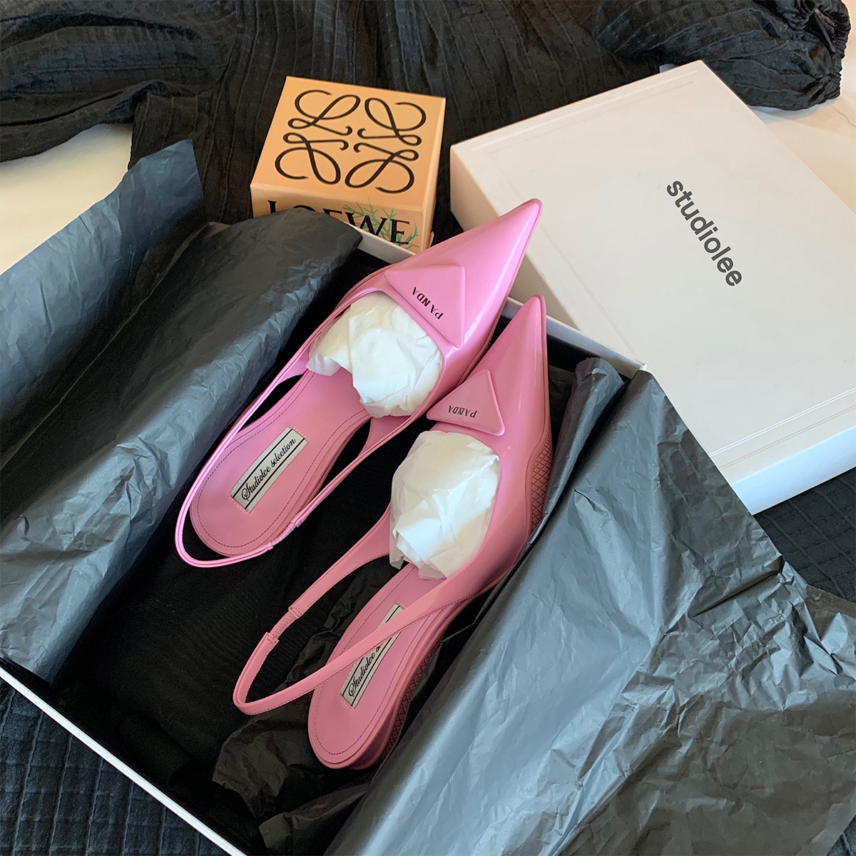 [재고] 삼각형 로고 뾰족한 샌들 여성 신발 가죽 고양이 발 뒤꿈치 뒤 빈 여행 하이힐의 세대스토어 가기