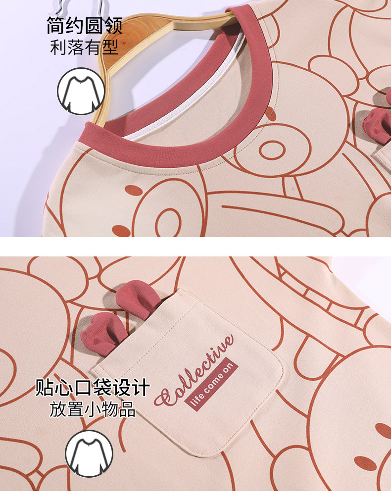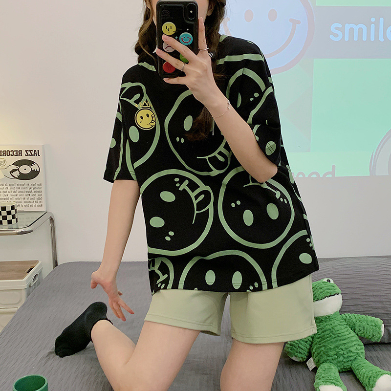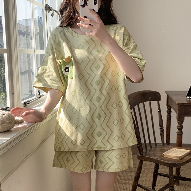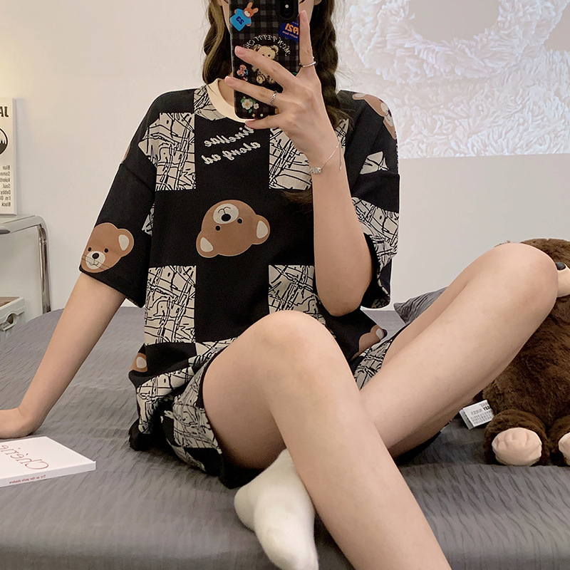 여성용 잠옷 반팔 여름 면세트 한국 스타일 학생복 달콤하고 귀여운 만화풍 루즈핏 큰 사이즈 홈웨어 시원한 느낌