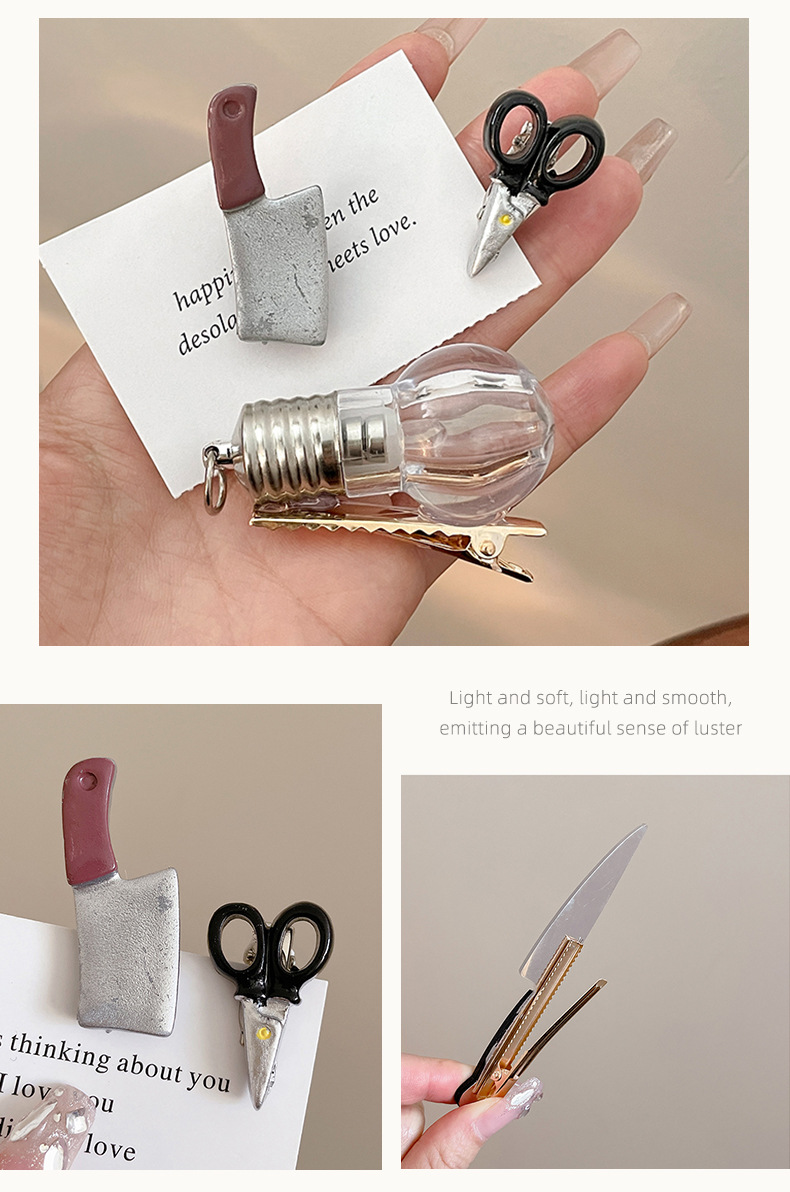 재미 있고 재미있는 시뮬레이션 가위 전구 작은 머리핀 머리 장식 여성용 사이드 프론트 프린지 헤어 클립 머리핀 헤어 액세서리