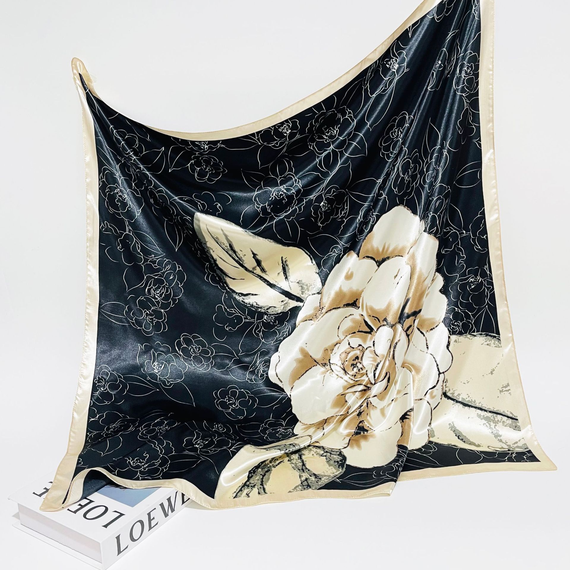 심플한 모든 매치 흑백 작은 향기로운 꽃 새틴 실크 스카프 크로스 보더 에스닉 스타일 헤드 스카프 90cm 여성용 대형 스퀘어 스카프