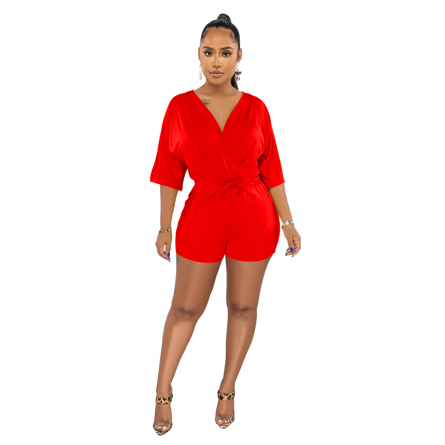 C6308 크로스 보더 AliExpress 아마존 유럽과 미국 패션 여성용 단색 레이스 업 V-넥 슬리브 반바지 점프 수트 여성스토어 가기