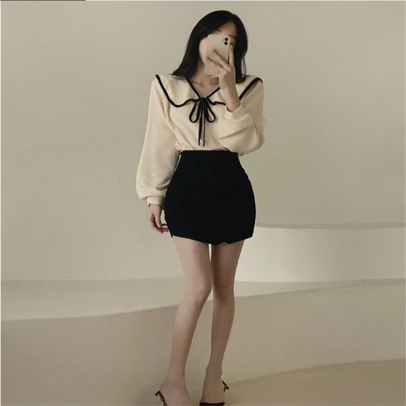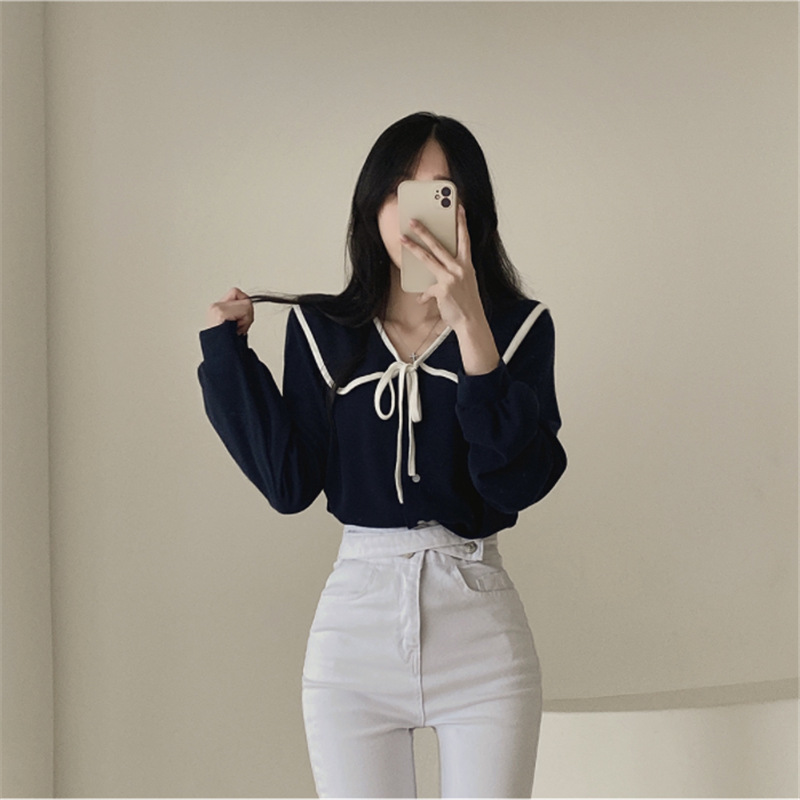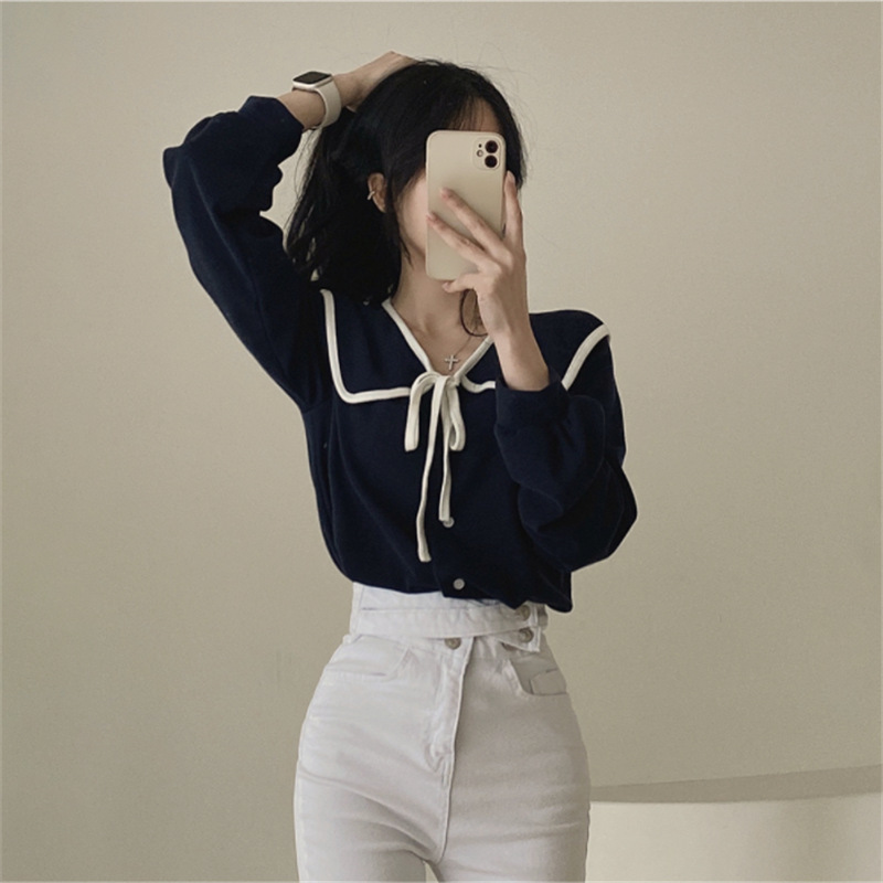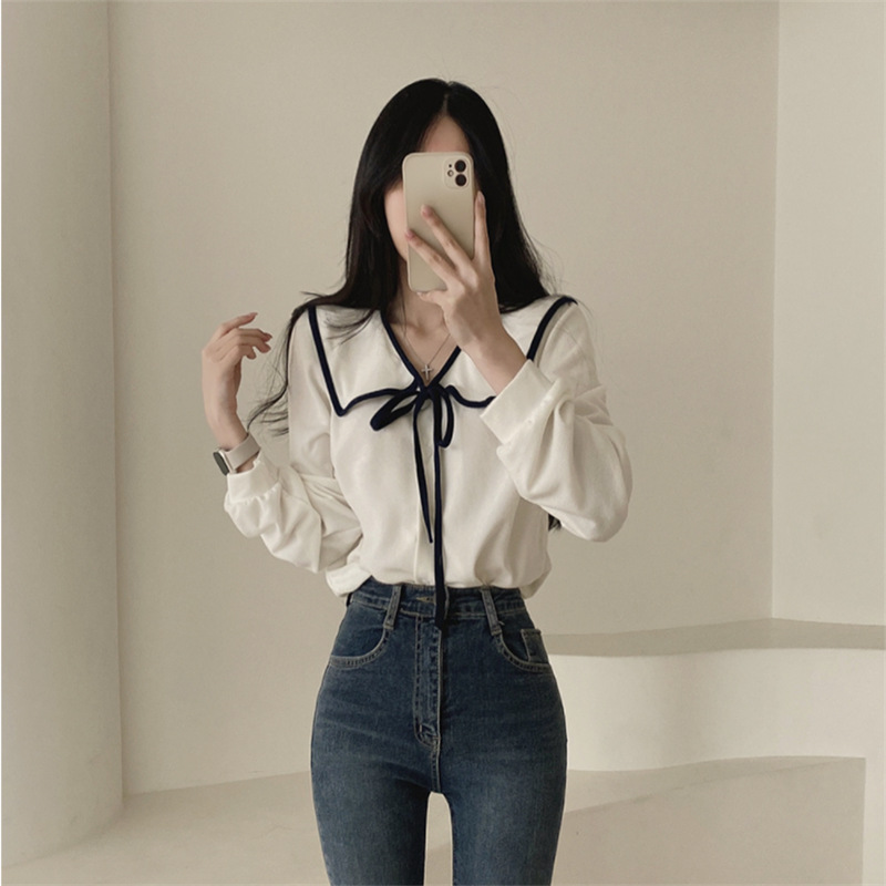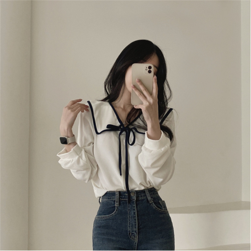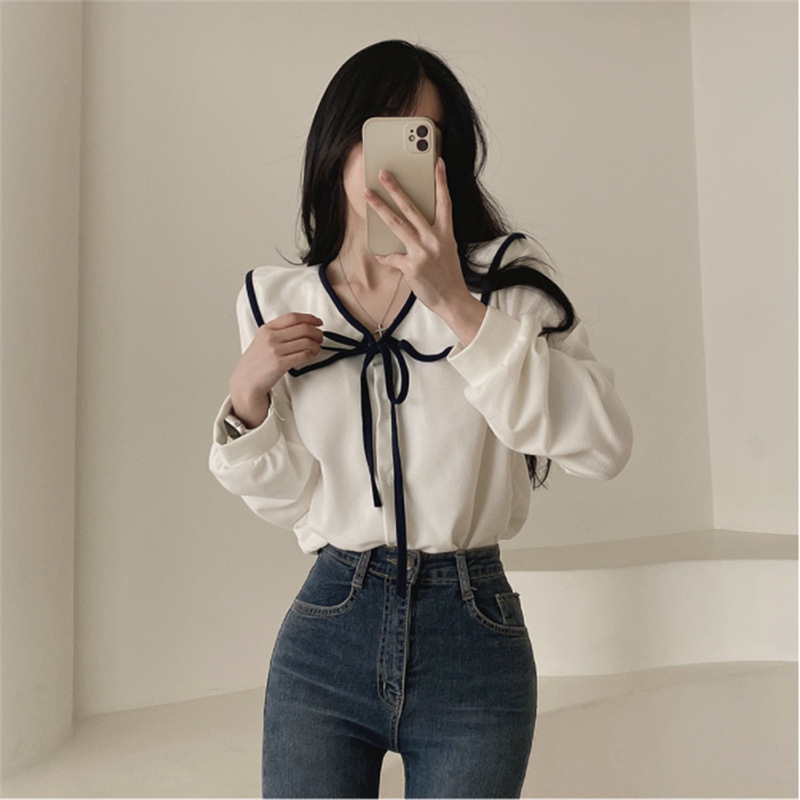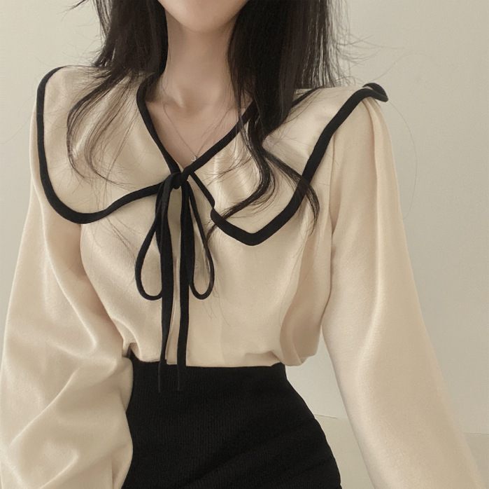 봄/여름 2024 새로운 인형 칼라 레이스 업 랜턴 소매 셔츠 여성의 내부와 외부 착용 단색 셔츠스토어 가기