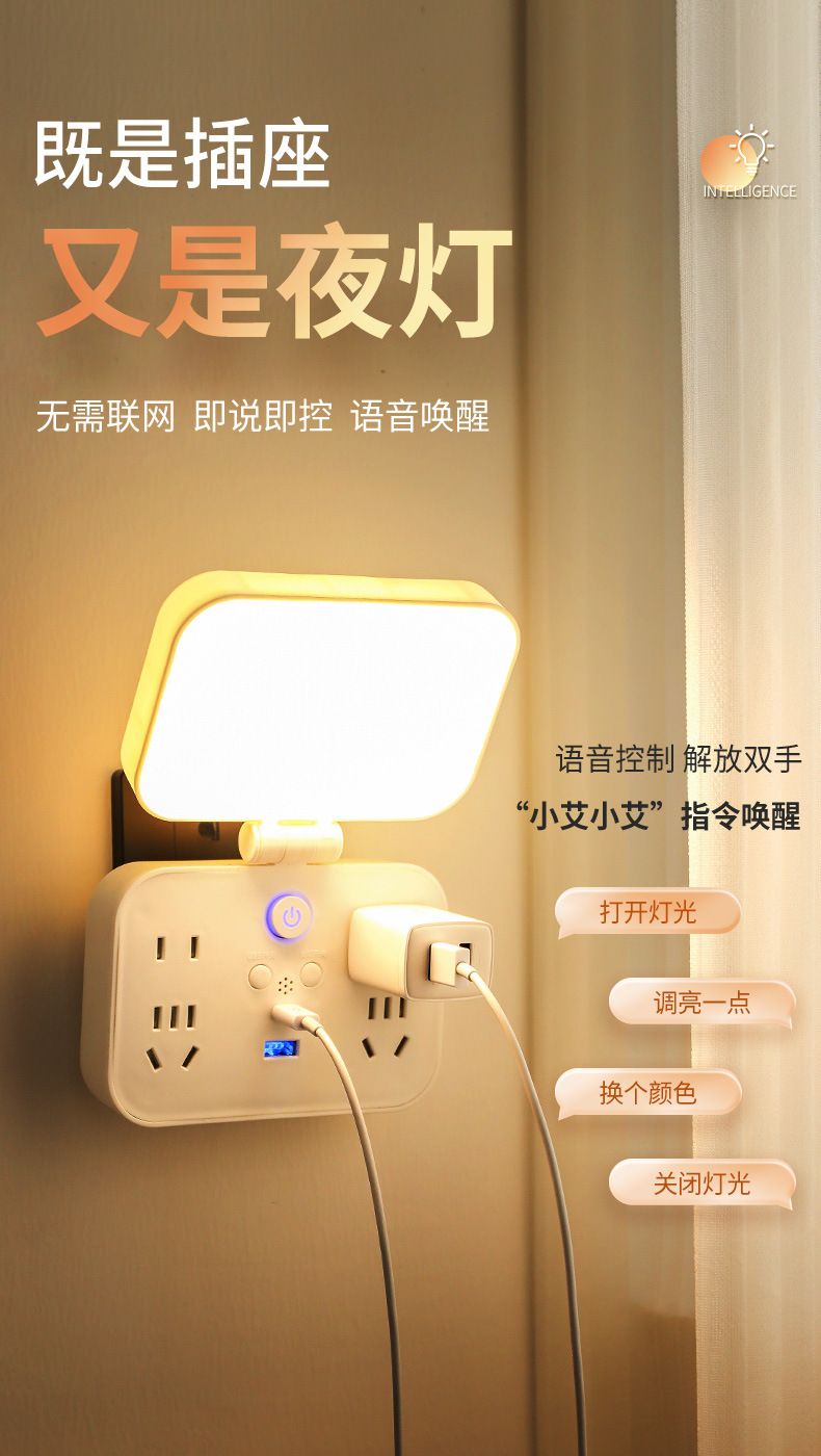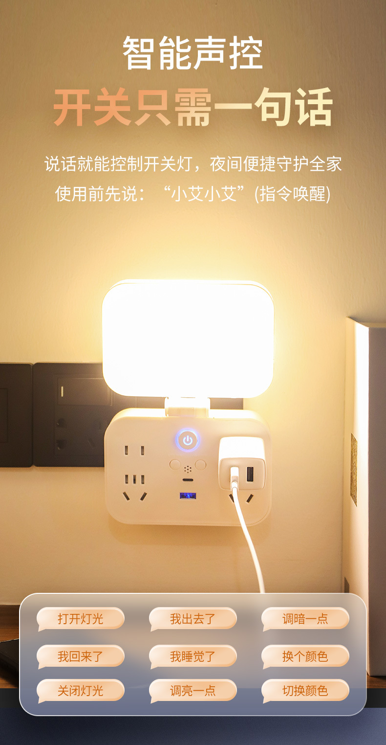 음성 제어 침대 옆 벽면 야간 조명, 음성 감지 센서 침실 테이블 램프, 선물용 플러그인 소켓 USB 기하학 조명, 스마트스토어 가기