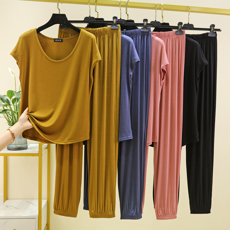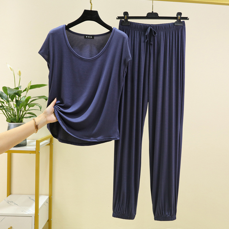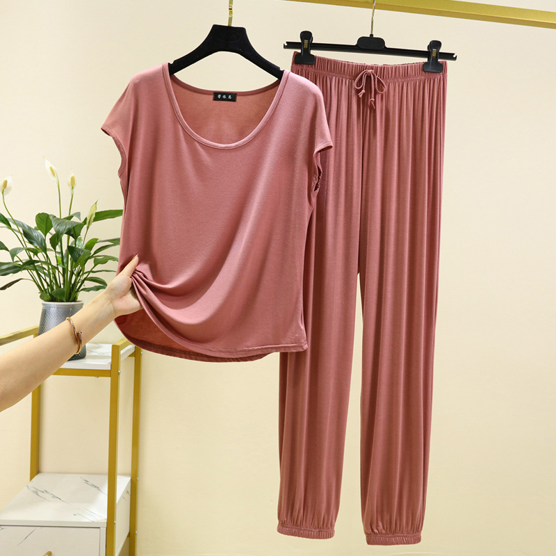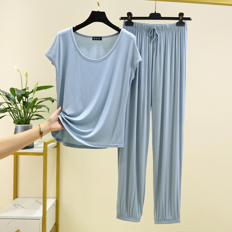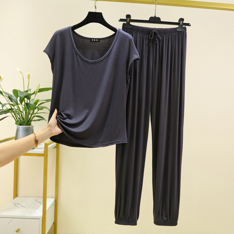 여름 잠옷 세트 여자의 여름 모달 얇은 민소매 티셔츠 바지 간단한 캐주얼 아웃웨어 가정 의류