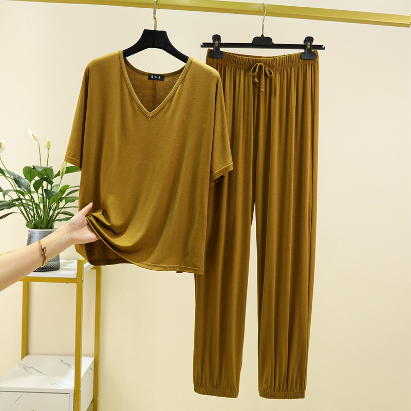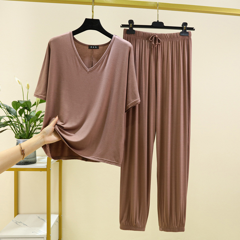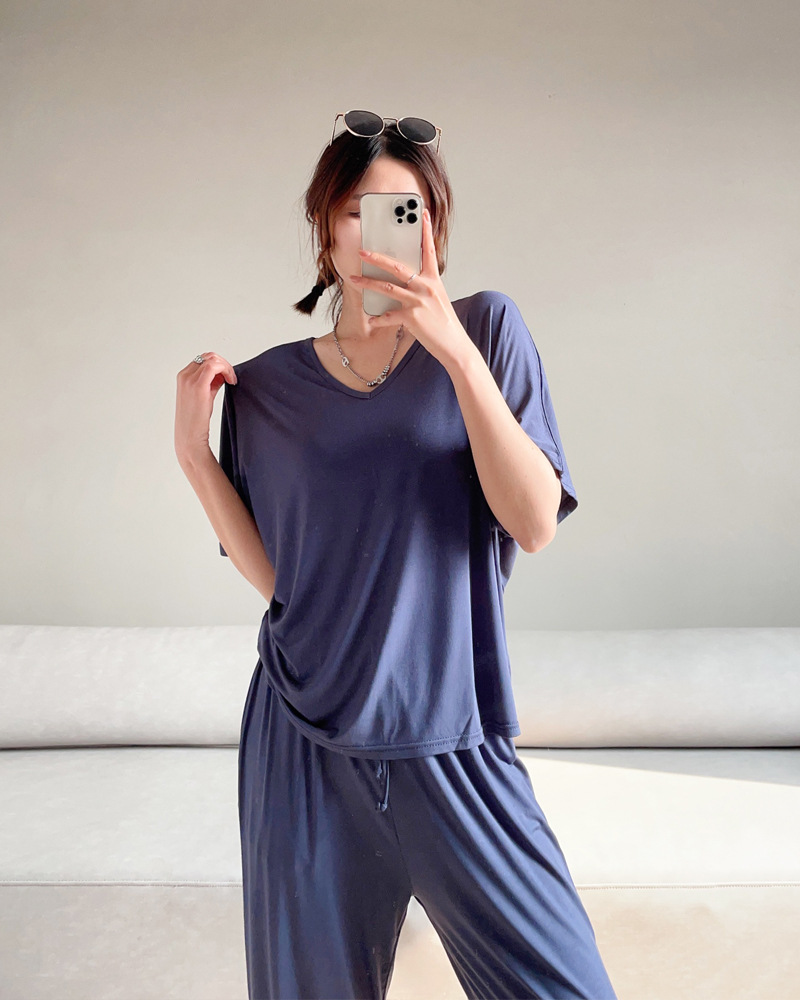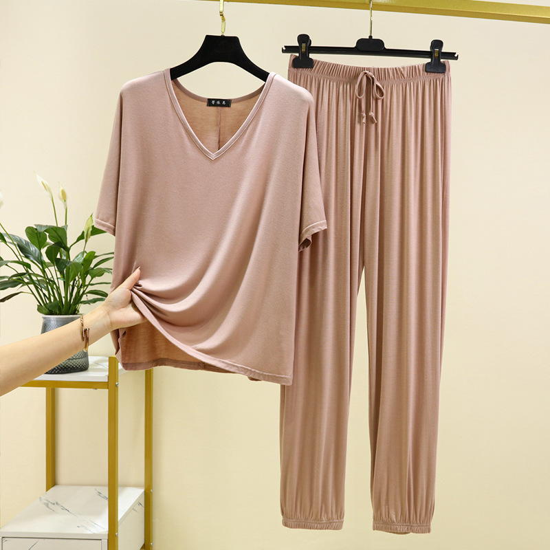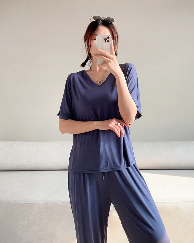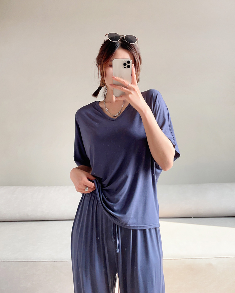 모달 얇은 잠옷 여자의 봄과 여름 2023 새로운 V-넥 반팔 바지 느슨한 가정 옷 세트 겉옷
