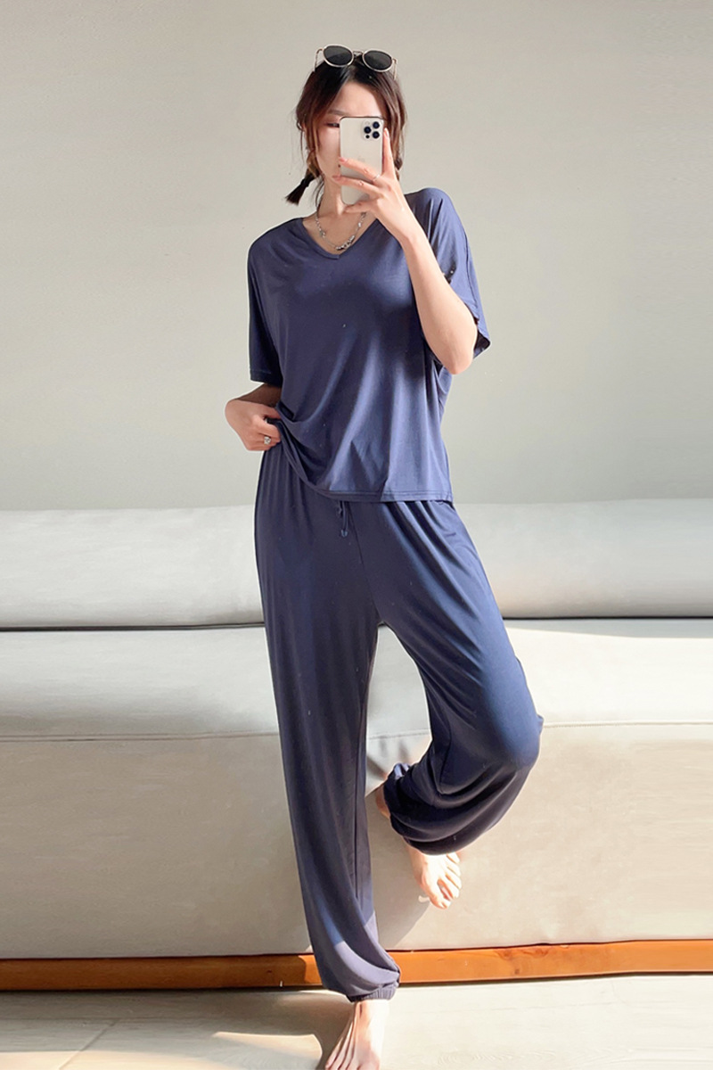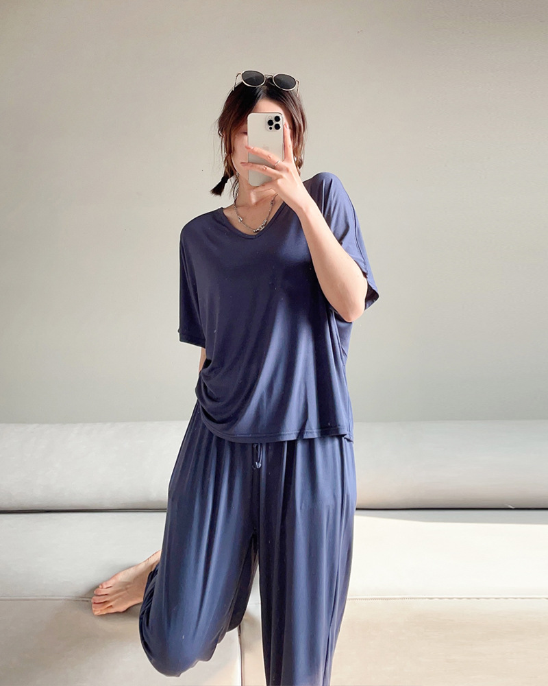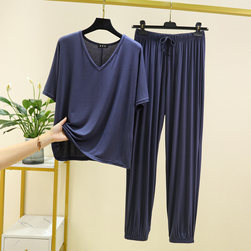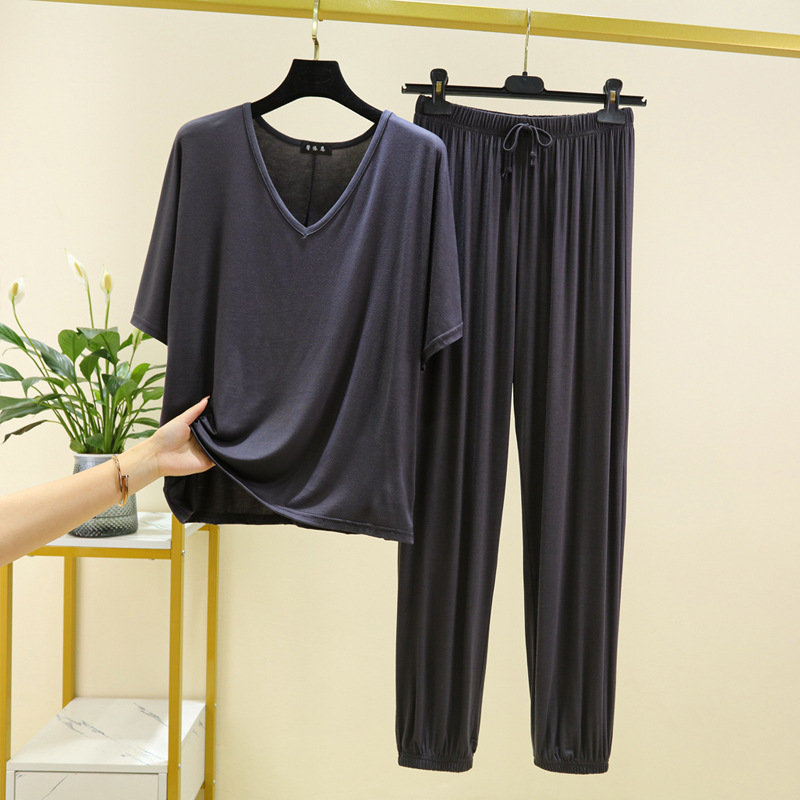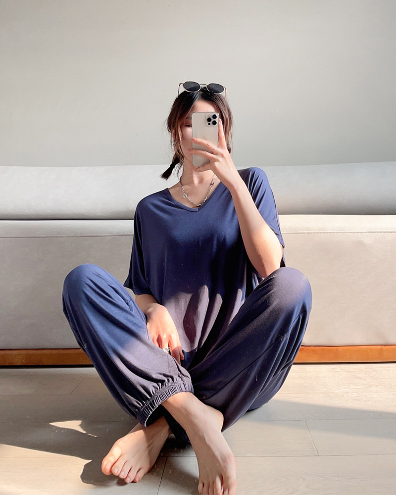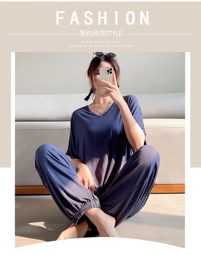 모달 얇은 잠옷 여자의 봄과 여름 2023 새로운 V-넥 반팔 바지 느슨한 가정 옷 세트 겉옷