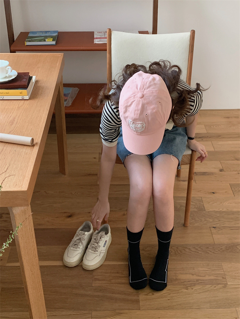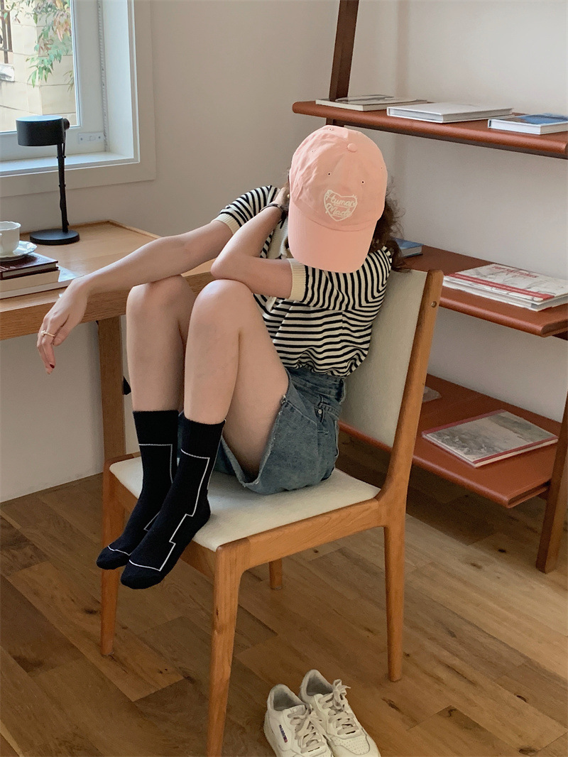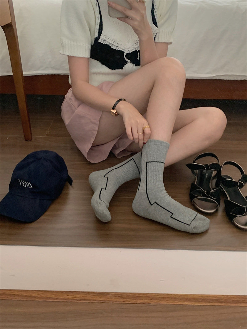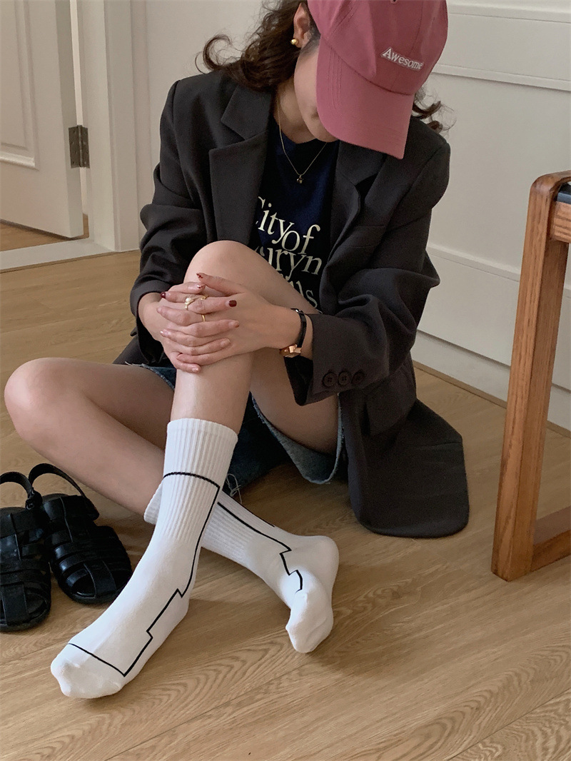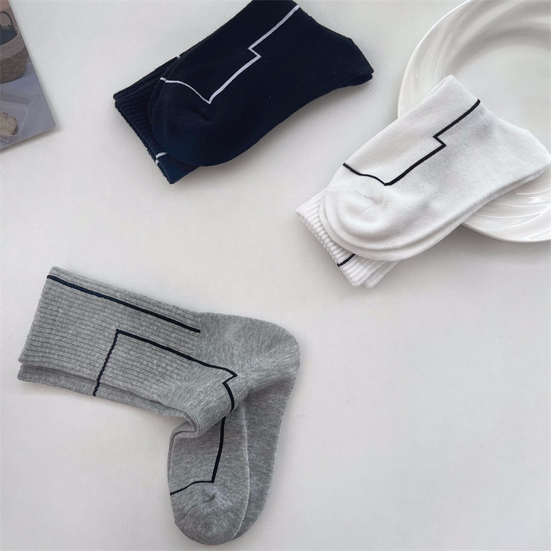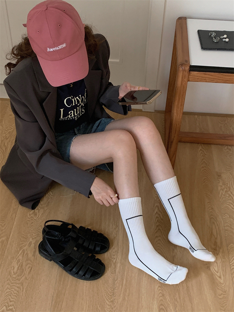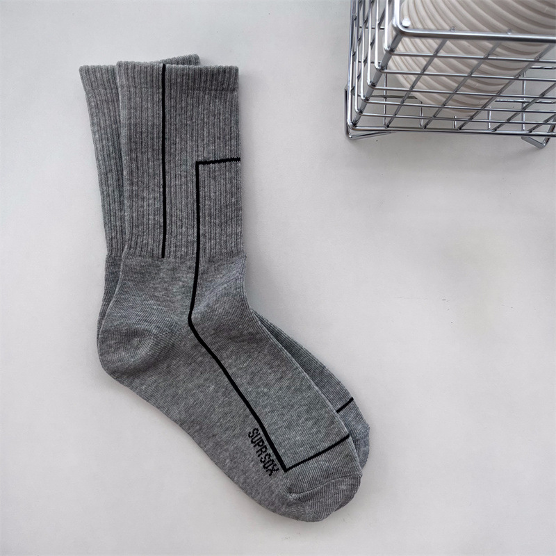 여름 간단한 세로 줄무늬 높은 고무 밴드 질감 중간 튜브 스포츠 남성용 양말 여성용 화이트 라인 기하학적 유행 양말스토어 가기