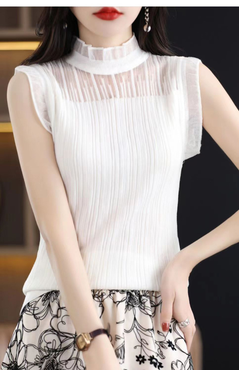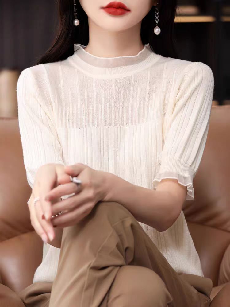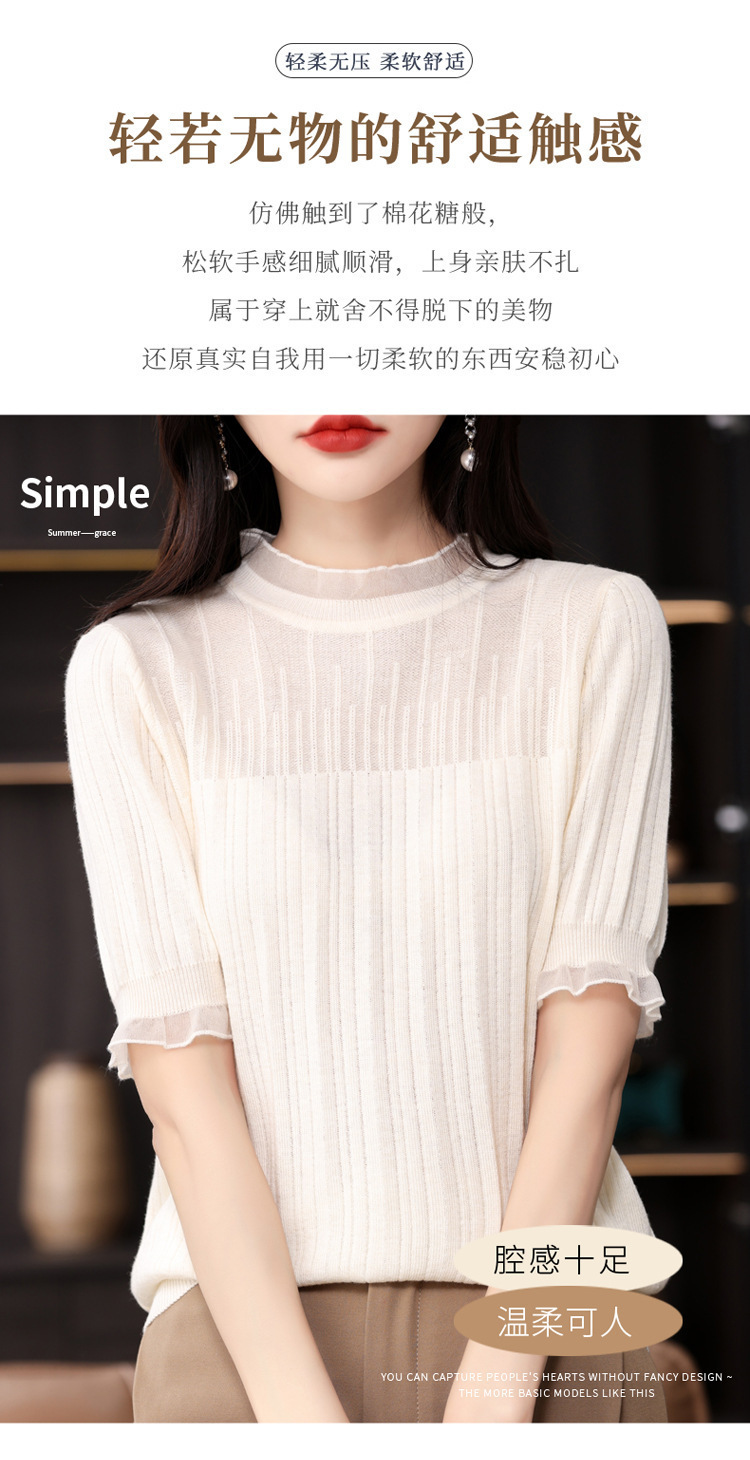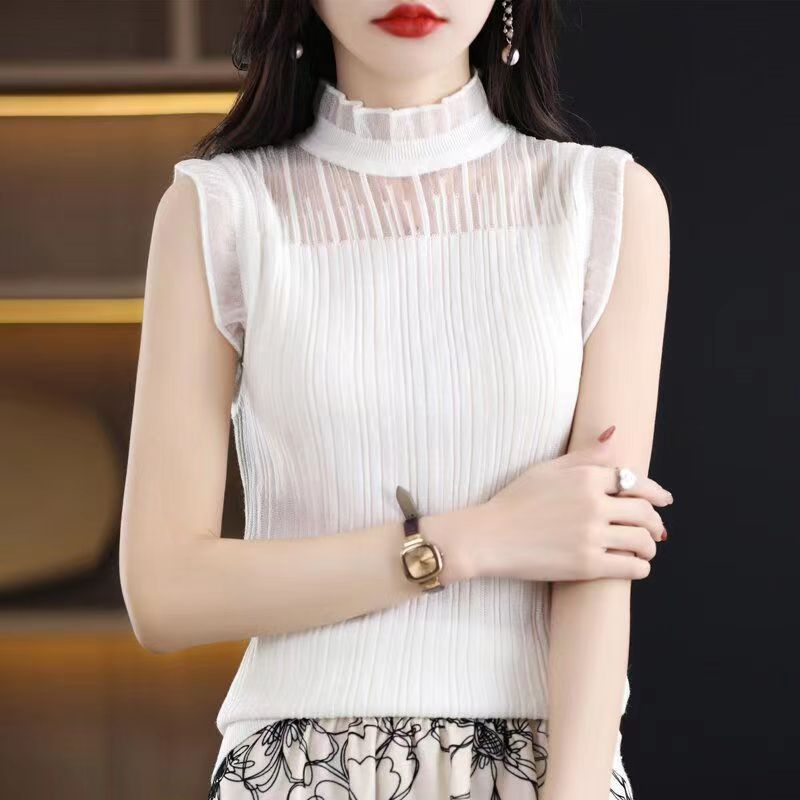 고급 모조 6 울 새로운 레이스 에지 쉬폰 셔츠 여성용 세련된 연령 감소 반팔 내부 에어컨 조끼 티셔츠 베이스 셔츠