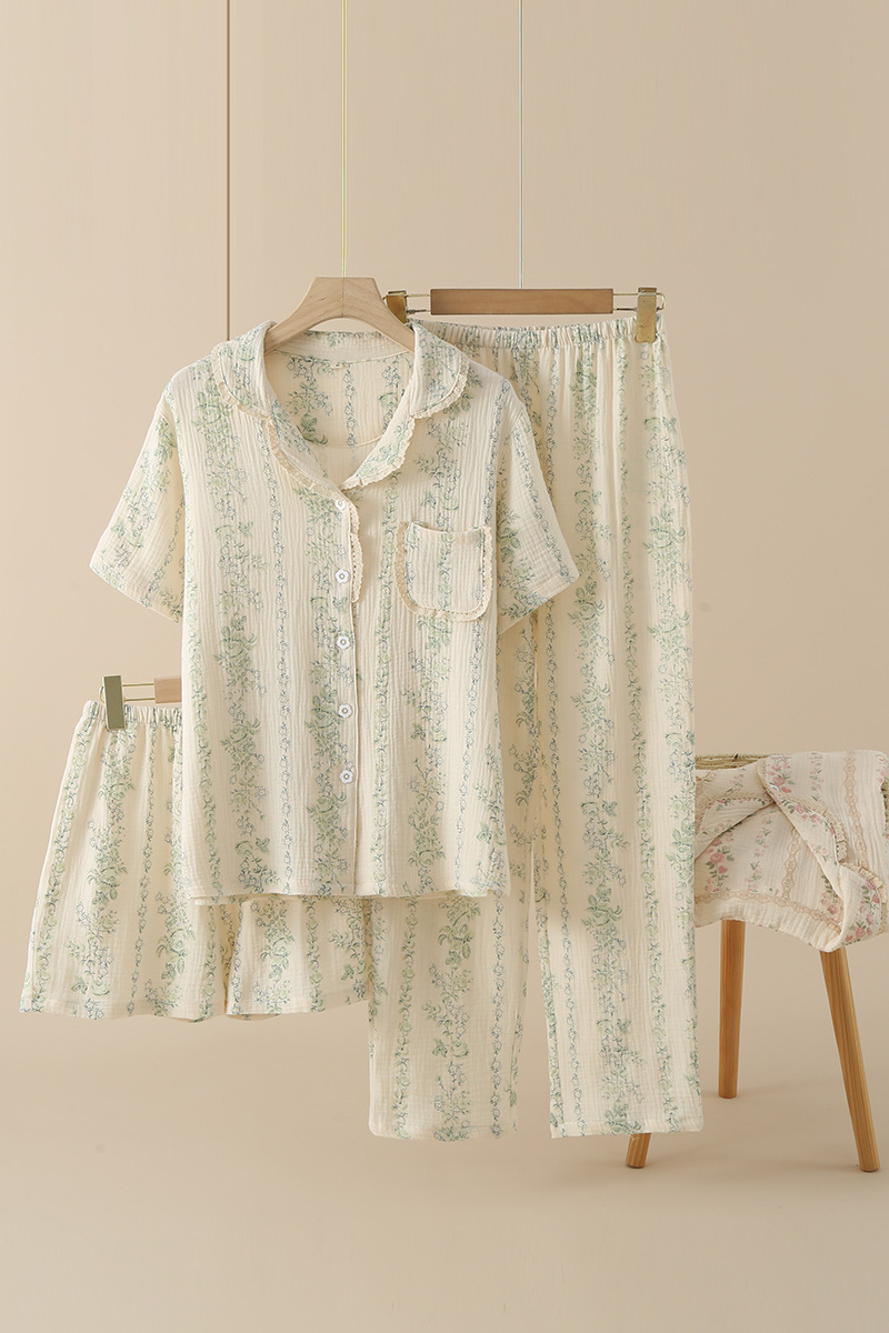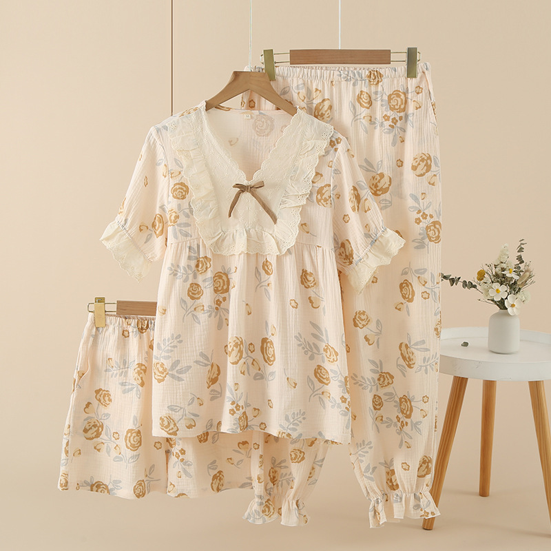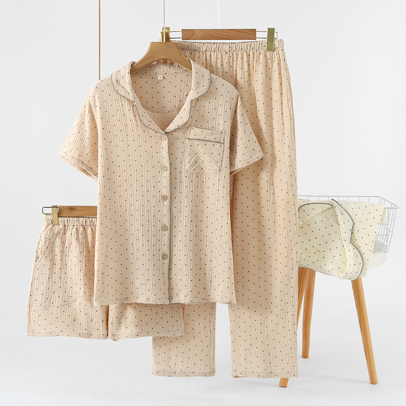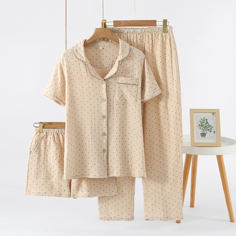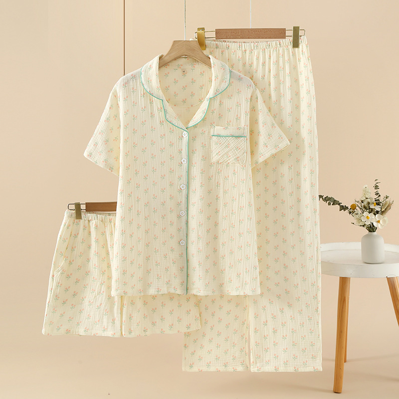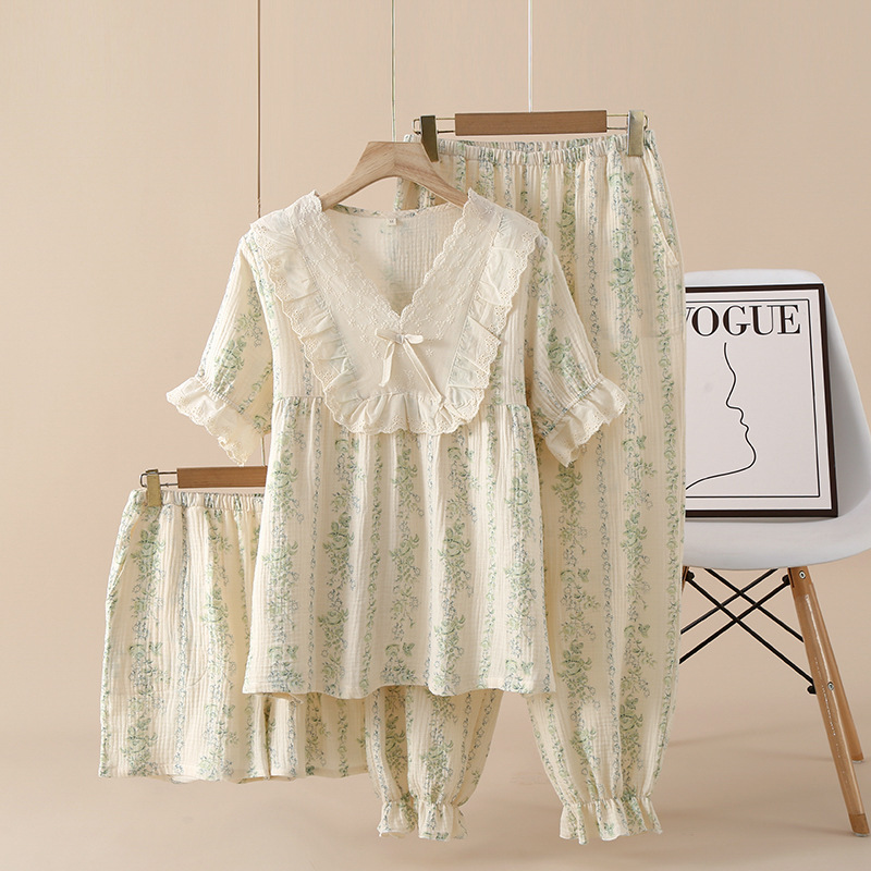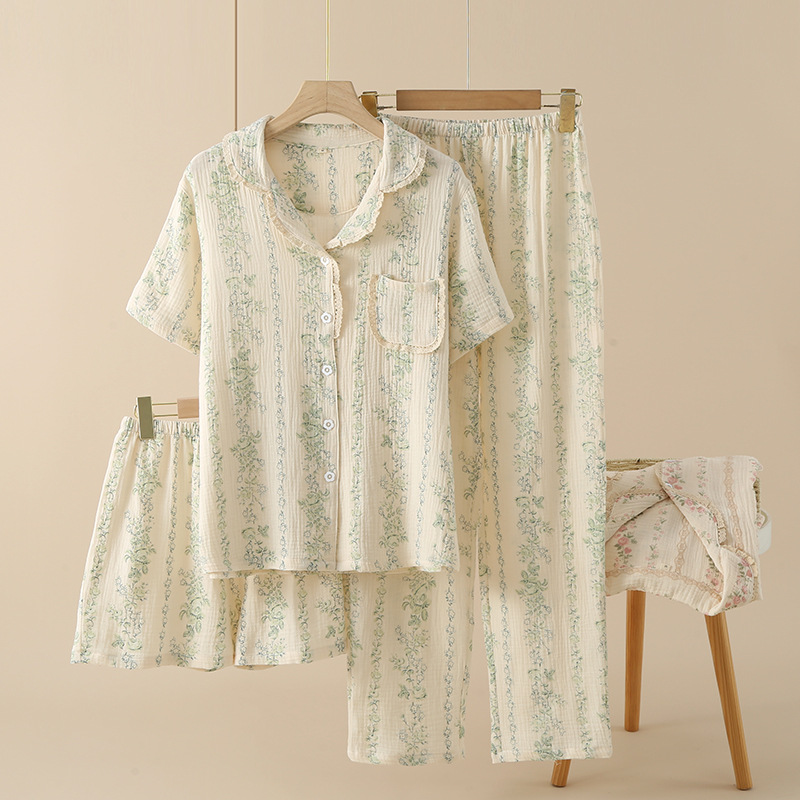 여성용 크레페 코튼 원사 반바지 3 종 세트 봄 여름 가을 얇은 국경 면 파자마 홈 의류스토어 가기