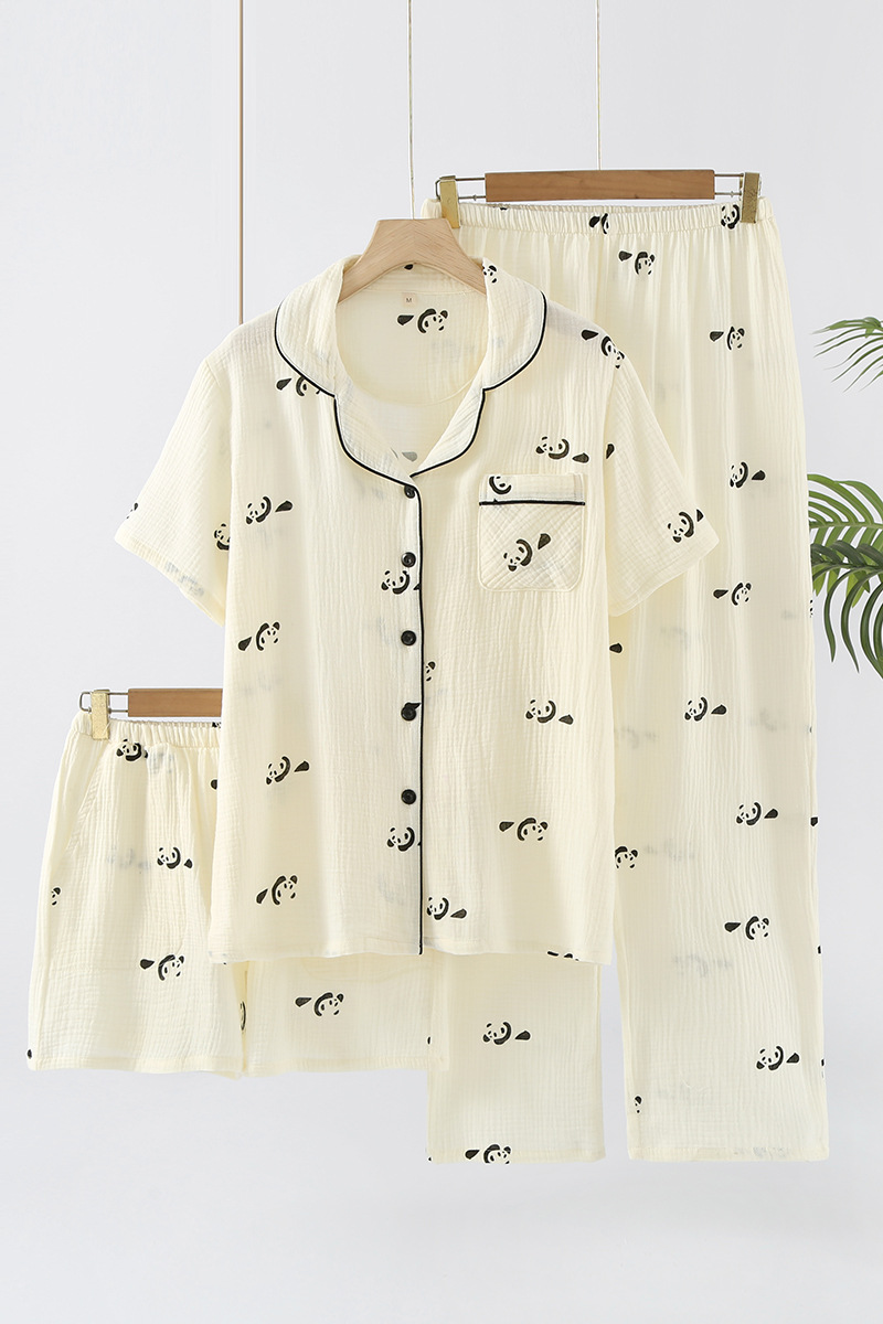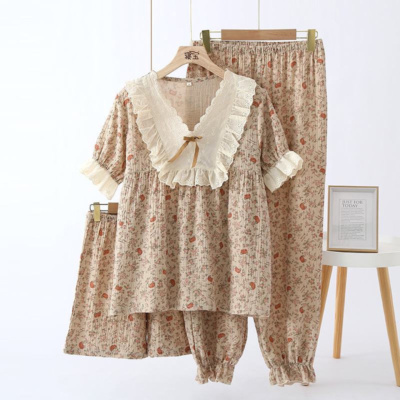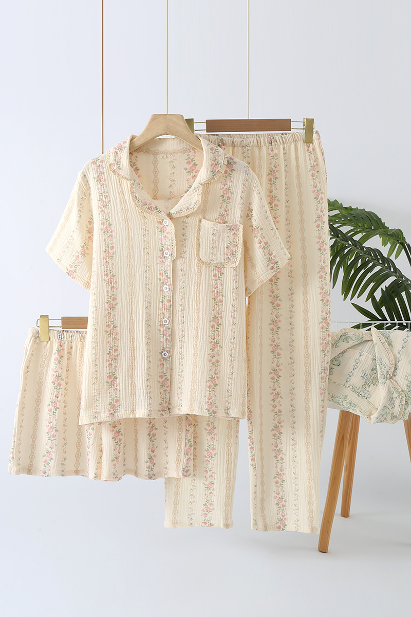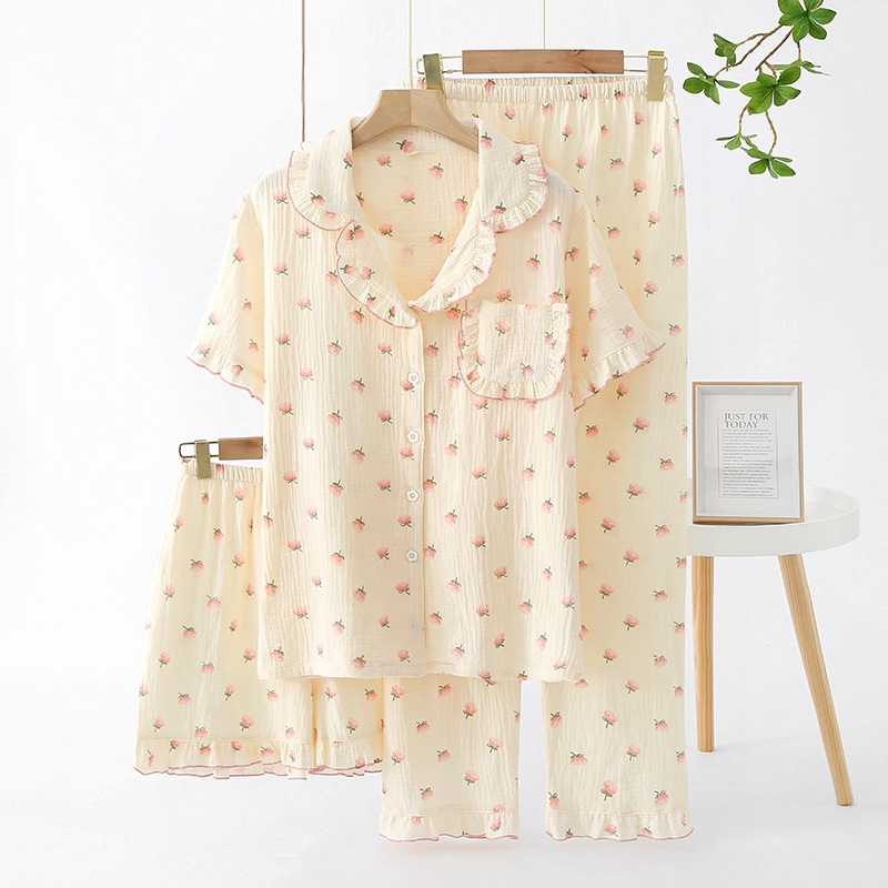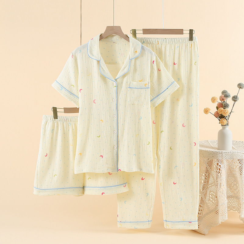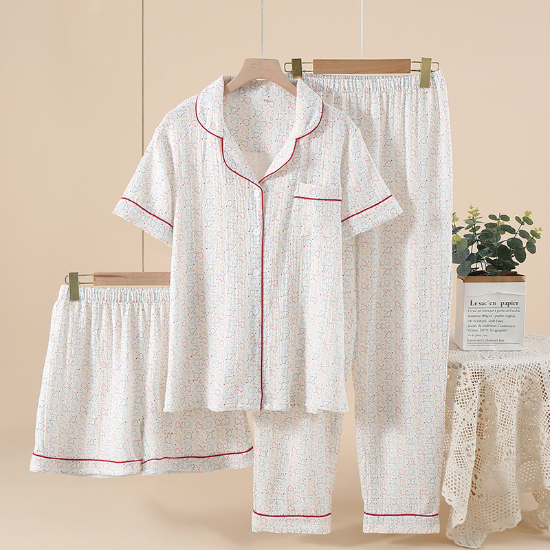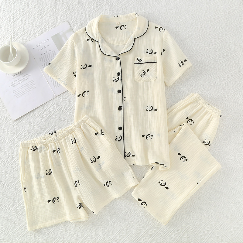 여성용 크레페 코튼 원사 반바지 3 종 세트 봄 여름 가을 얇은 국경 면 파자마 홈 의류스토어 가기