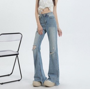 爆款破洞牛仔裤女春夏高腰显瘦毛边破洞喇叭裤女春拖地裤薄款乞丐