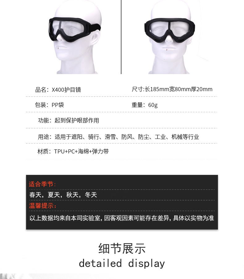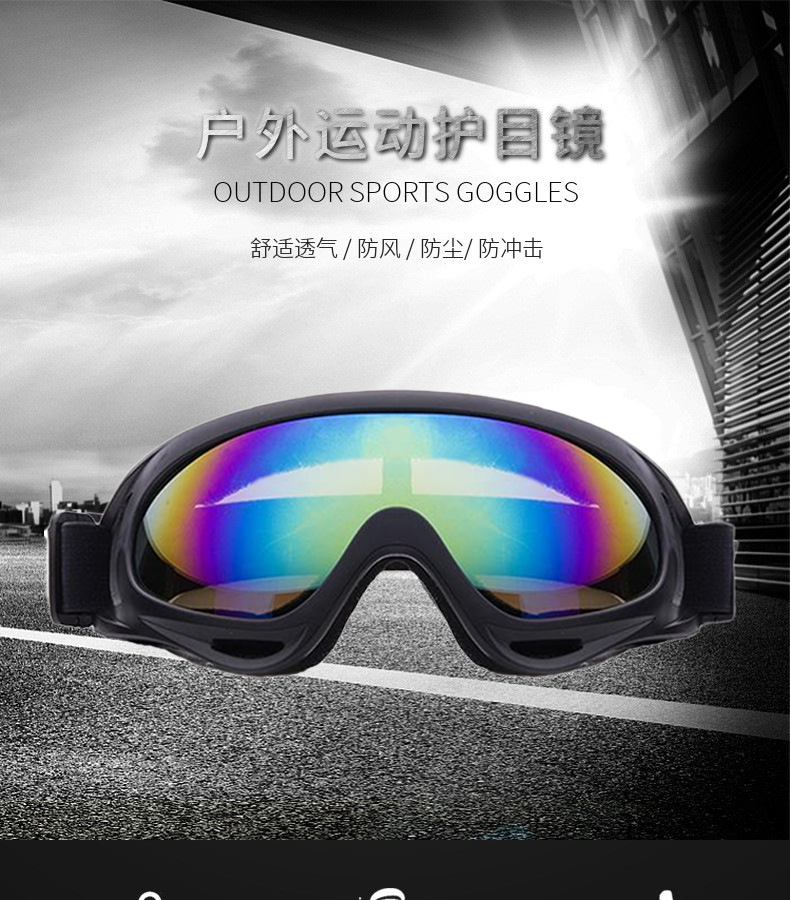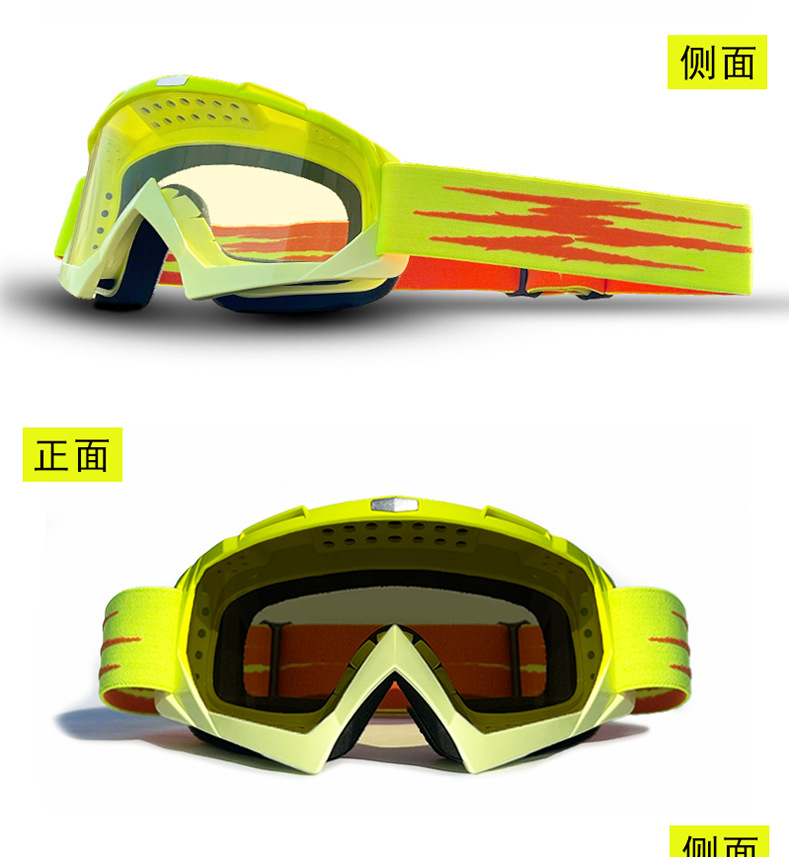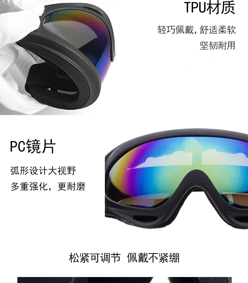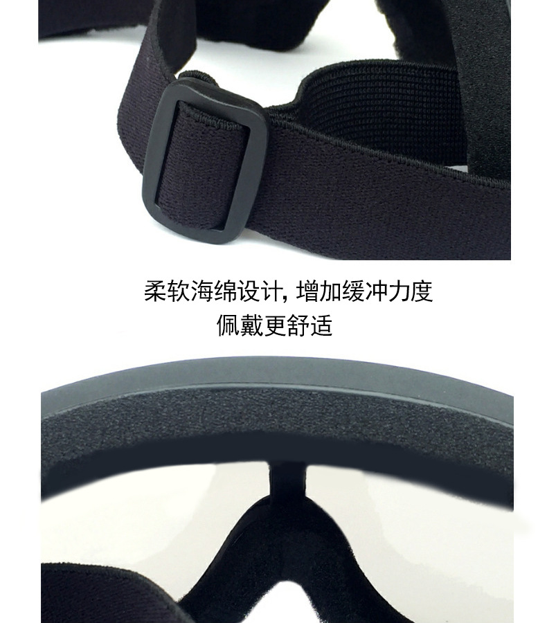 产品卖点:炫酷外观,高清大视野,内部可卡近视眼镜;可适应越野,骑行等场景;内置柔软海绵透气舒适;PC材质镜片更耐摩擦抗冲击,防风沙;