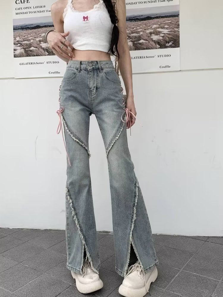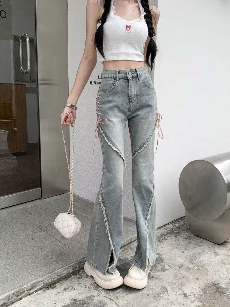 2023 새로운 청바지 여성의 봄과 여름 빈티지 스파이스 걸 틈새 디자인 불규칙한 슬릿 마이크로 혼 롱 팬츠스토어 가기