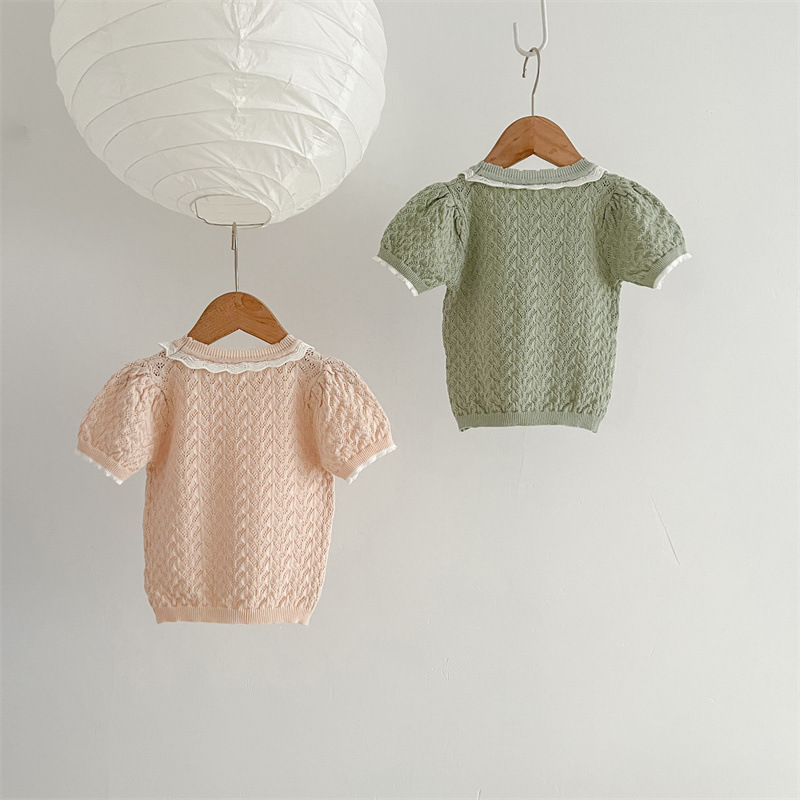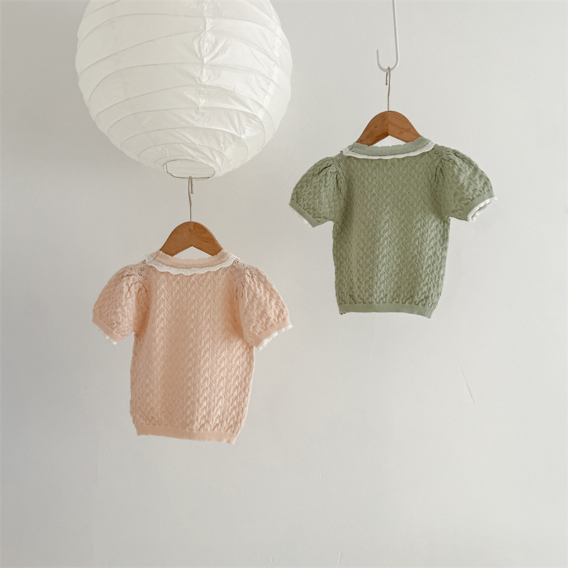 2024 여름 아기 소녀 니트 티셔츠 일본과 한국 스타일 단순 중공 부드러운 밀랍 반팔 레이스 라운드 넥 탑 유행스토어 가기